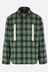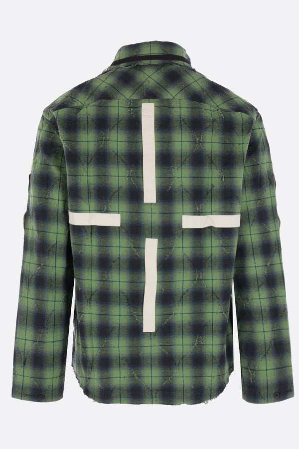 Craig Green shirt crafted from green and blue check cotton flannel with frayed edges. Featuring a classic collar with contrast trim, front button closure, long sleeves with buttoned cuffs, and a curved hem. The design is completed by cut-out details with contrast edges.