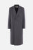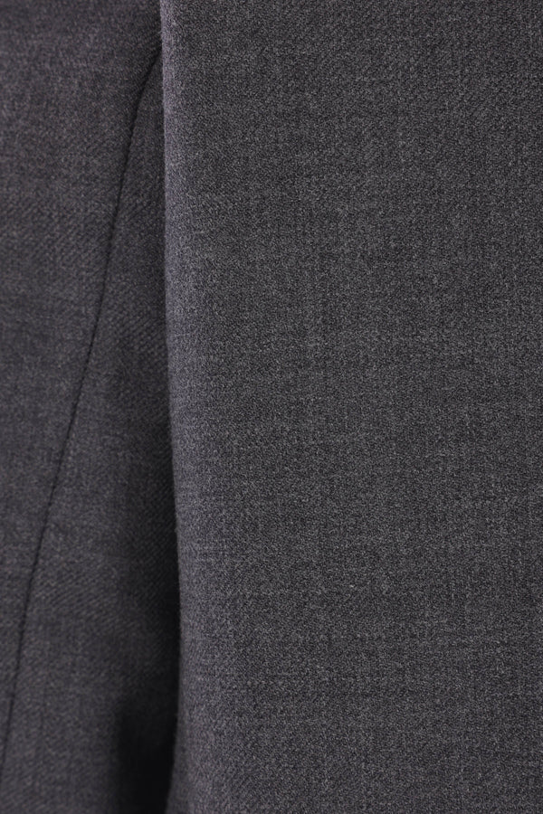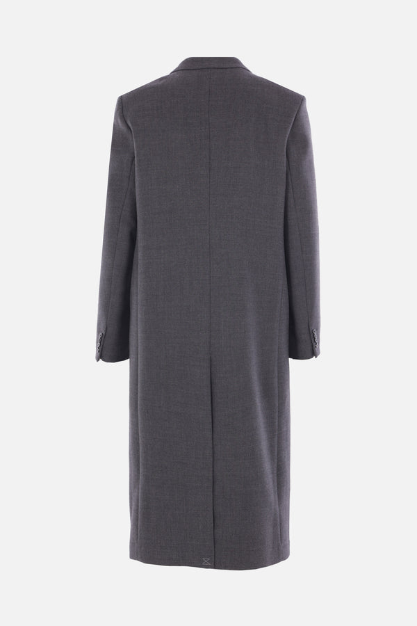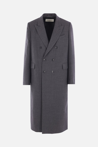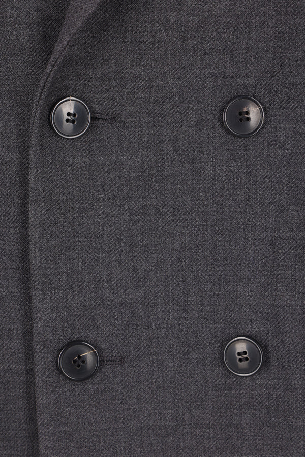 Dries Van Noten double-breasted coat crafted from dark gray wool. Featuring peak lapels, front button fastening, structured shoulders, multiple pockets, long sleeves with buttoned cuffs, and a central vent. Fully lined interior.