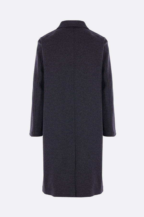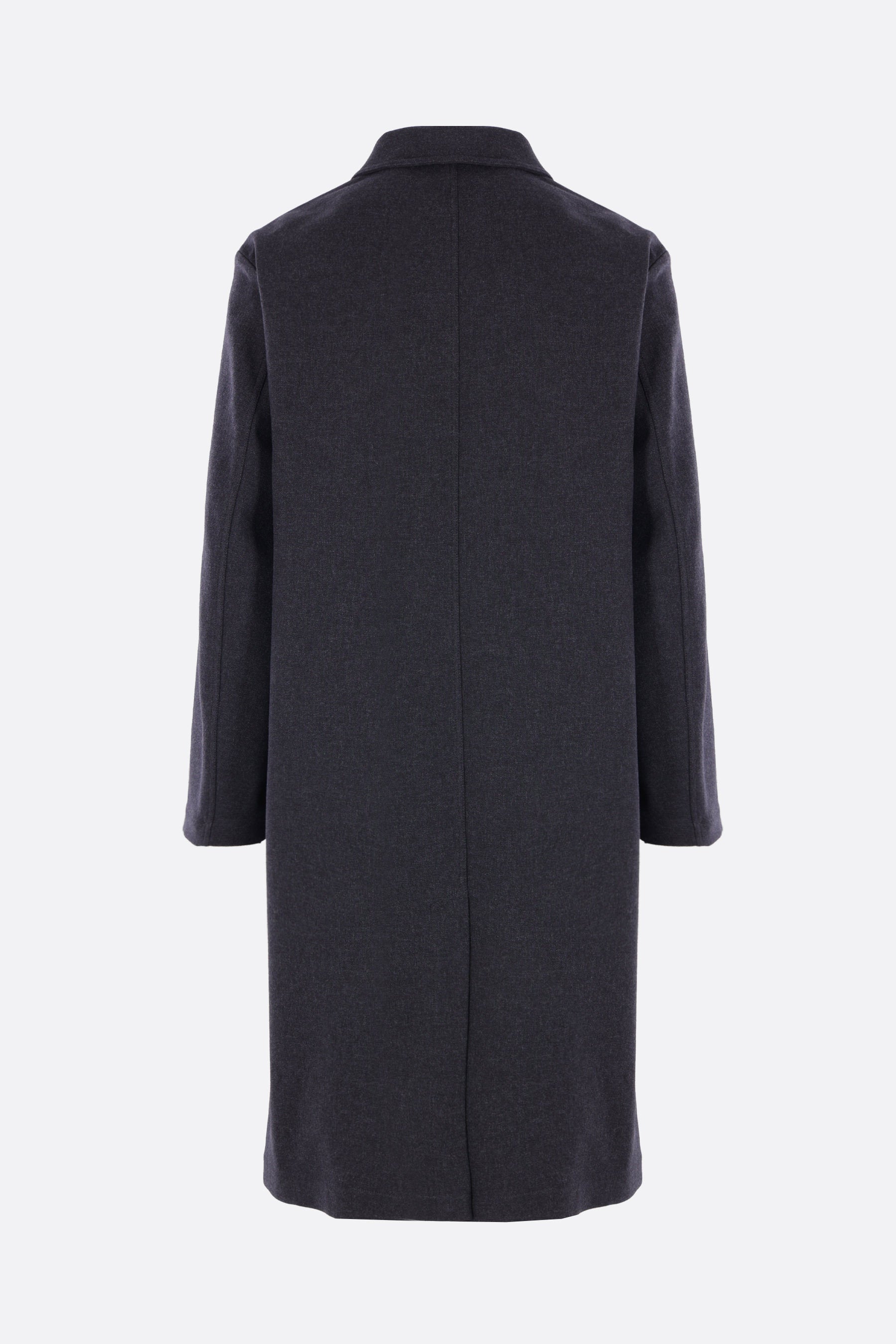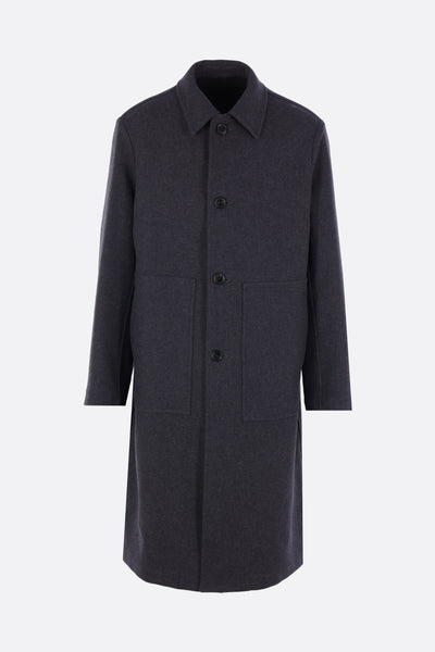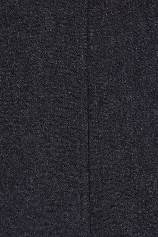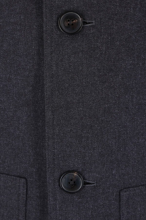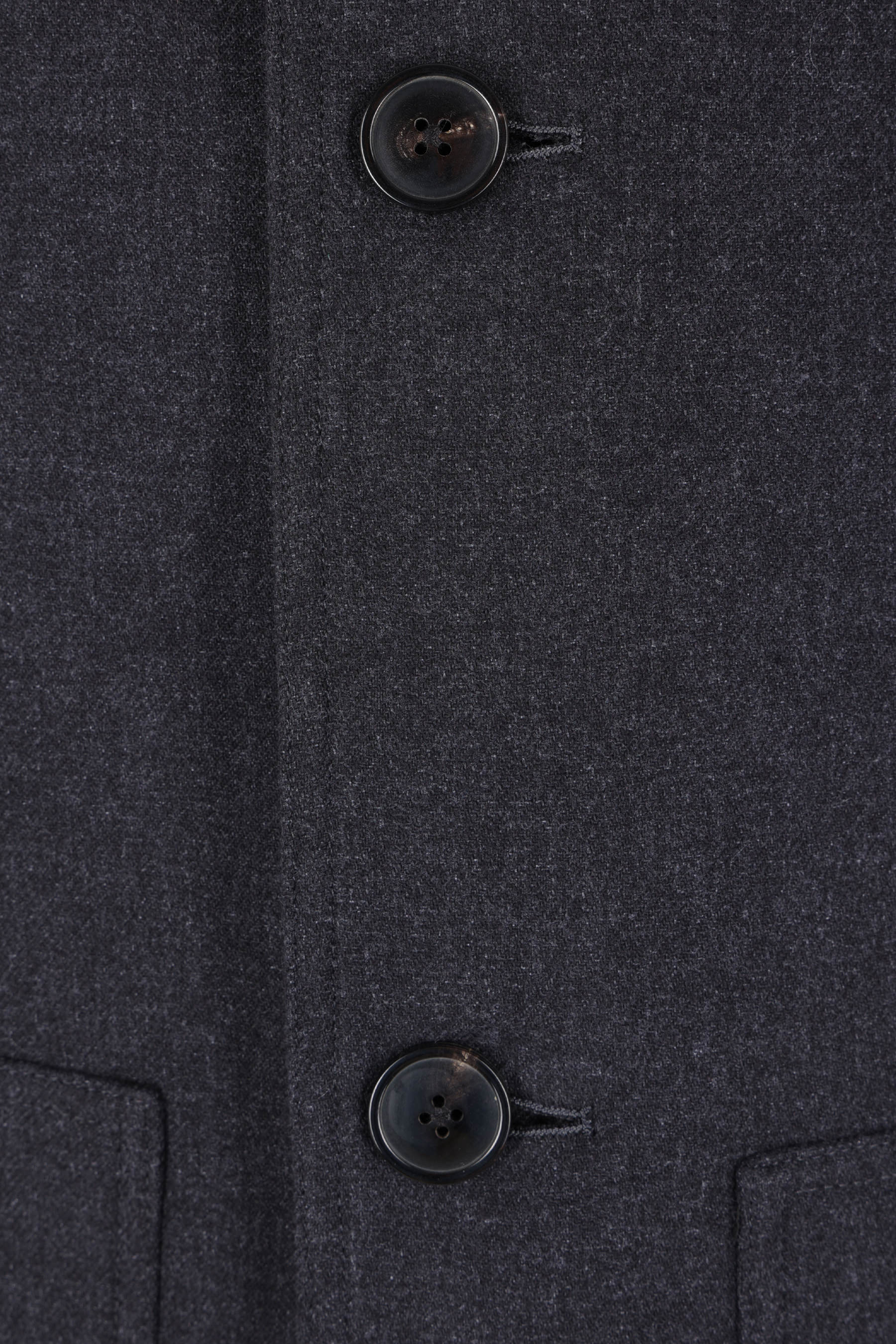 Dries Van Noten single-breasted coat crafted from dark grey cotton and wool blend. Featuring pointed collar, front button closure, front pockets, long sleeves, central back vent, and unlined interior.