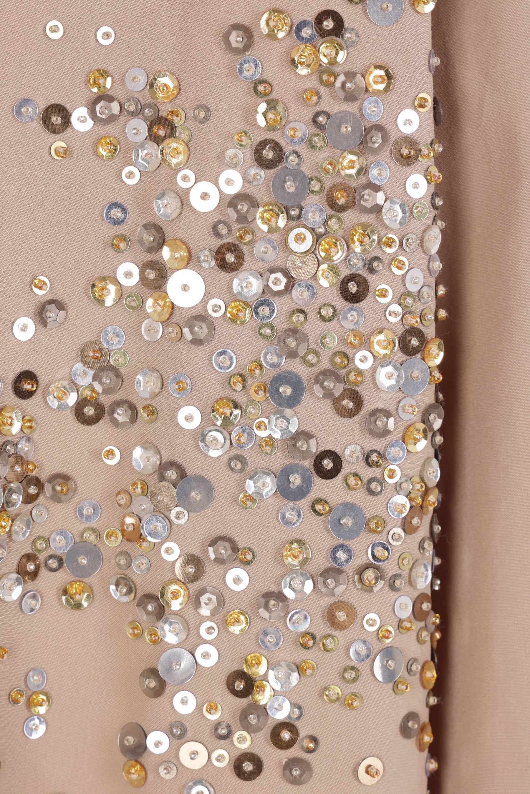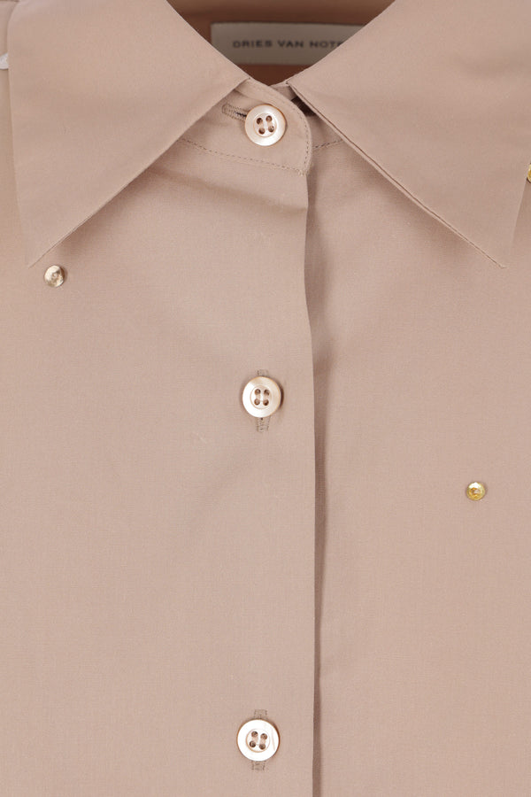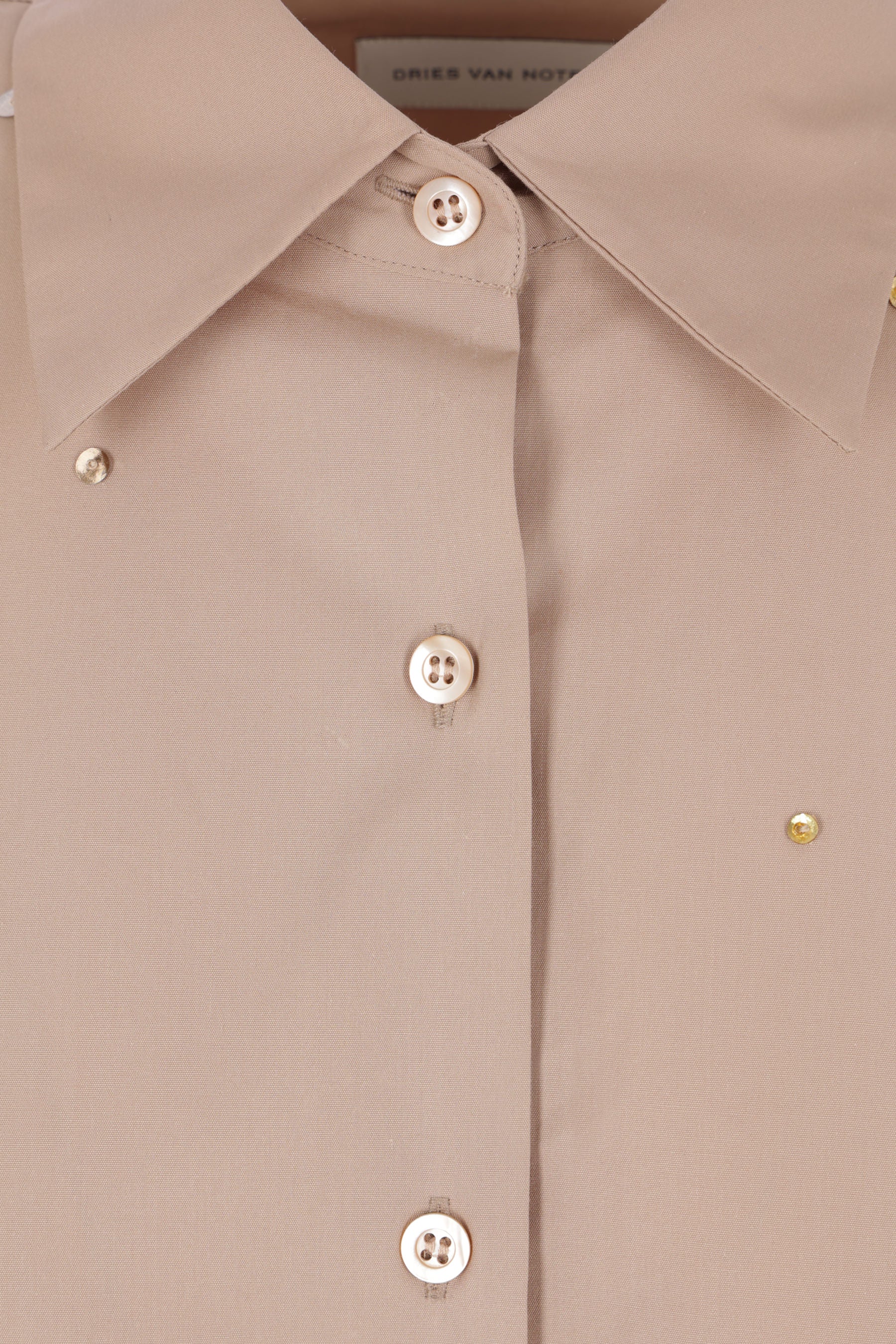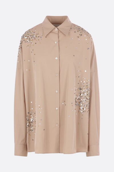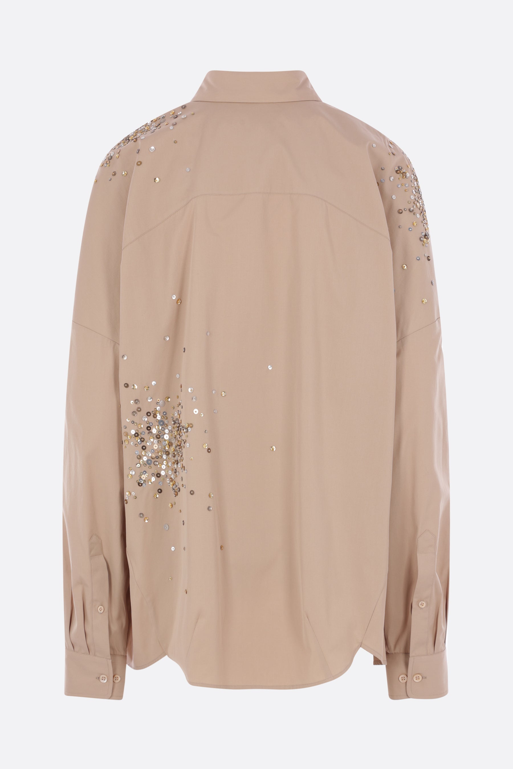 Dries Van Noten oversized shirt crafted in sand-colored cotton poplin with sequin and bead embroidery. Featuring a classic collar, front button closure, long sleeves with buttoned cuffs, and a rounded hem.