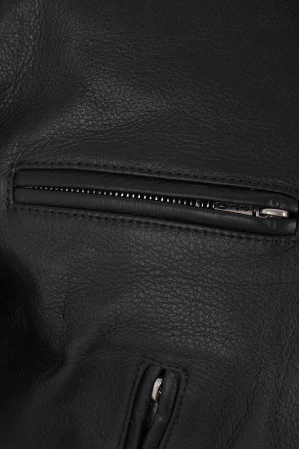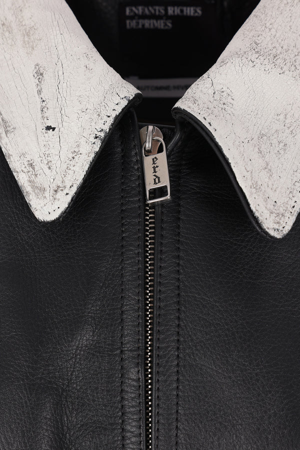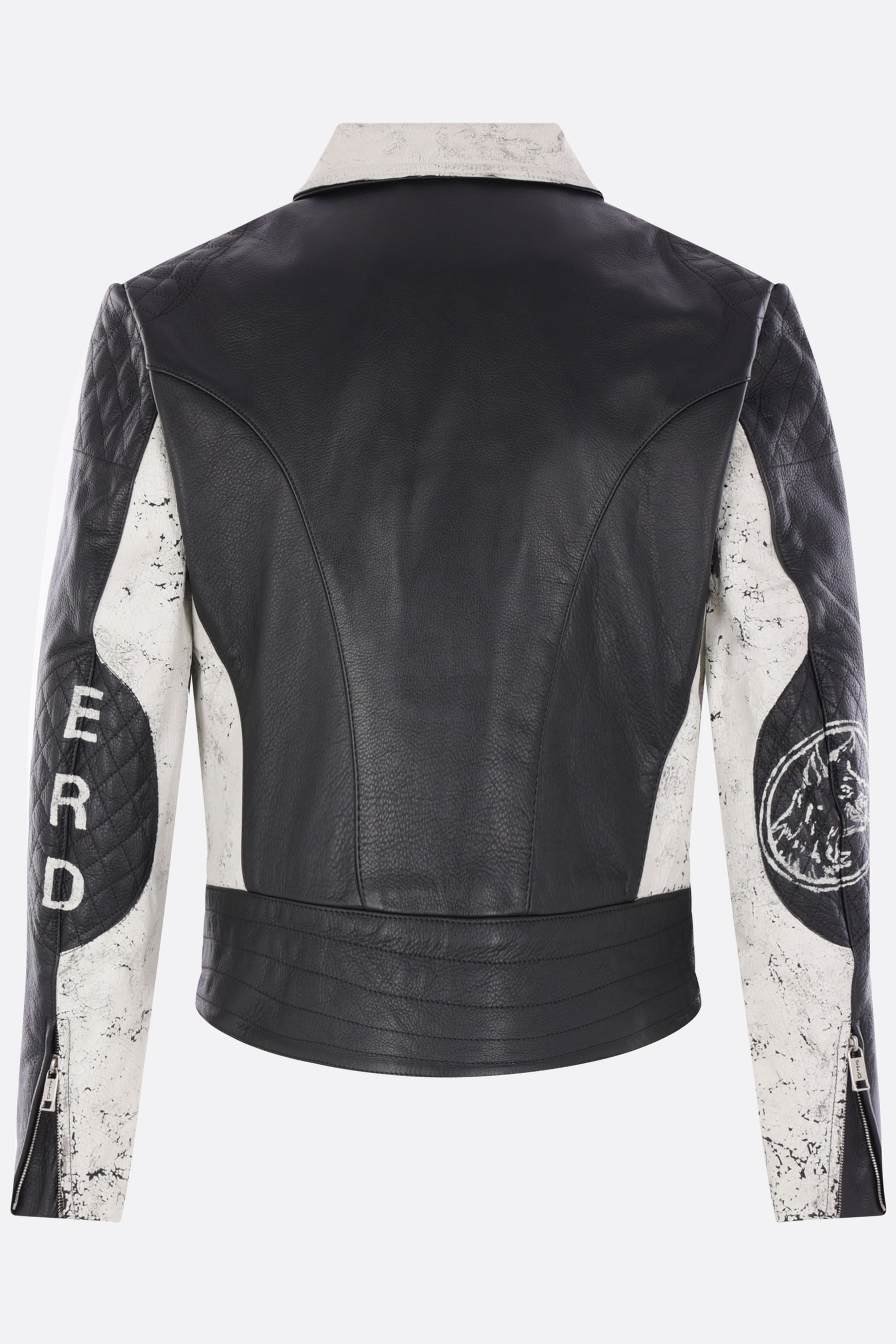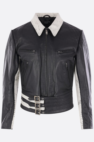 Enfants Riches Déprimés jacket crafted from black grained leather with contrasting painted details. Featuring a pointed collar, zip closure, triple waist buckle, multiple pockets, quilted details on the shoulders and elbows, long sleeves with zip cuffs, and a fully lined interior.