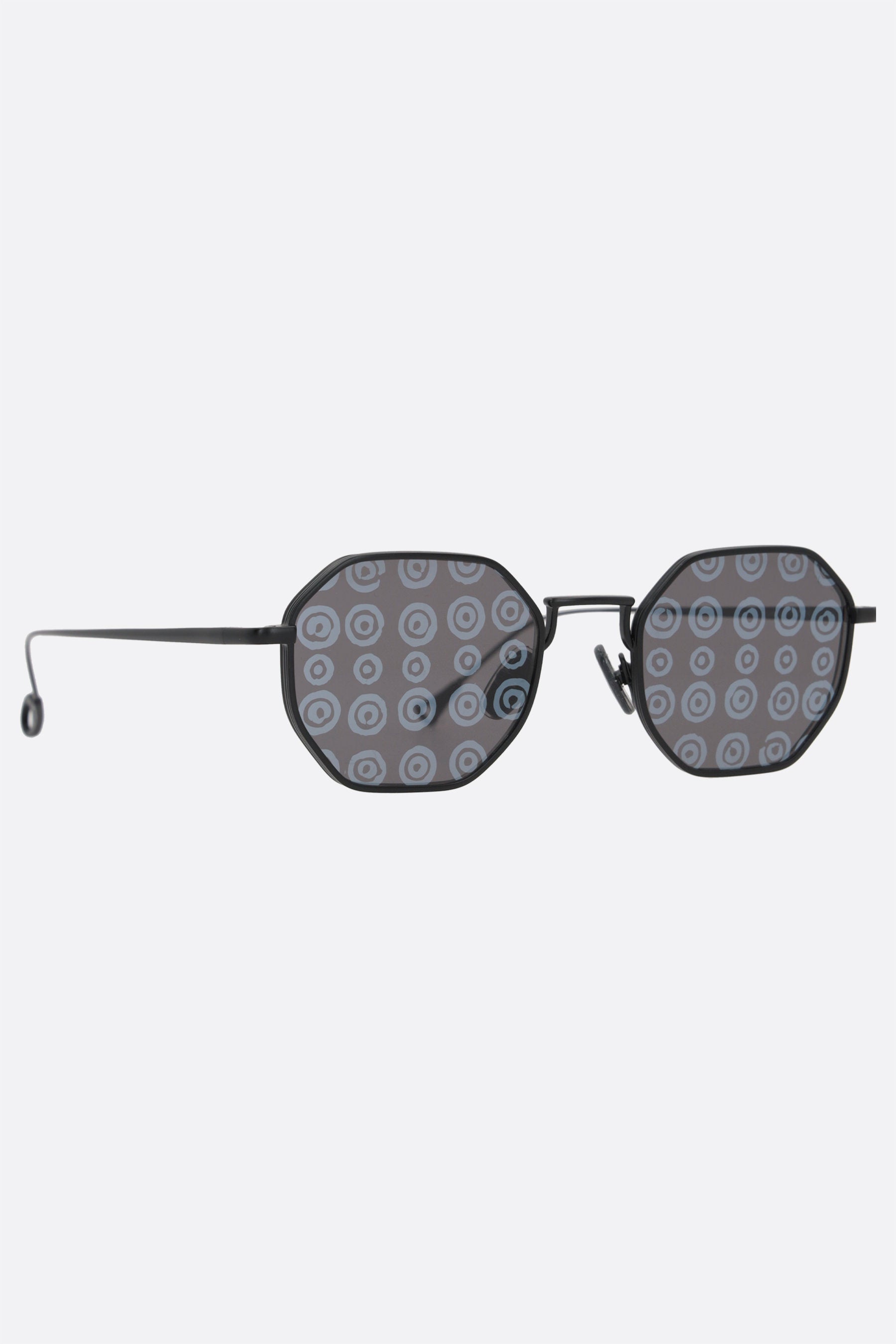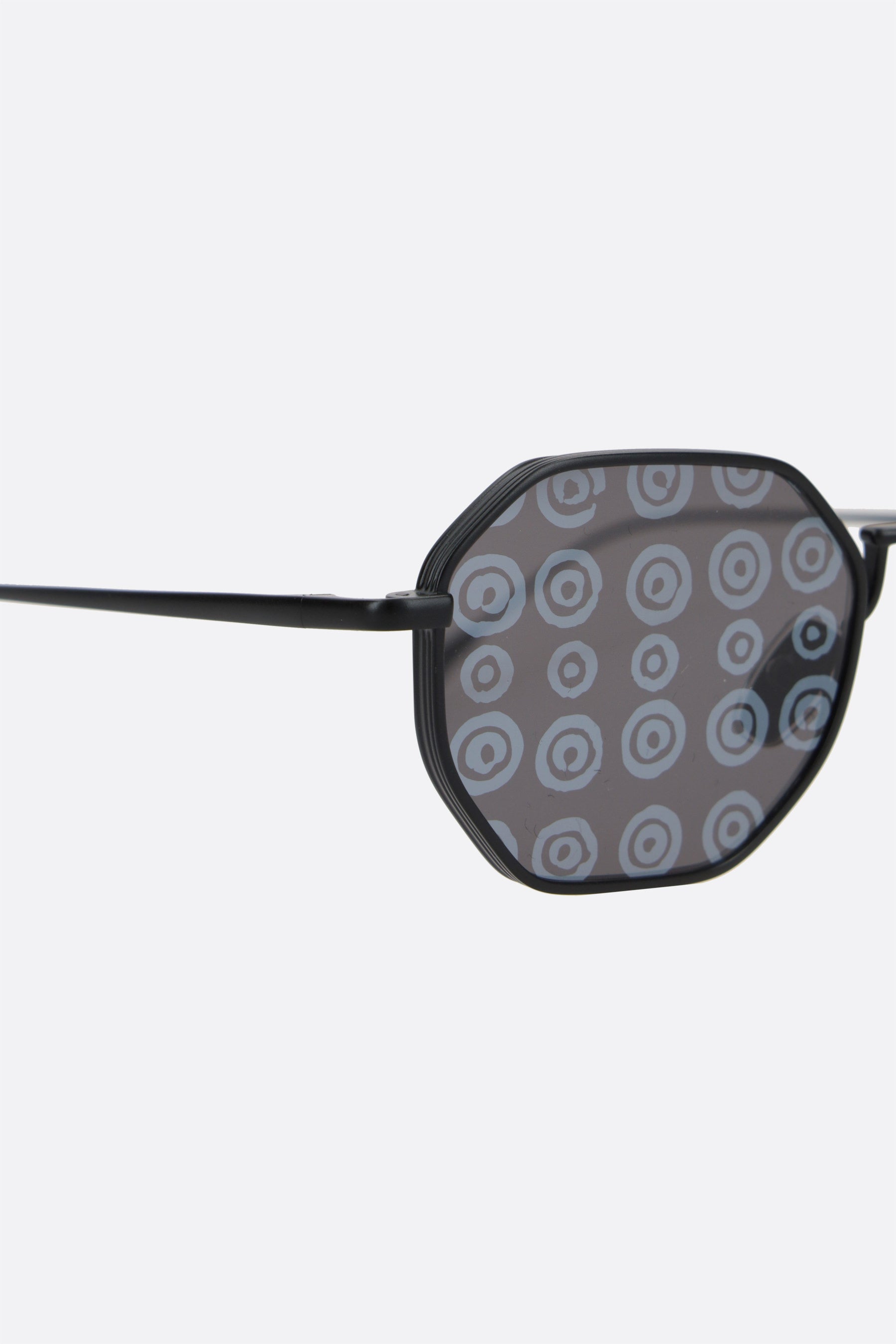 Eyepetizer x 10 Corso Como's sunglasses crafted in black matte steel. Featuring rubber nose plates, dark grey nylon lenses with UVA/UVB protection and signature circle pattern. The design is completed by the iconic logo engraved on the temples.