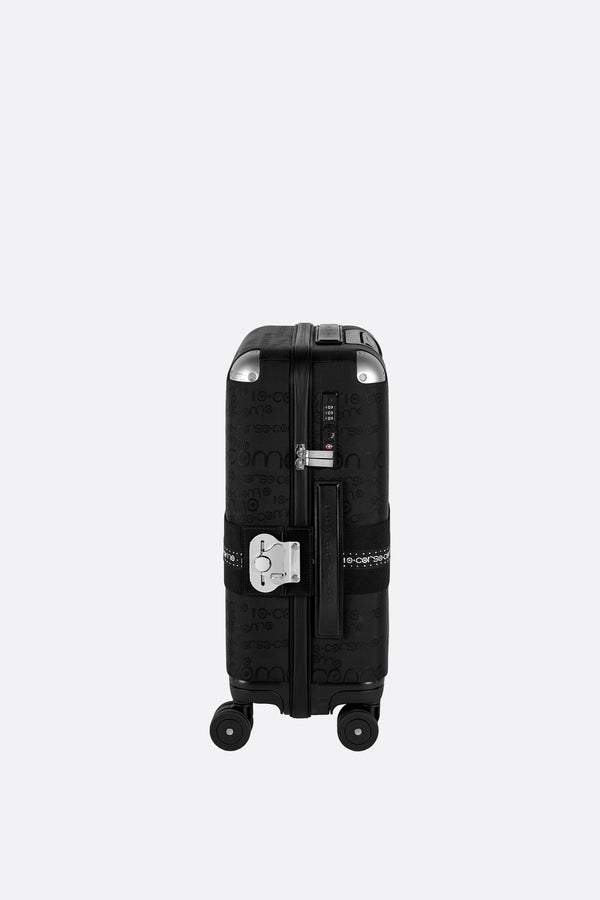 FPM Milano x 10 Corso Como cabin trolley made of black nylon with all-over jacquard logo. Featuring a leather top handle, non-slip side handle, adjustable telescopic pull handle, integrated TSA lock, and a logo strap with butterfly lock closure. The interior includes multiple compartments and two logo fabric straps.