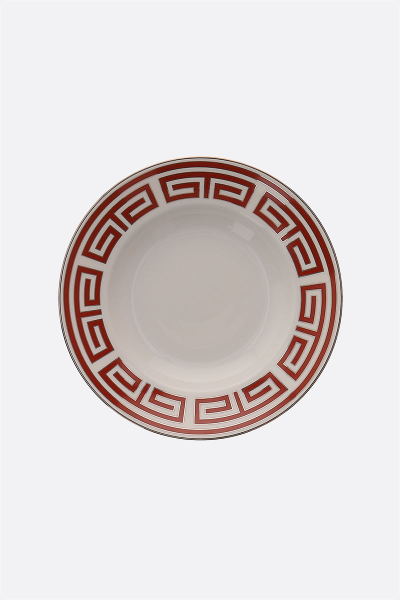 Ginori 1735's soup plate crafted in white porcelain decorated with dark red Labirinto motif, a pattern created by Gio Ponti in 1926.