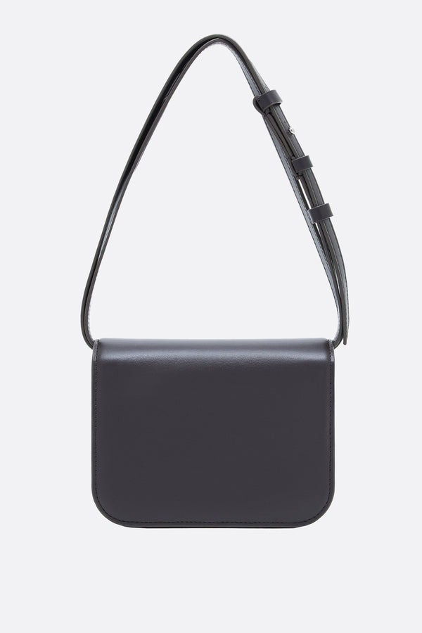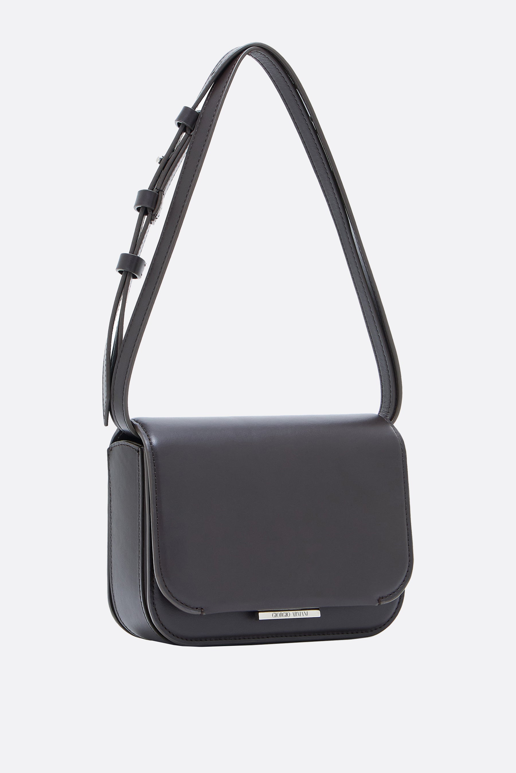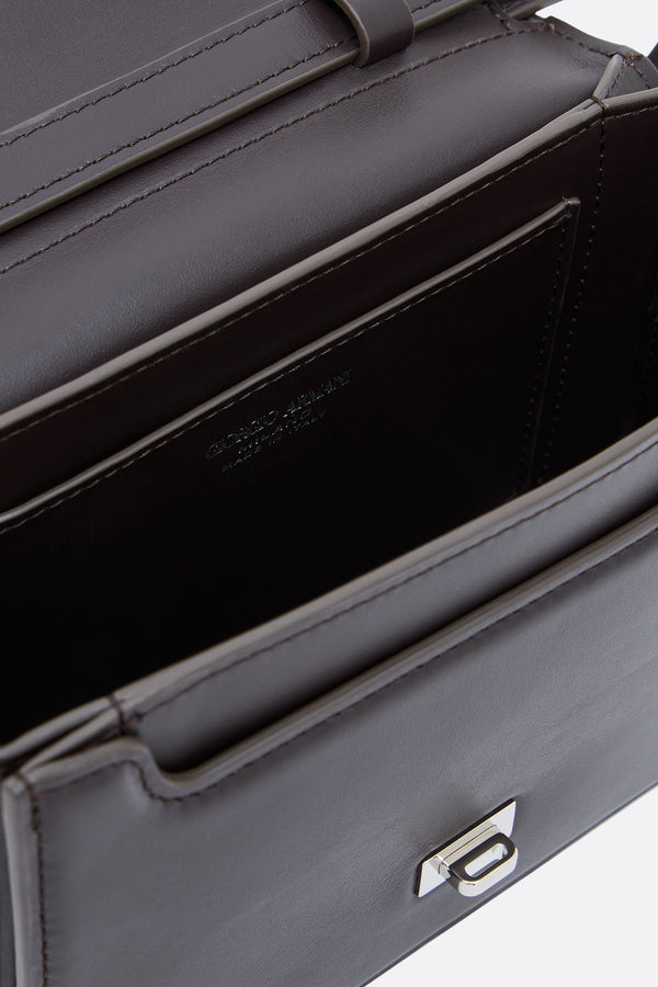 Giorgio Armani - 10 Corso Como shoulder bag crafted from dark brown smooth leather. It features silver-tone hardware, a push-lock flap closure, and an adjustable shoulder strap. The tone-on-tone leather-lined interior includes three separate compartments and a flat pocket. Completing the design is the logo lettering engraved on the metal plaque.