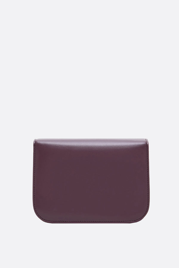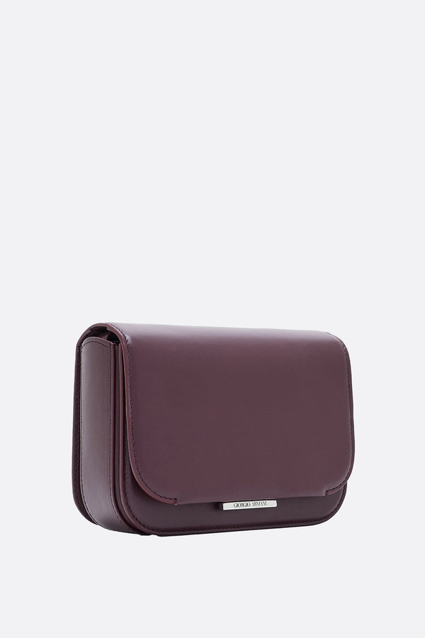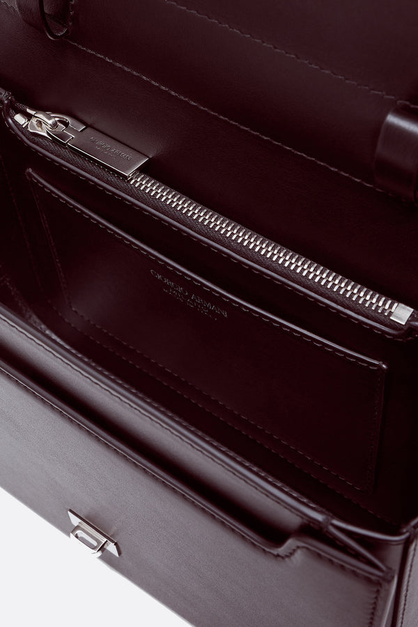Giorgio Armani – 10 Corso Como shoulder bag crafted from burgundy smooth leather. It features silver-tone hardware, a push-lock flap closure, and an adjustable shoulder strap. The tone-on-tone leather-lined interior includes three separate compartments, a zip pocket, and a flat pocket. Completing the design is the logo lettering engraved on the metal plaque.