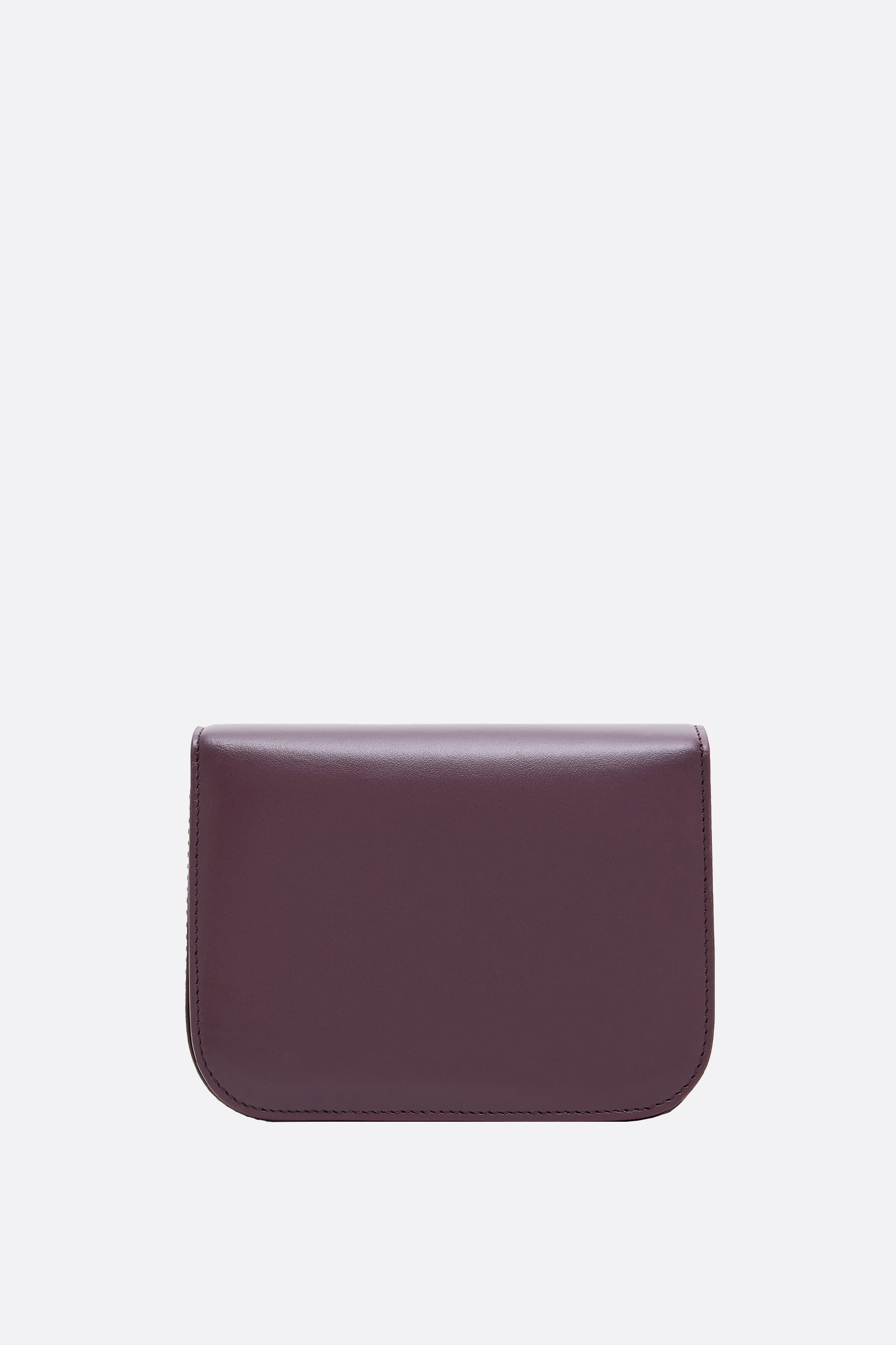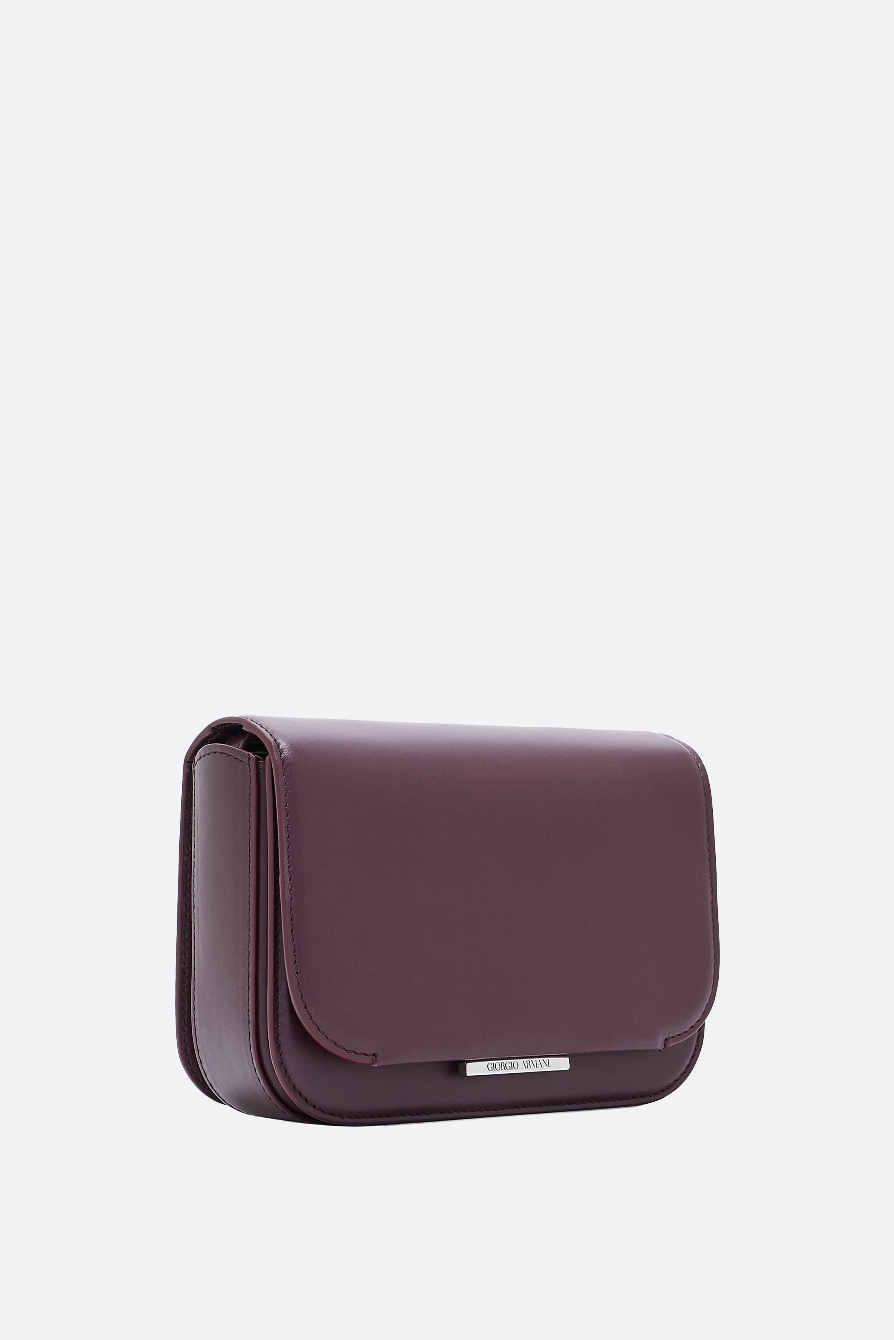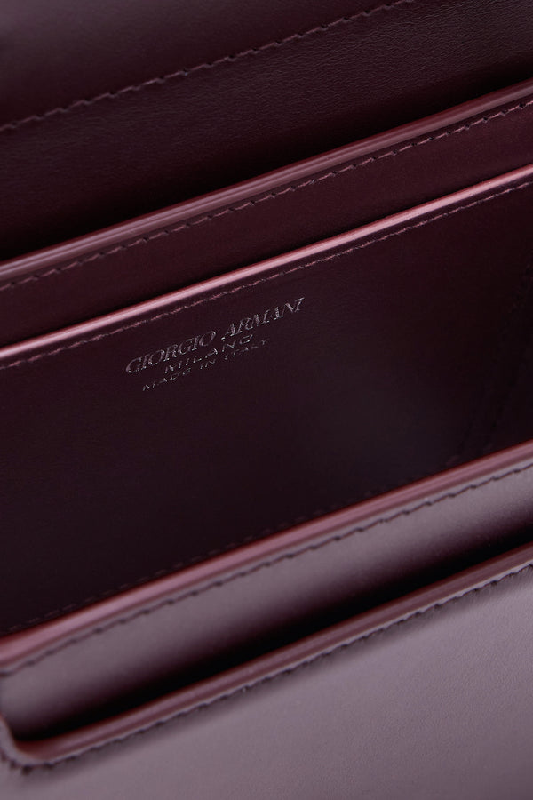 Giorgio Armani - 10 Corso Como shoulder bag crafted from burgundy smooth leather. It features silver-tone hardware, a push-lock flap closure, and an adjustable shoulder strap. The tone-on-tone leather-lined interior includes three separate compartments and a flat pocket. Completing the design is the logo lettering engraved on the metal plaque.
