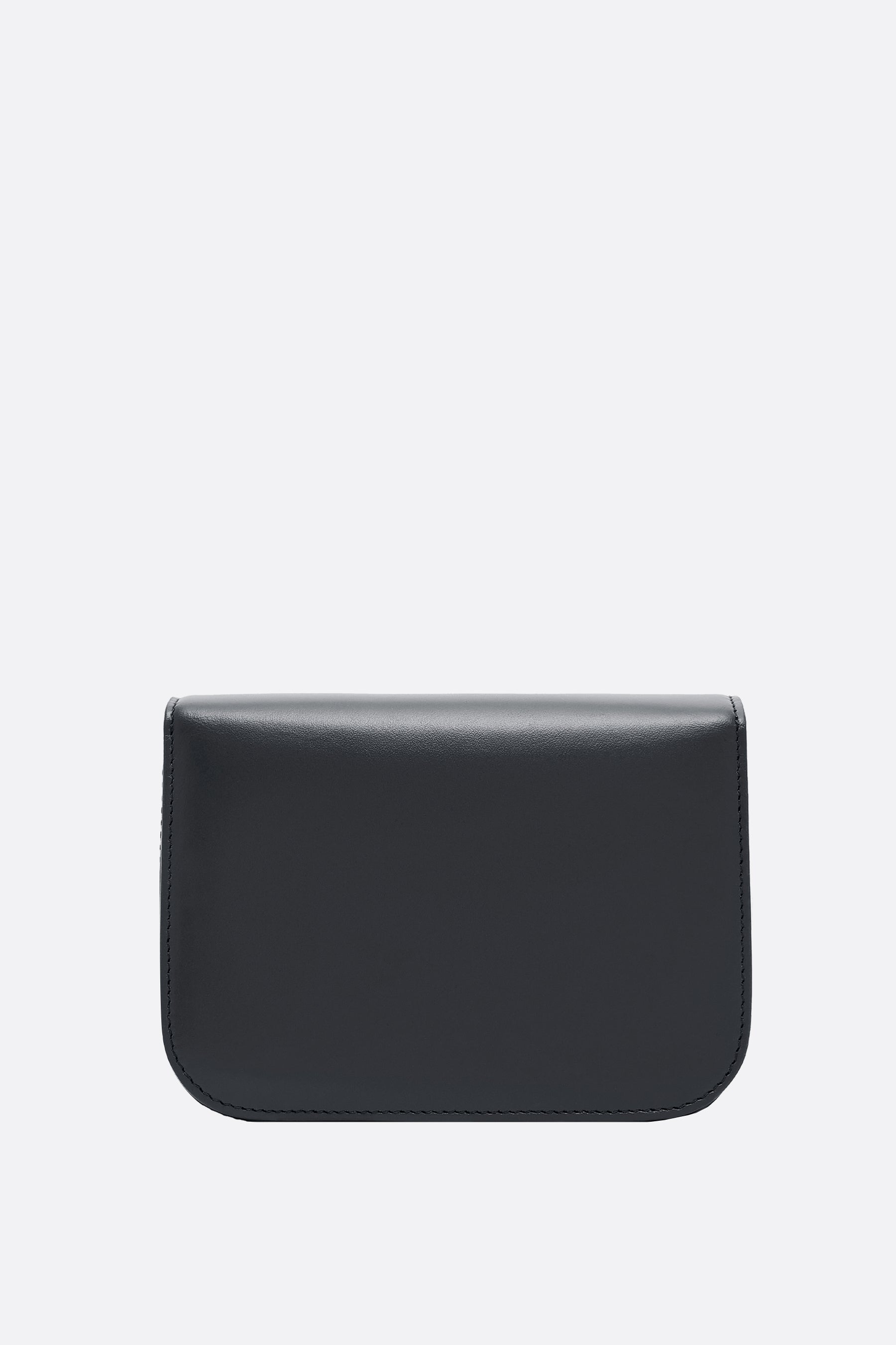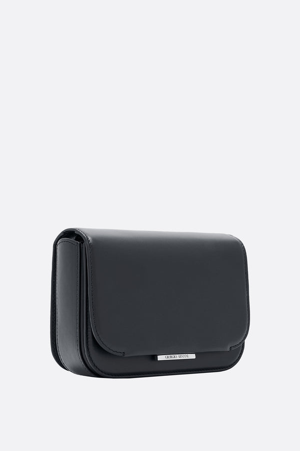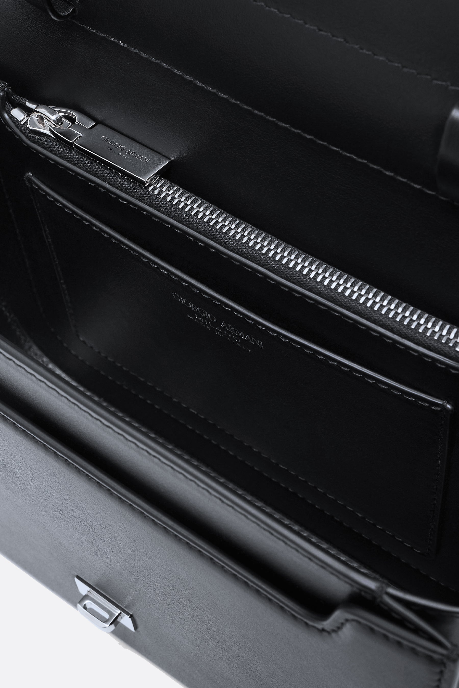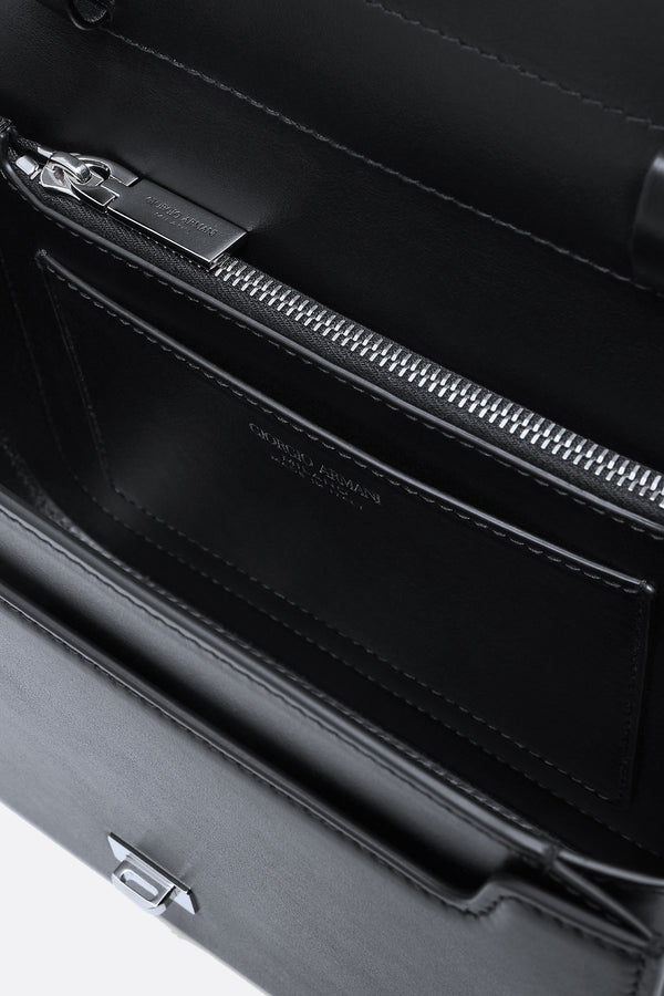Giorgio Armani – 10 Corso Como shoulder bag crafted from black smooth leather. It features silver-tone hardware, a push-lock flap closure, and an adjustable shoulder strap. The tone-on-tone leather-lined interior includes three separate compartments, a zip pocket, and a flat pocket. Completing the design is the logo lettering engraved on the metal plaque.