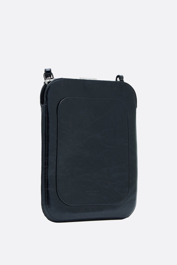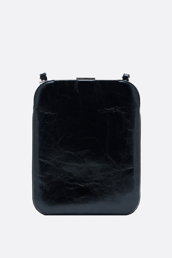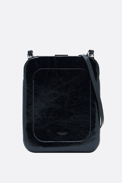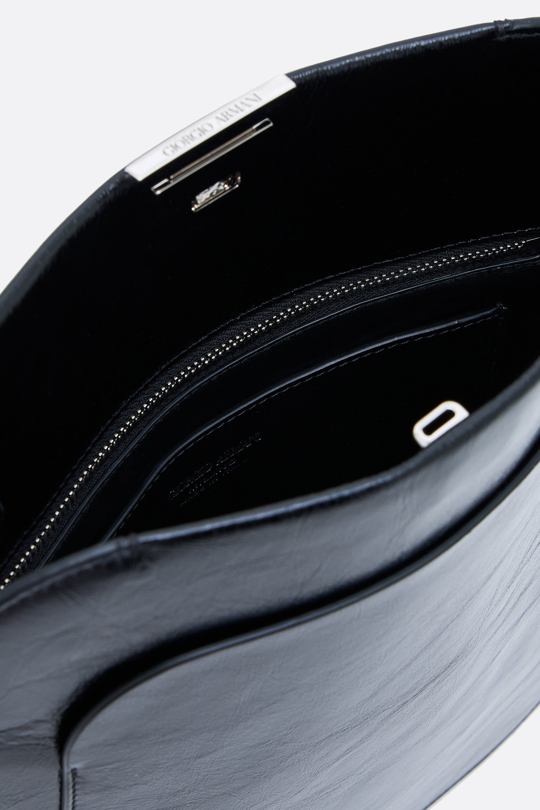 Giorgio Armani – 10 Corso Como messenger bag crafted from craquelé black leather. It features silver-tone hardware, a push-lock closure, and an adjustable shoulder strap. The tone-on-tone leather-lined interior includes a flat pocket and a zip pocket. Completing the design is the front flat pocket with the iconic embossed logo lettering.