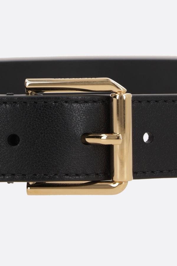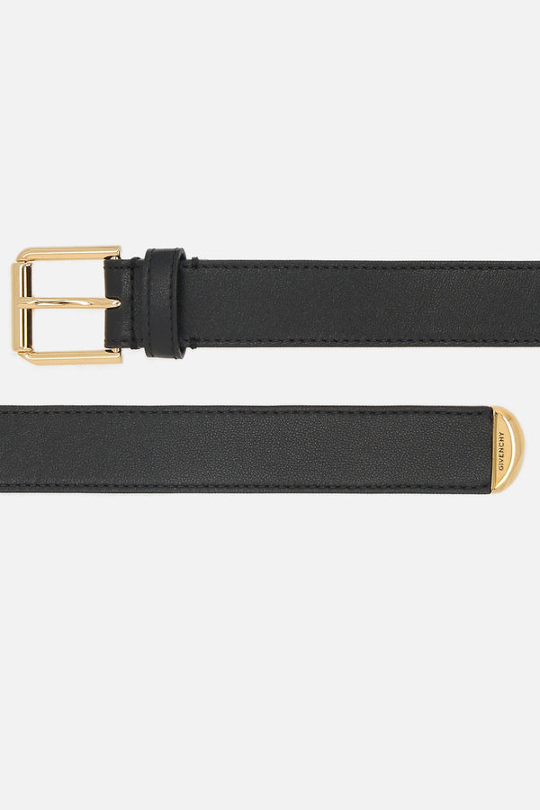 Givenchy long belt crafted from smooth black leather. Featuring an adjustable gold-tone metal buckle and a metal tip engraved with the logo.