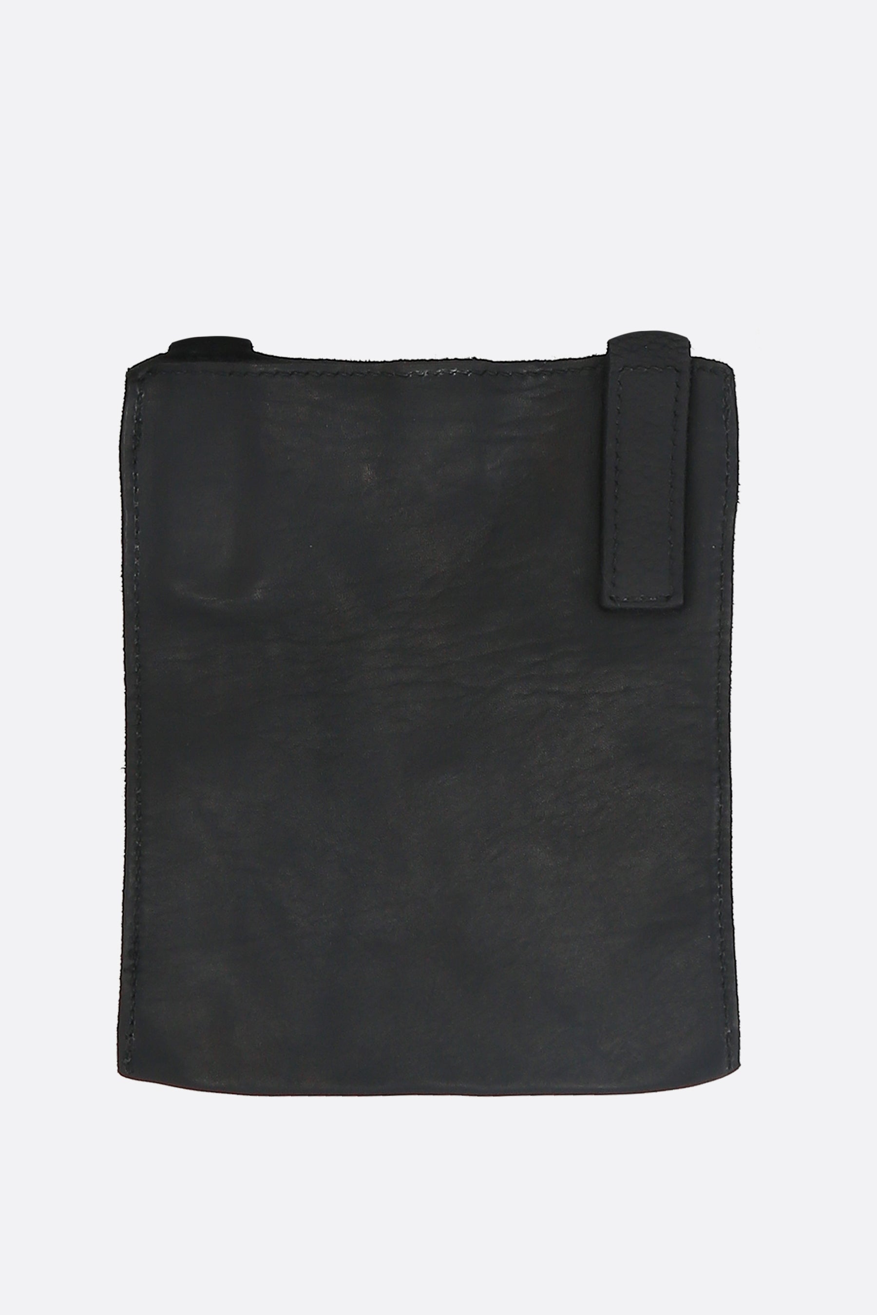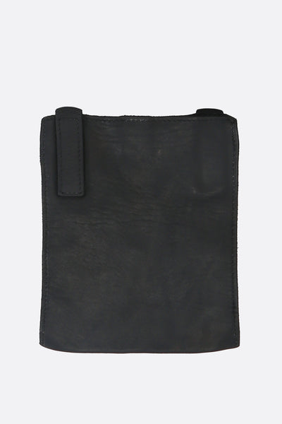 Guidi crossbody bag made of smooth black leather. Featuring silver-tone hardware, an adjustable shoulder strap, and an unlined interior in a matching tone.