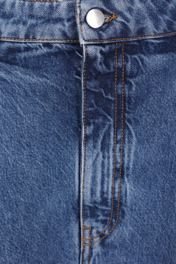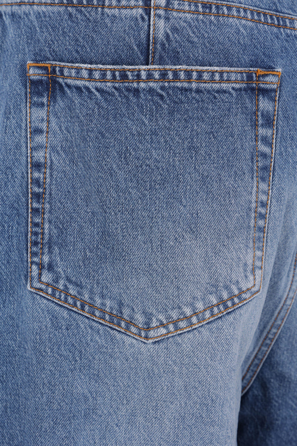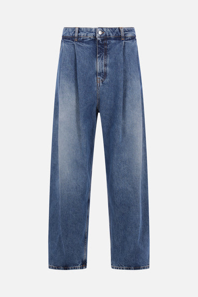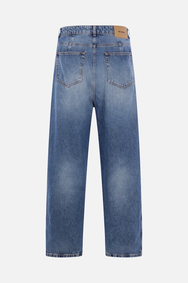 Hed Mayner baggy jeans crafted from blue cotton denim. They feature a front metal button and zip closure, belt loops, multiple pockets, double pleats, and a logo patch on the back.