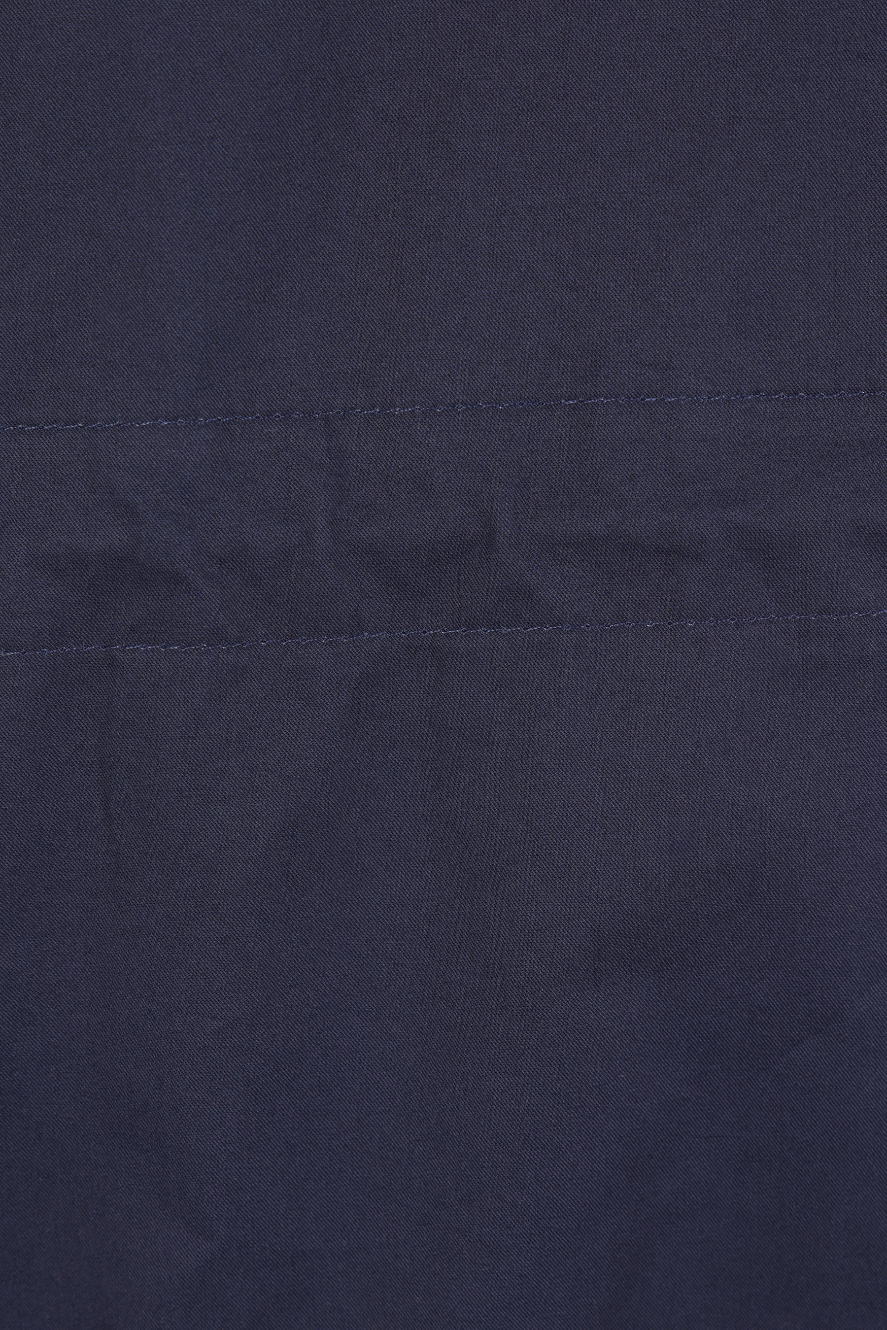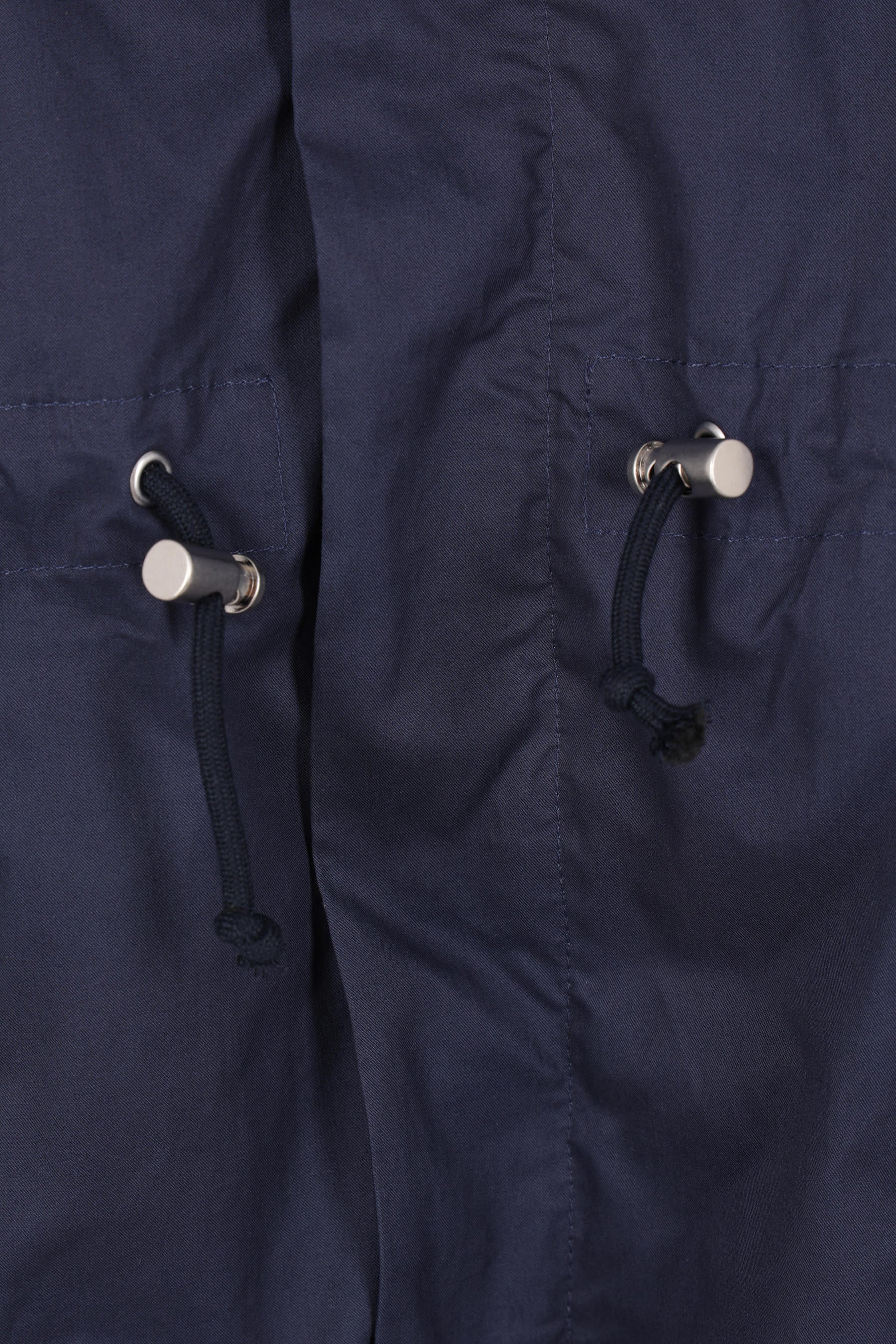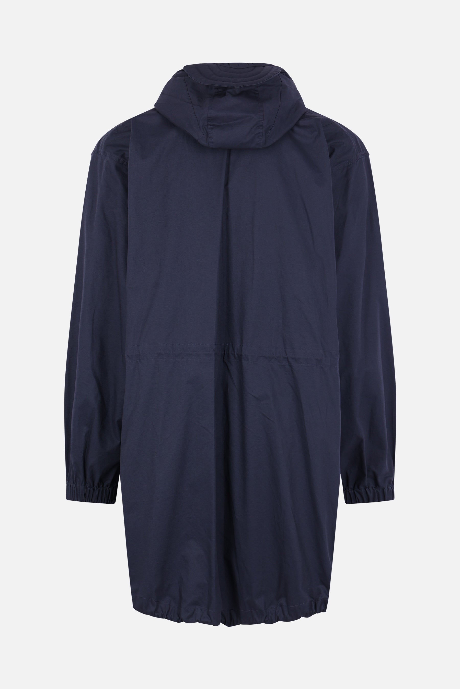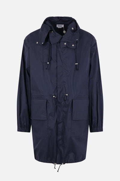 Hed Mayner oversized parka crafted from blue cotton. It features a high collar, hood with a visor, front zip and snap-button closure, multiple pockets, long sleeves with elasticated cuffs, and drawstrings at the waist and hem. The interior is unlined.
