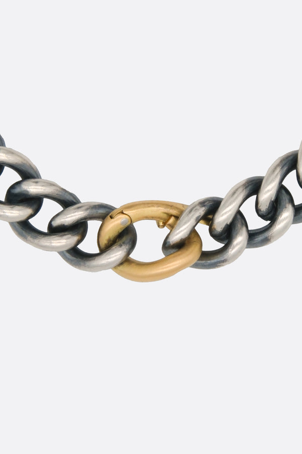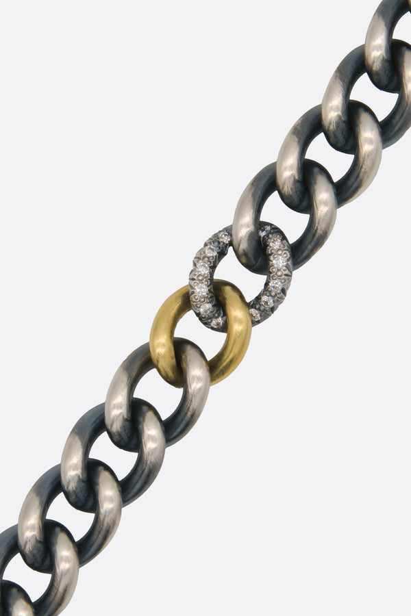Hum bracelet achieved by adding the shine of gold and diamonds to a smoked silver chain. Hook closure.