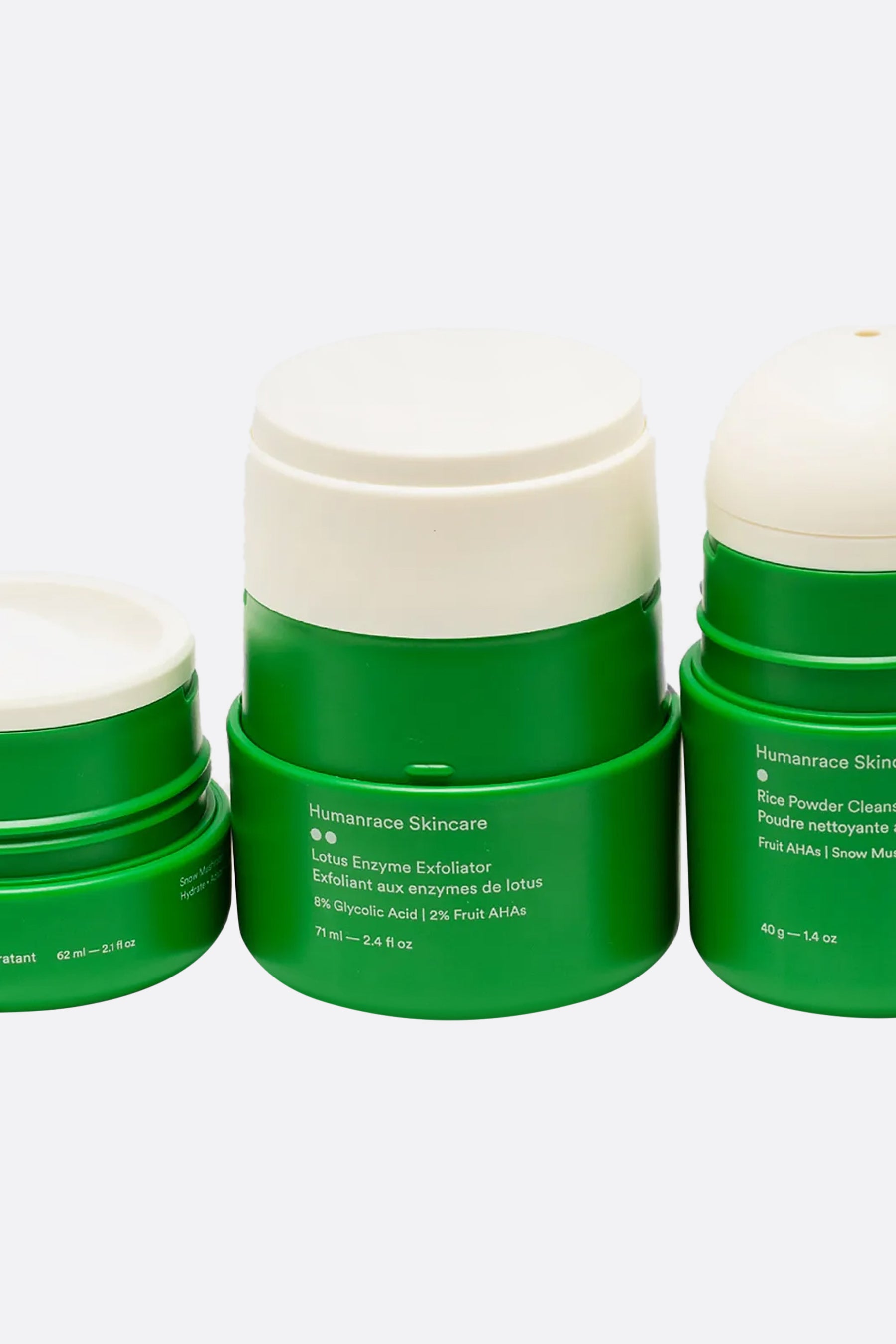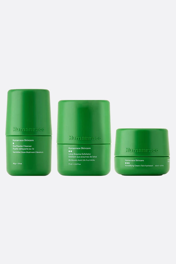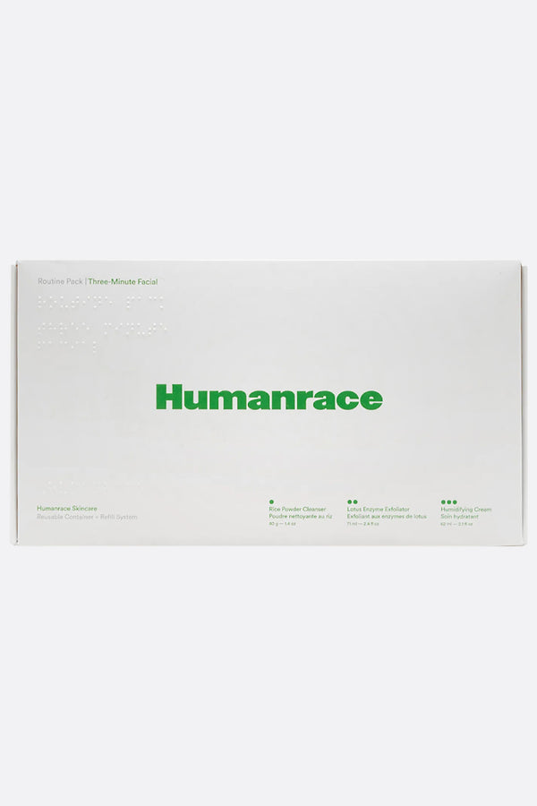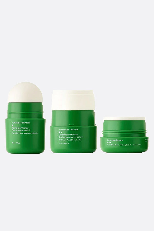 The Humanrace skincare routine pack includes the Rice Powder Cleanser, Lotus Enzyme Exfoliator, and Humidifying Face Cream, providing a comprehensive three-step routine. Designed to cleanse, smooth, and moisturize the face, these products are to be used daily, with the exfoliator 2-3 times weekly. Key ingredients include fruit alpha hydroxy acids, kaolin clay, and snow mushroom extract among others. All the products contained in the set are: cruelty free, dermatologist tested, fragrance free, gluten free, vegan, microtear safe.