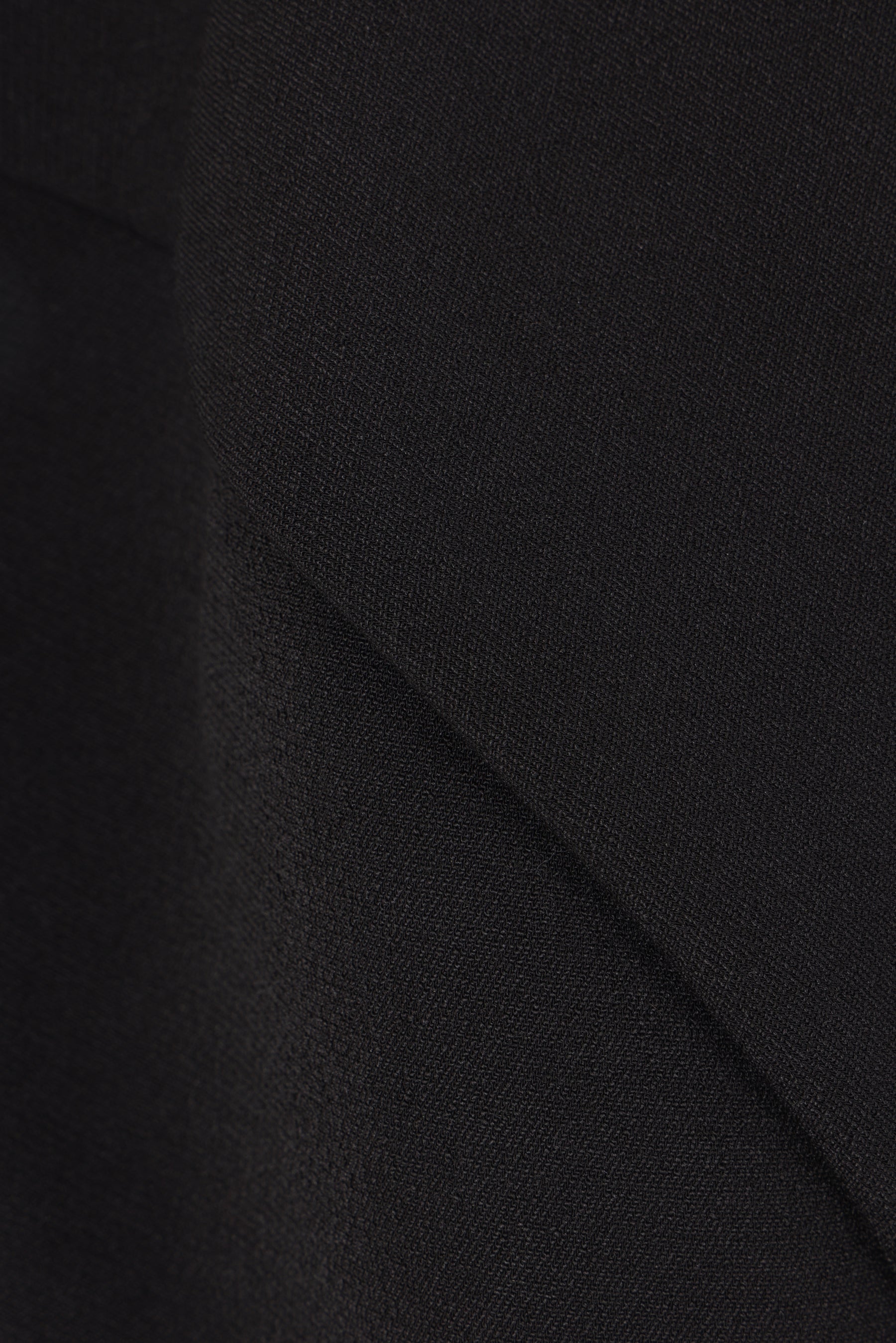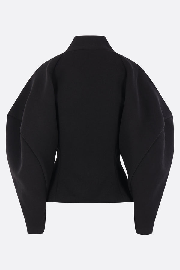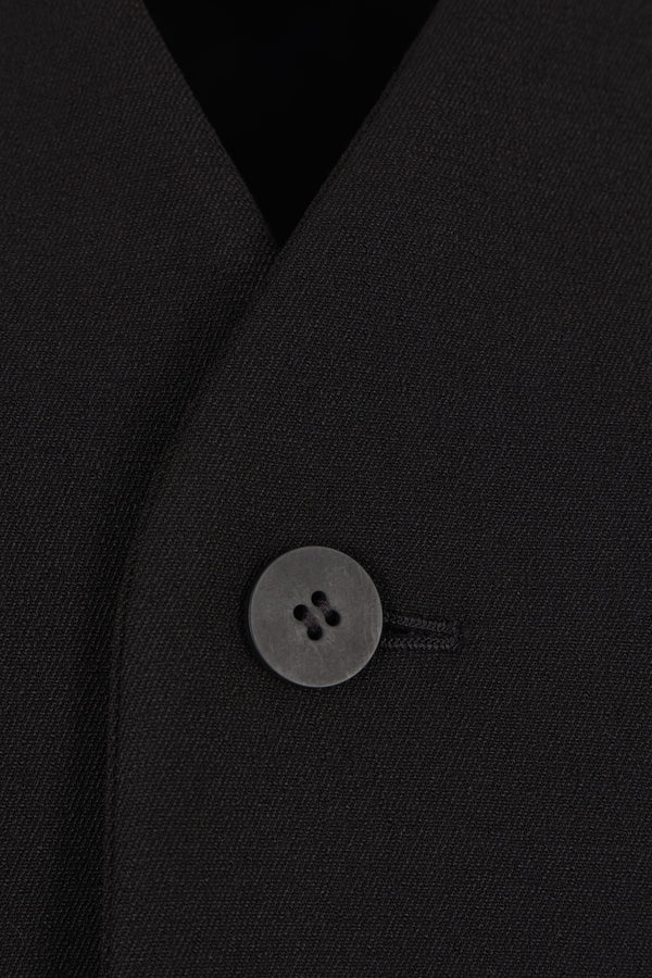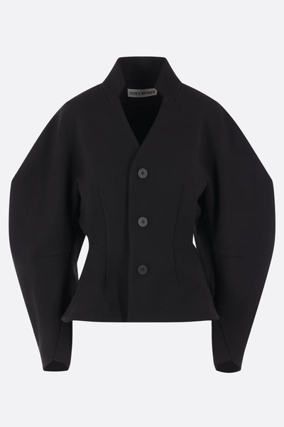 Issey Miyake single-breasted jacket made from black cotton blend. Featuring a raised V-neck collar, front button closure, long curved sleeves, and peplum hem. Unlined interior.