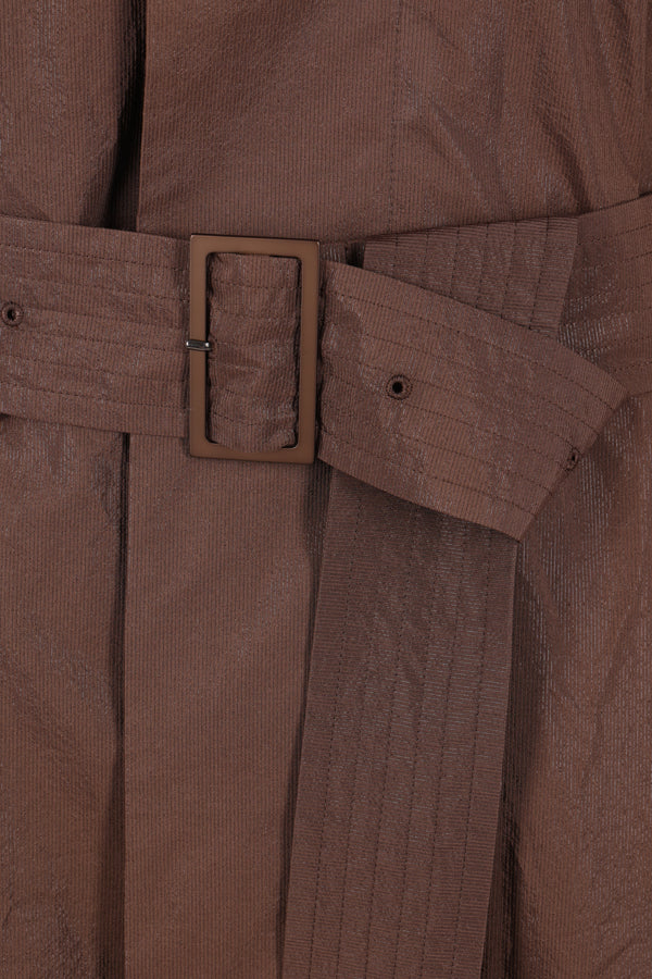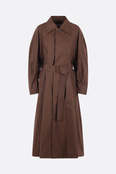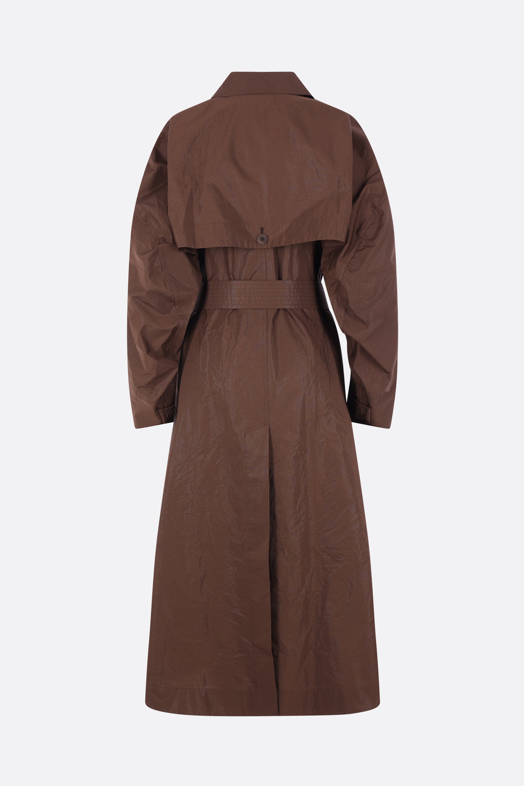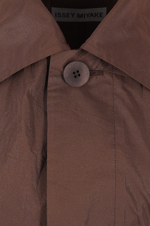Issey Miyake oversized trench coat made from dark brown taffeta. Featuring a pointed collar, hidden single-breasted button closure, welt pockets, long sleeves with elasticized wrist details, storm flap, matching belt, center back vent, and an unlined interior.