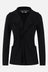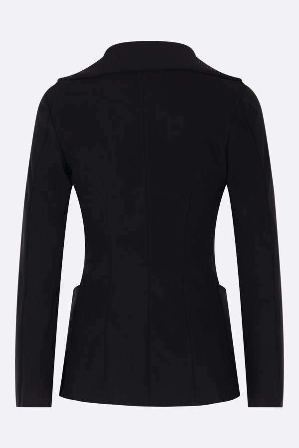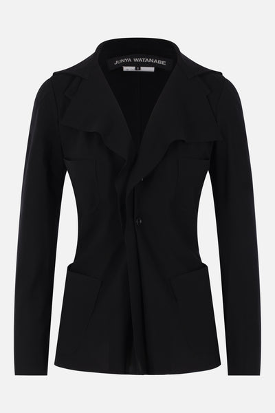 Junya Watanabe single-breasted jacket crafted in black crepe. Features wide double-layered lapels, front button closure, front patch pockets, long sleeves, a slightly longer front hem, and raw-edge finishes. Unlined interior.
