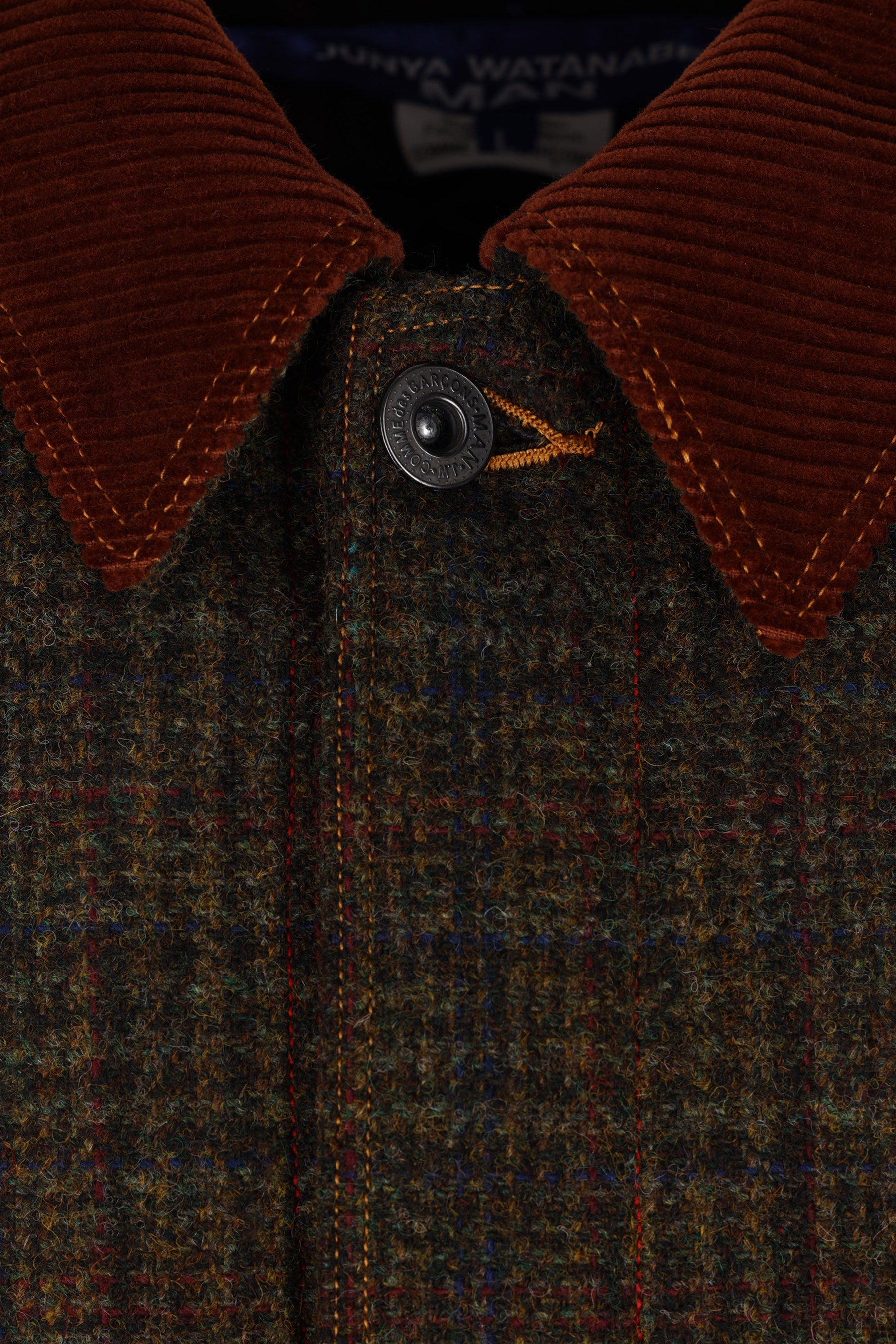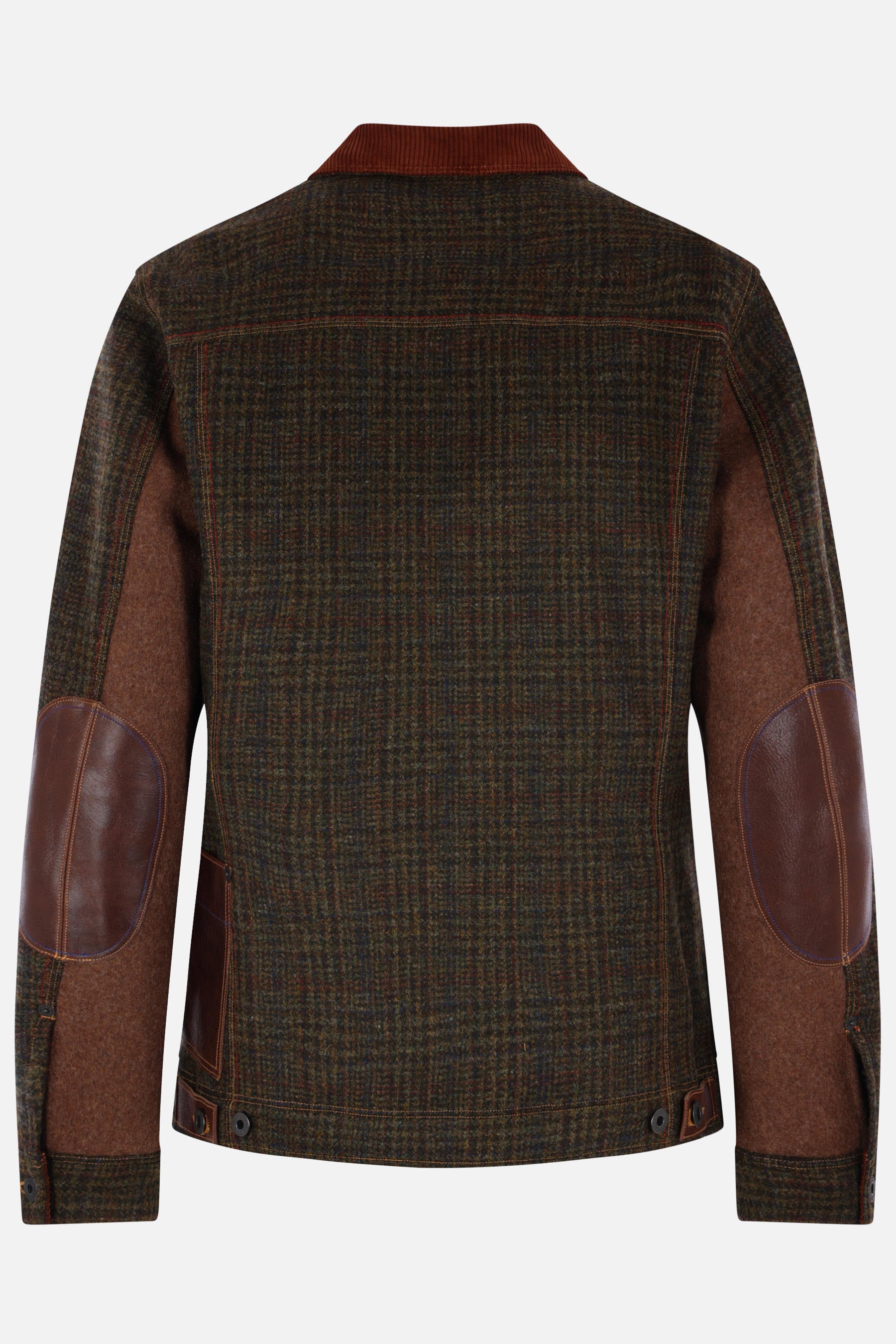 Junya Watanabe Man workwear jacket made of khaki green wool with a check pattern and contrasting details. It features a corduroy pointed collar, front metallic button closure, asymmetric pockets, long sleeves with buttoned cuffs, leather elbow patches, a straight hem with adjustable side tabs, and a quilted interior.