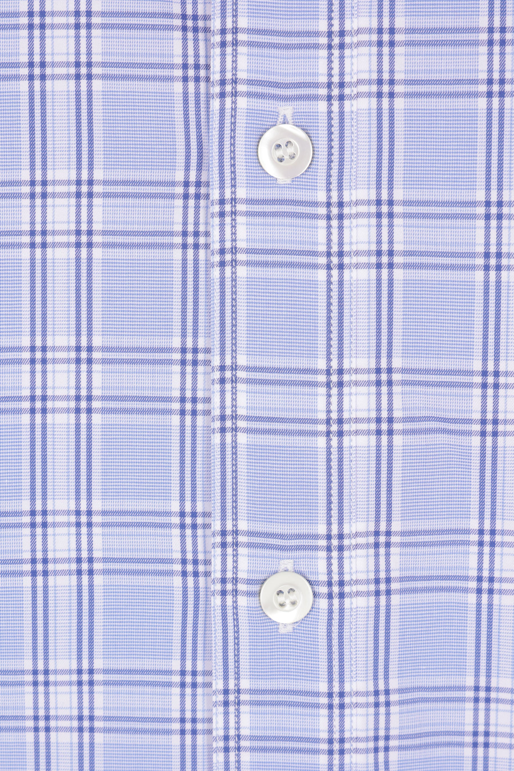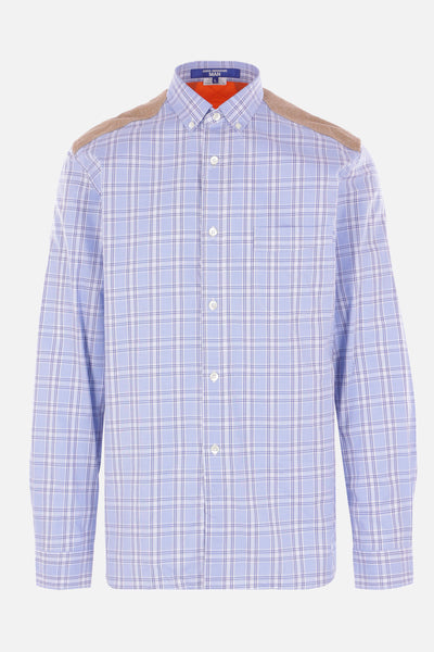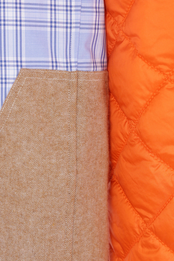 Junya Watanabe Man shirt made from light blue checked cotton with beige flannel inserts and orange quilted nylon back panel. Features a button-down collar, front button closure, chest patch pocket, long sleeves with buttoned cuffs, and rounded hem.