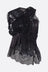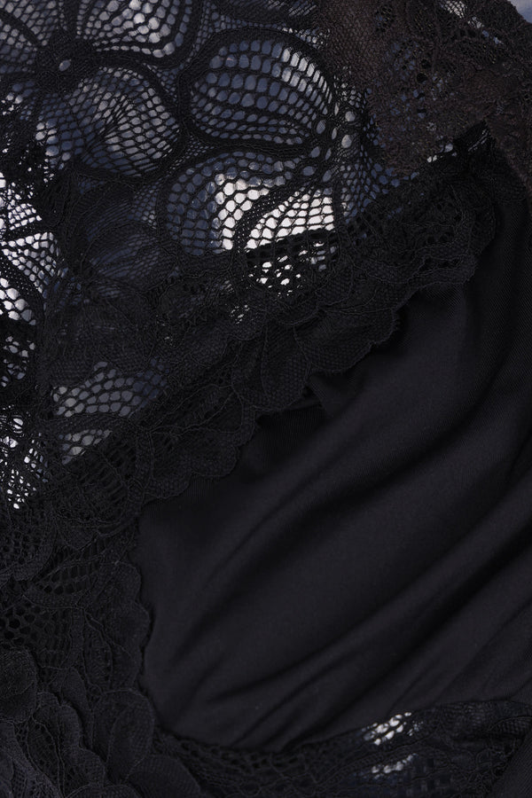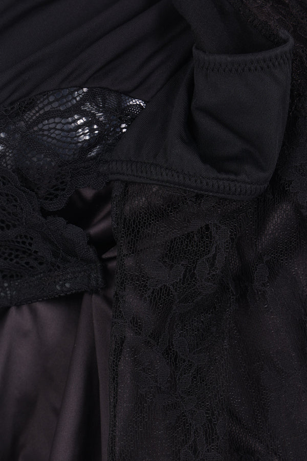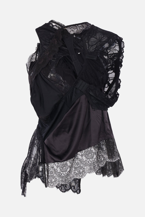Junya Watanabe sleeveless top crafted in black satin and floral lace. Features a V-neckline, corset-style boning details, a back cut-out, and an asymmetric hem.
