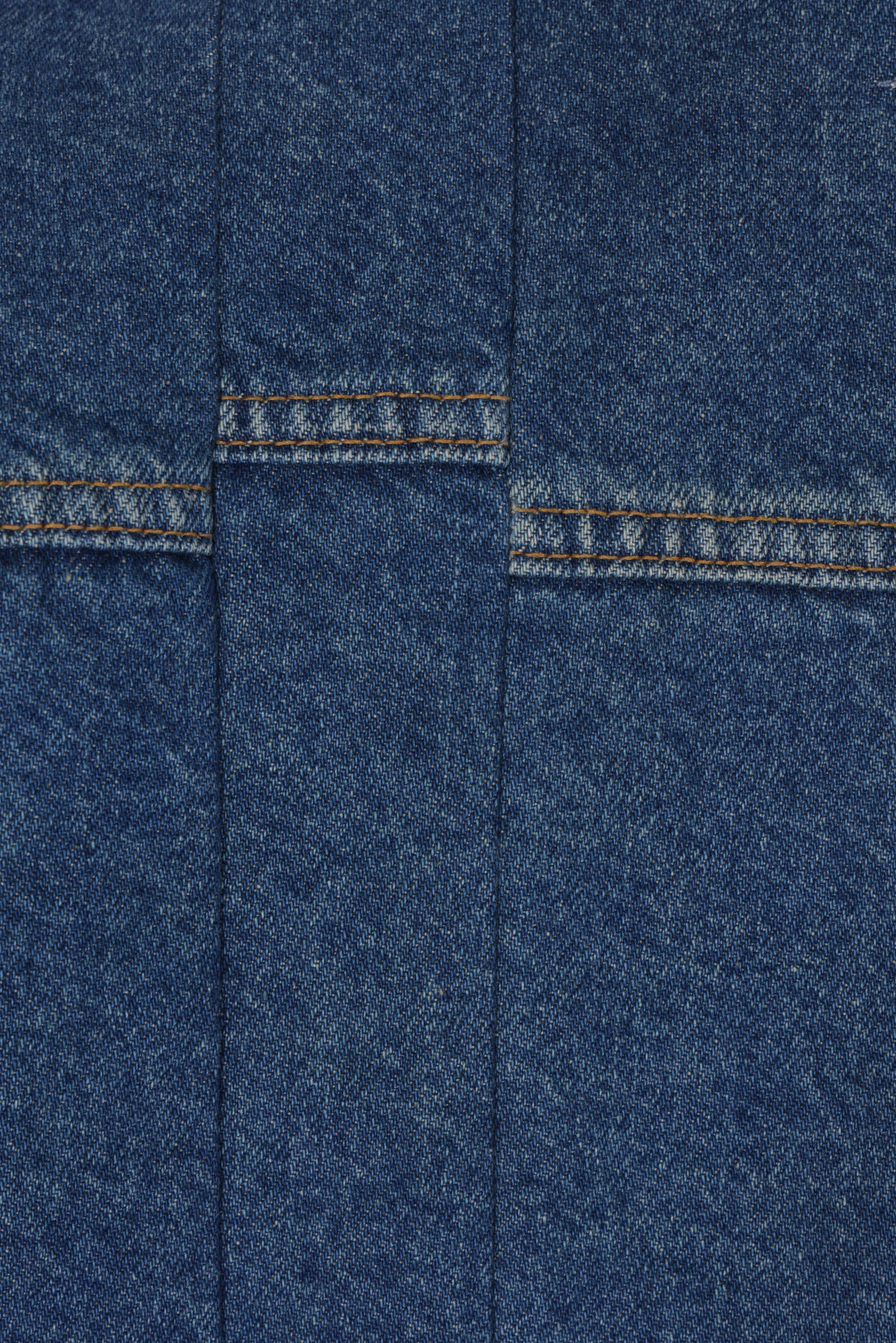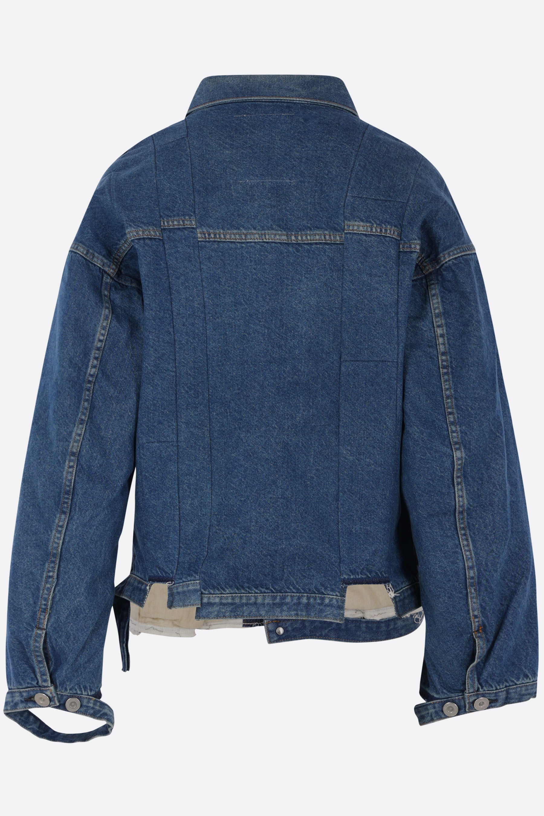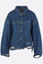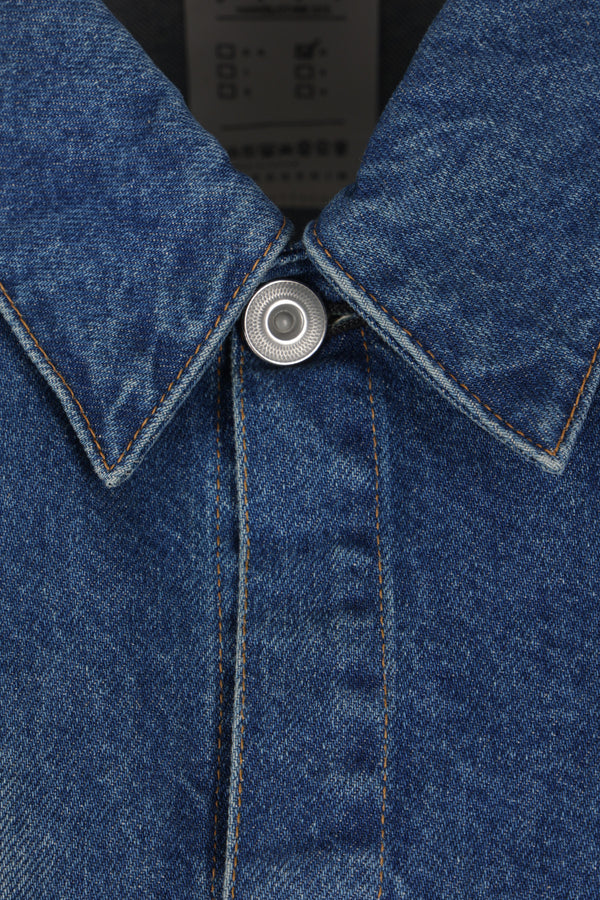 Kuro jacket crafted from indigo cotton denim with a faded finish and distressed details. Featuring a pointed collar, front metal button closure, welt pockets, long sleeves with buttoned cuffs, pleated accents, and a straight hem.