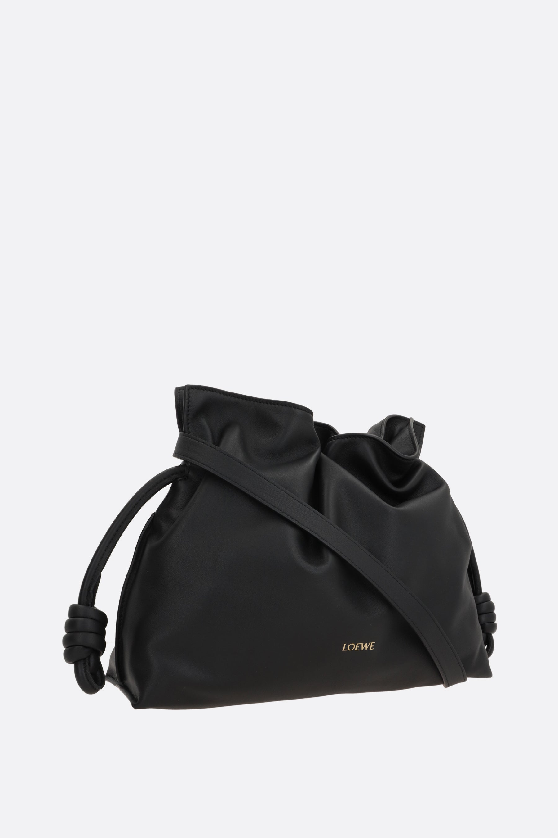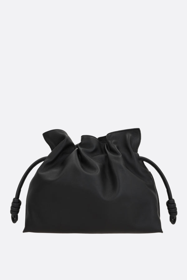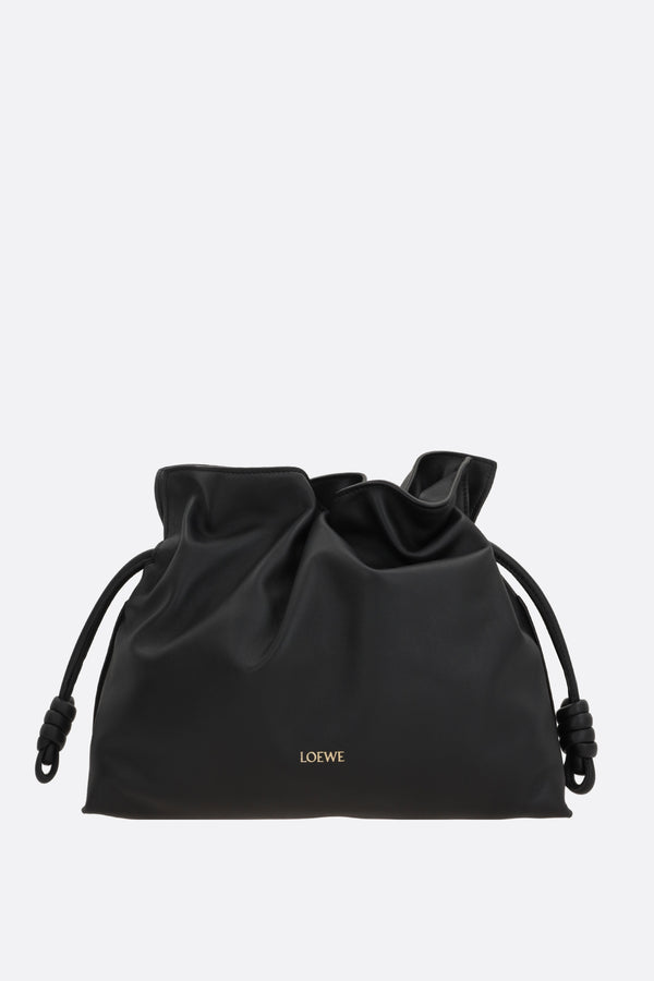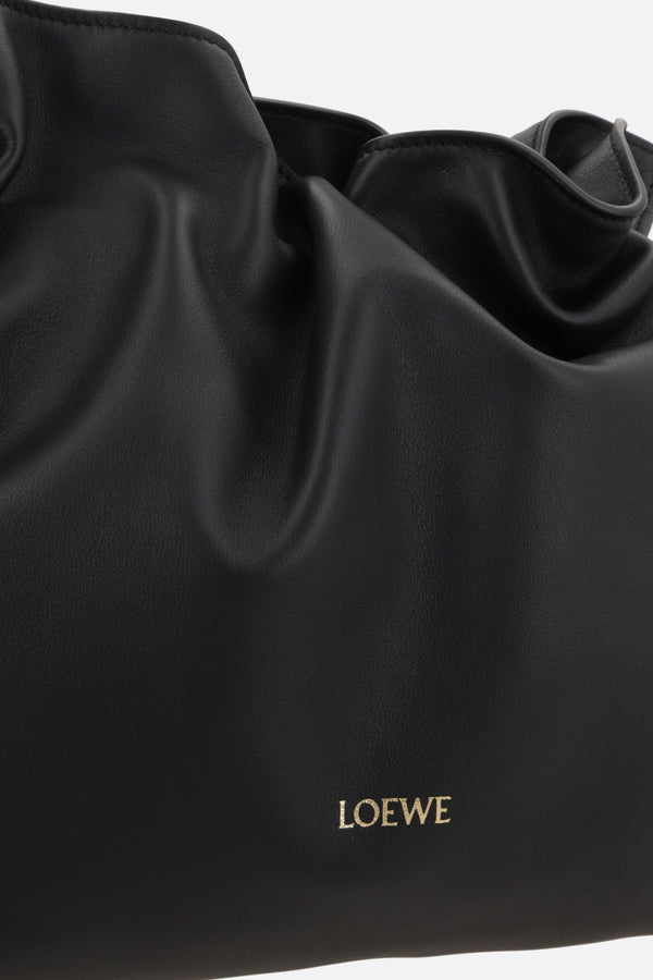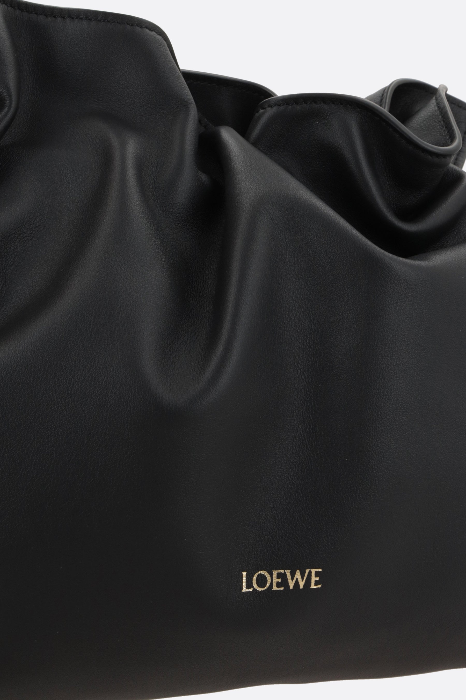 Loewe clutch crafted from black nappa leather. Featuring gold-tone hardware, drawstring closure with internal magnetic button, and an adjustable/removable strap. The interior is lined in light brown suede. The design is finished with the signature embossed logo lettering on the front.