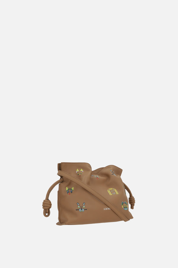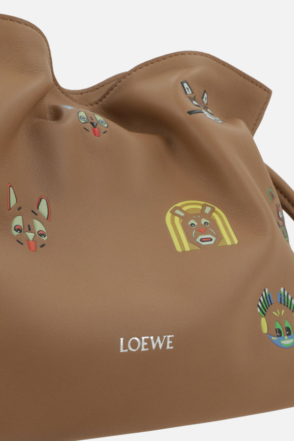 Loewe clutch crafted from light brown nappa leather with all-over 3D cat print. Featuring silver-tone hardware, drawstring and internal magnetic button closure, and an adjustable/removable shoulder strap. The interior is lined with light brown suede. The design is completed with the signature embossed logo lettering on the front.