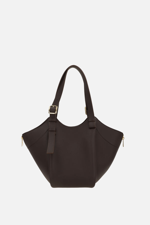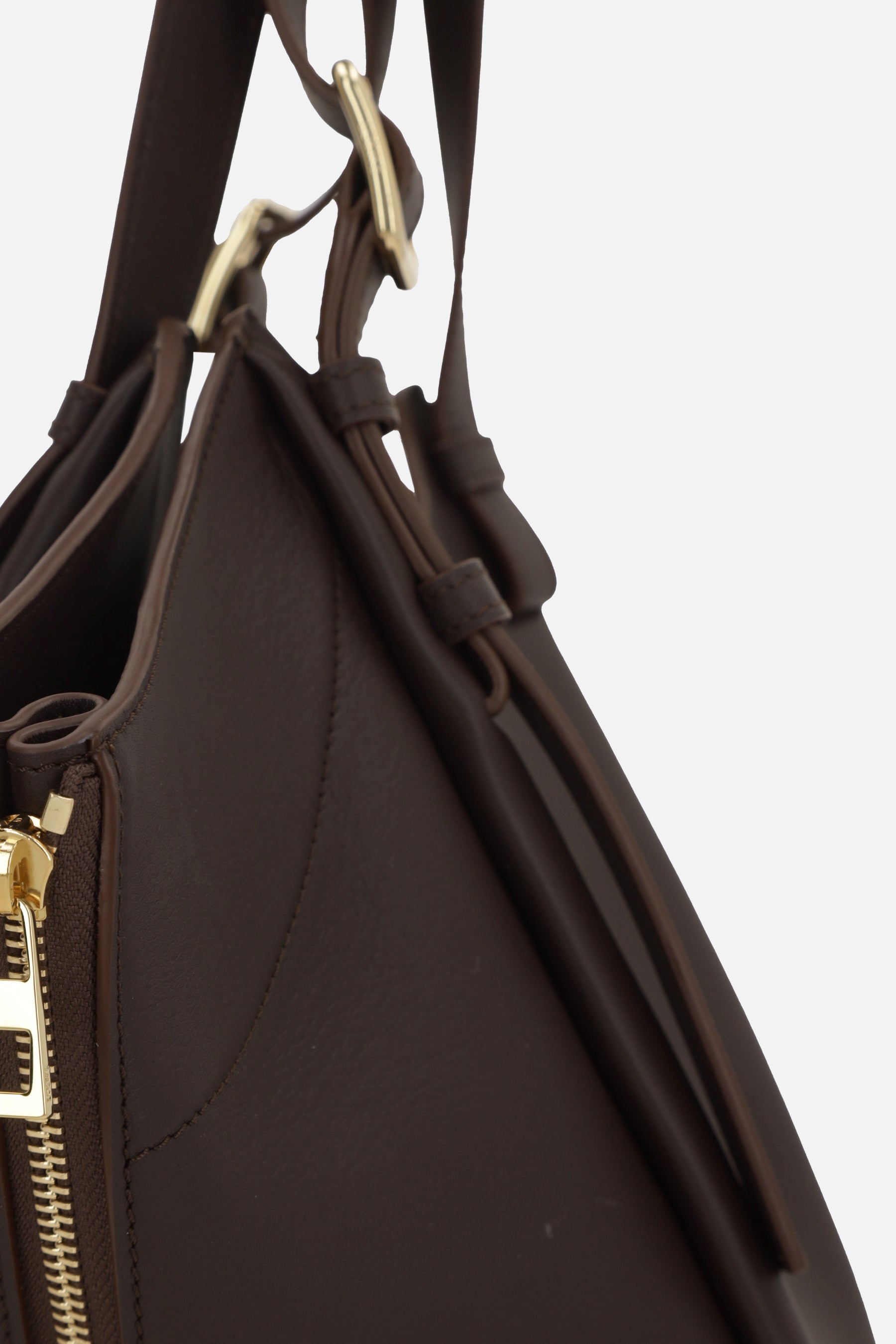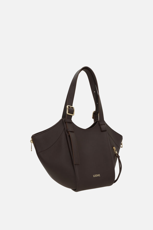 Loewe handbag crafted from dark brown smooth leather with embossed logo lettering on the front. Featuring gold-tone hardware, internal magnetic button closure, adjustable handles, and an adjustable/removable shoulder strap. The interior is lined with brown herringbone canvas and includes two flat pockets. The design is completed with two side zips and a zip pocket.