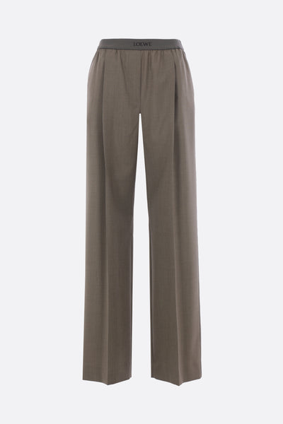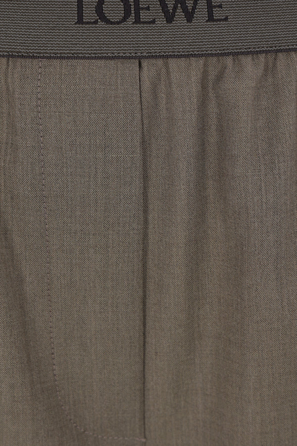 Loewe straight-leg trousers crafted from khaki green mélange wool. Featuring an elasticated waistband with jacquard logo, multiple pockets, front pleats, central crease, and an unlined interior.