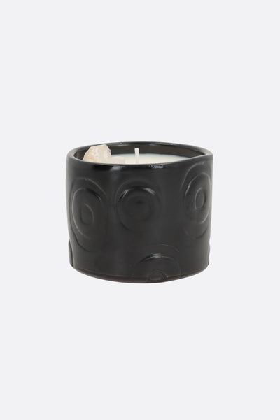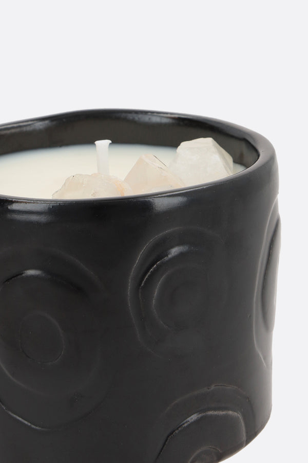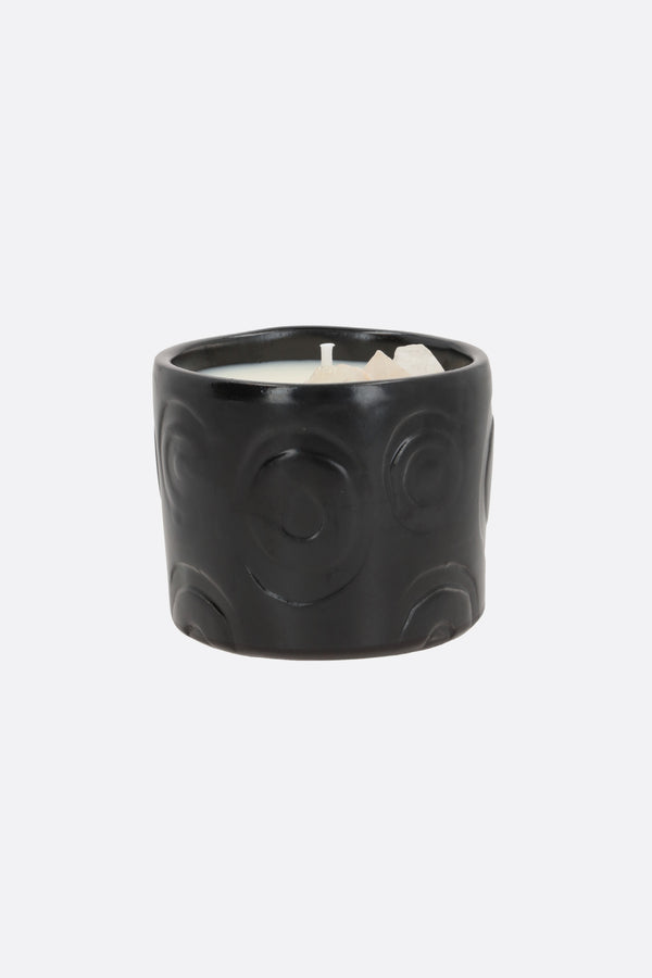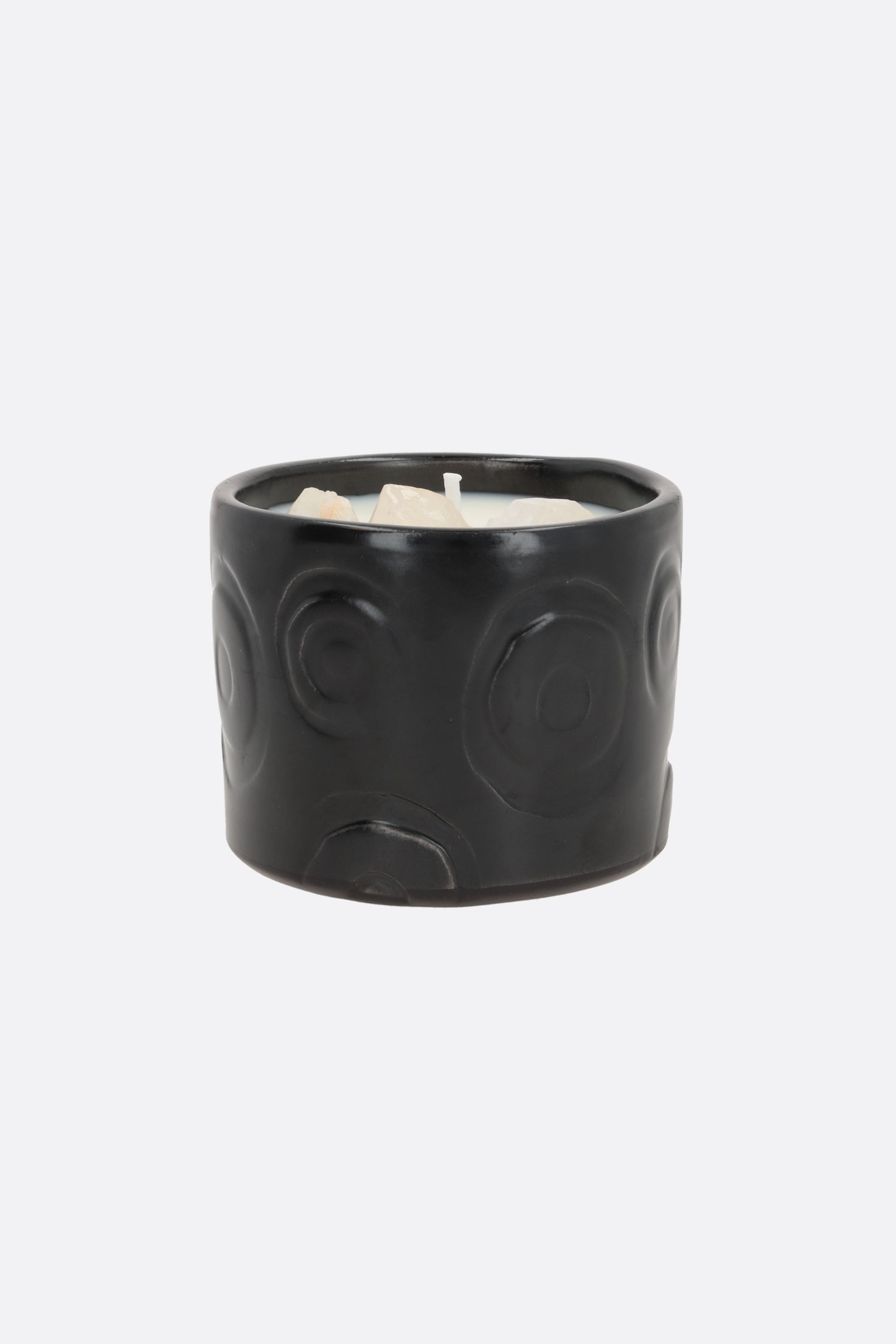 Love & Stones x 10 Corso Como scented candle housed in a handmade black ceramic vessel featuring the signature circle motif. Made from natural soy wax and organic essential oils, it is scented with notes of lavender and geranium and adorned with raw quartz crystals.