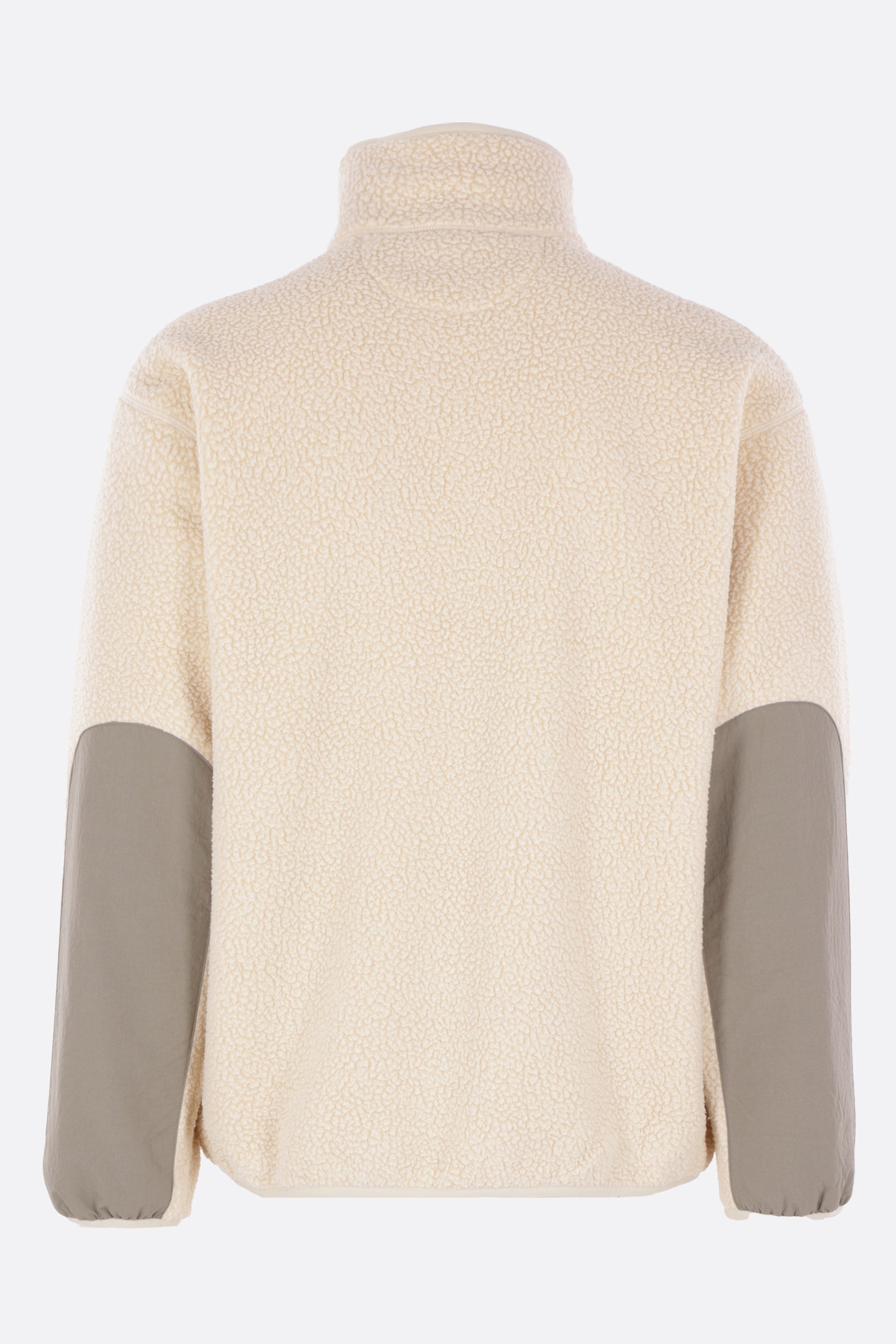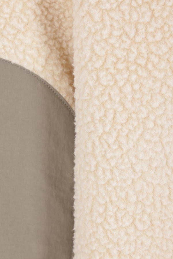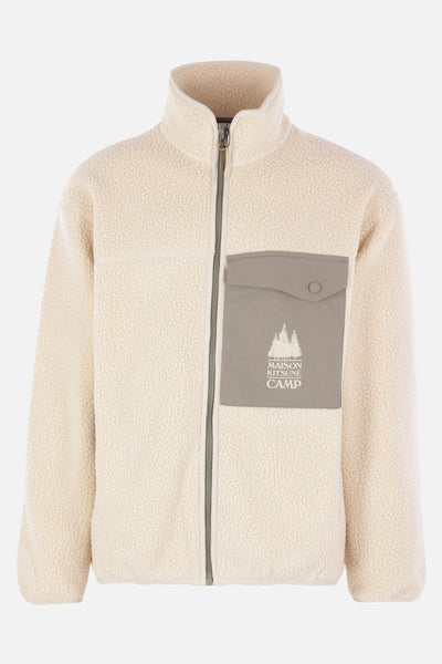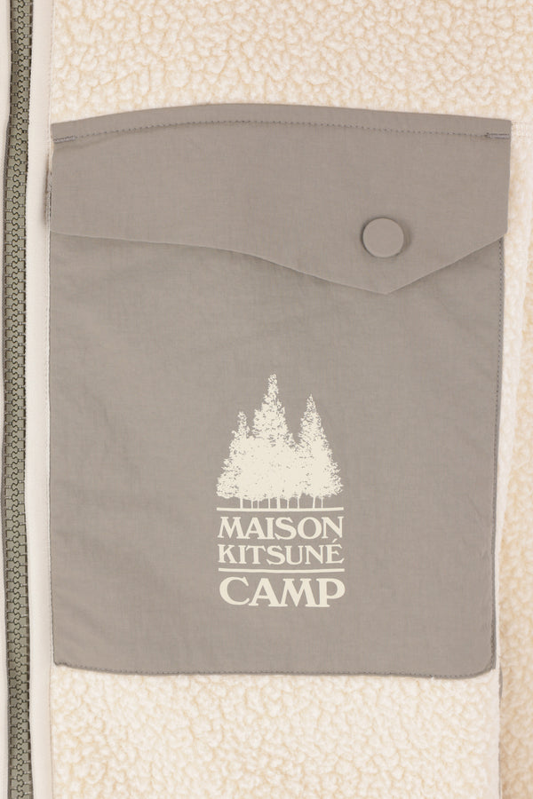 Maison Kitsuné jacket made of ecru fleece with sage green nylon details. It features a high collar, front zip closure, multiple pockets, long sleeves, and elasticated edges. The design is completed by the “Maison Kitsuné Camp” print on the chest pocket.