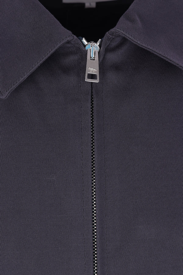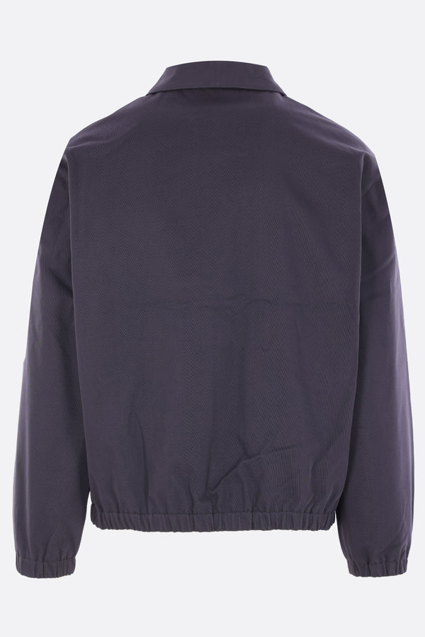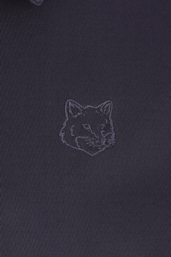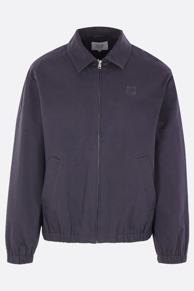 Maison Kitsuné jacket crafted from grey cotton gabardine with a Bold Fox Head embroidery on the chest. It features a pointed collar, front zip closure, welt pockets, long sleeves, elasticated cuffs, and a lined interior.