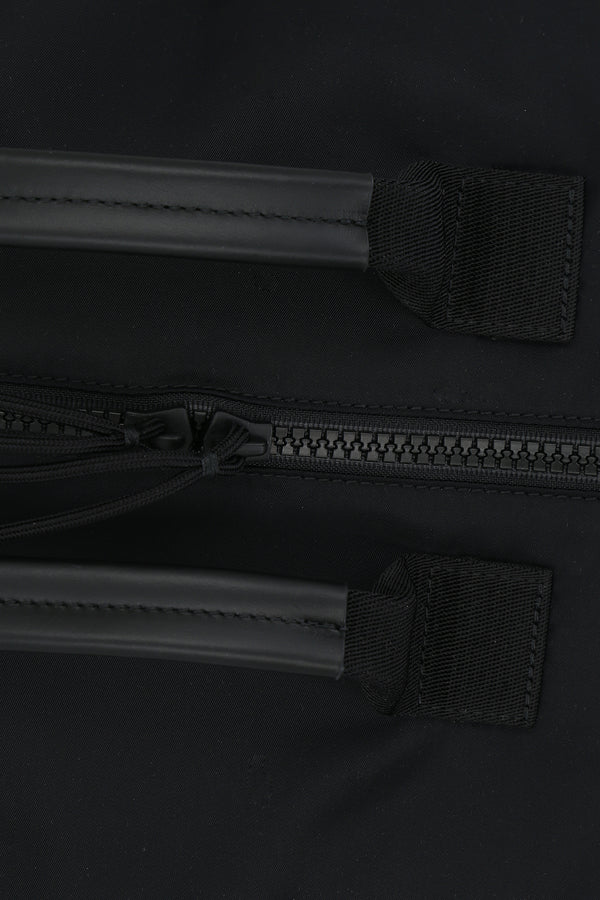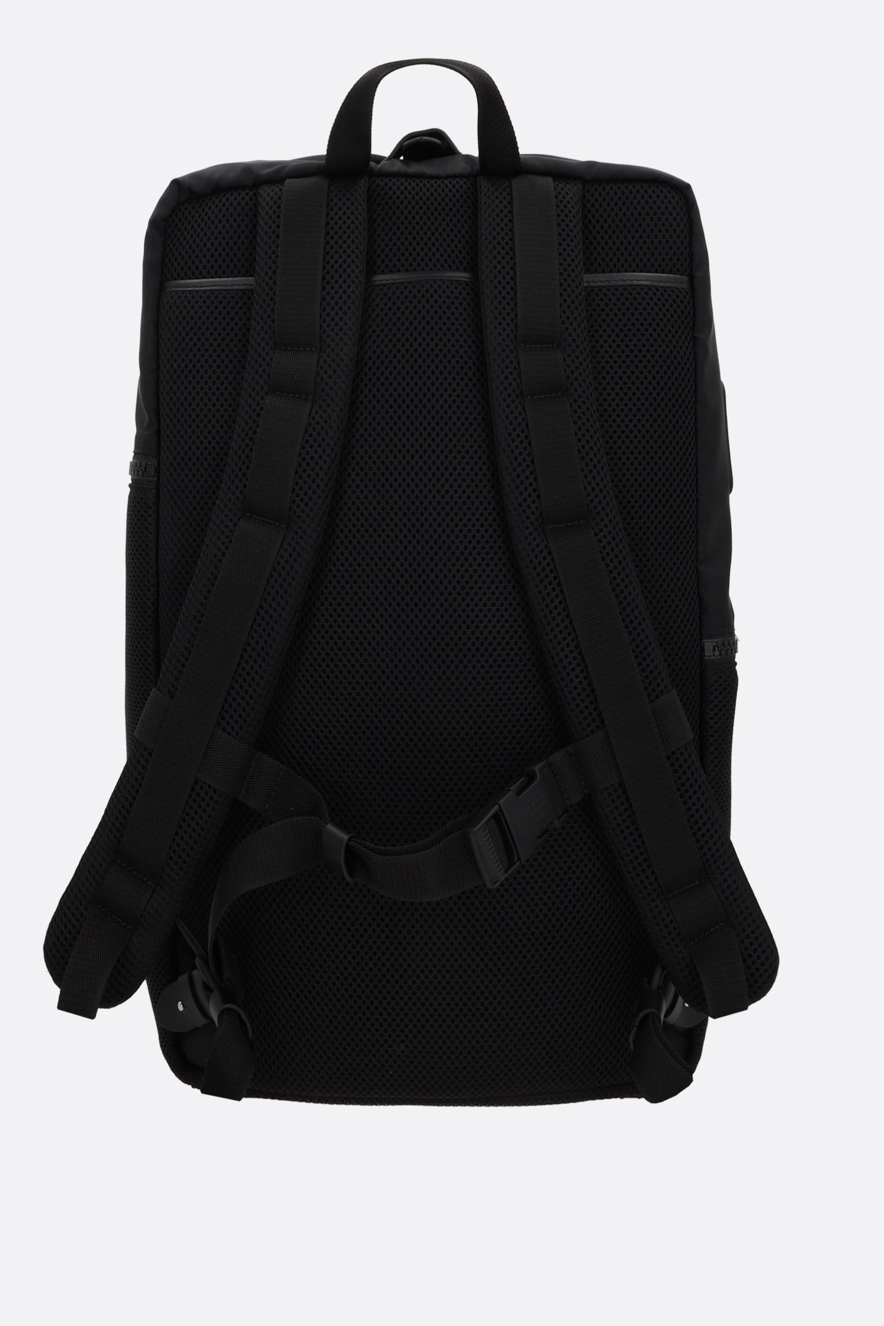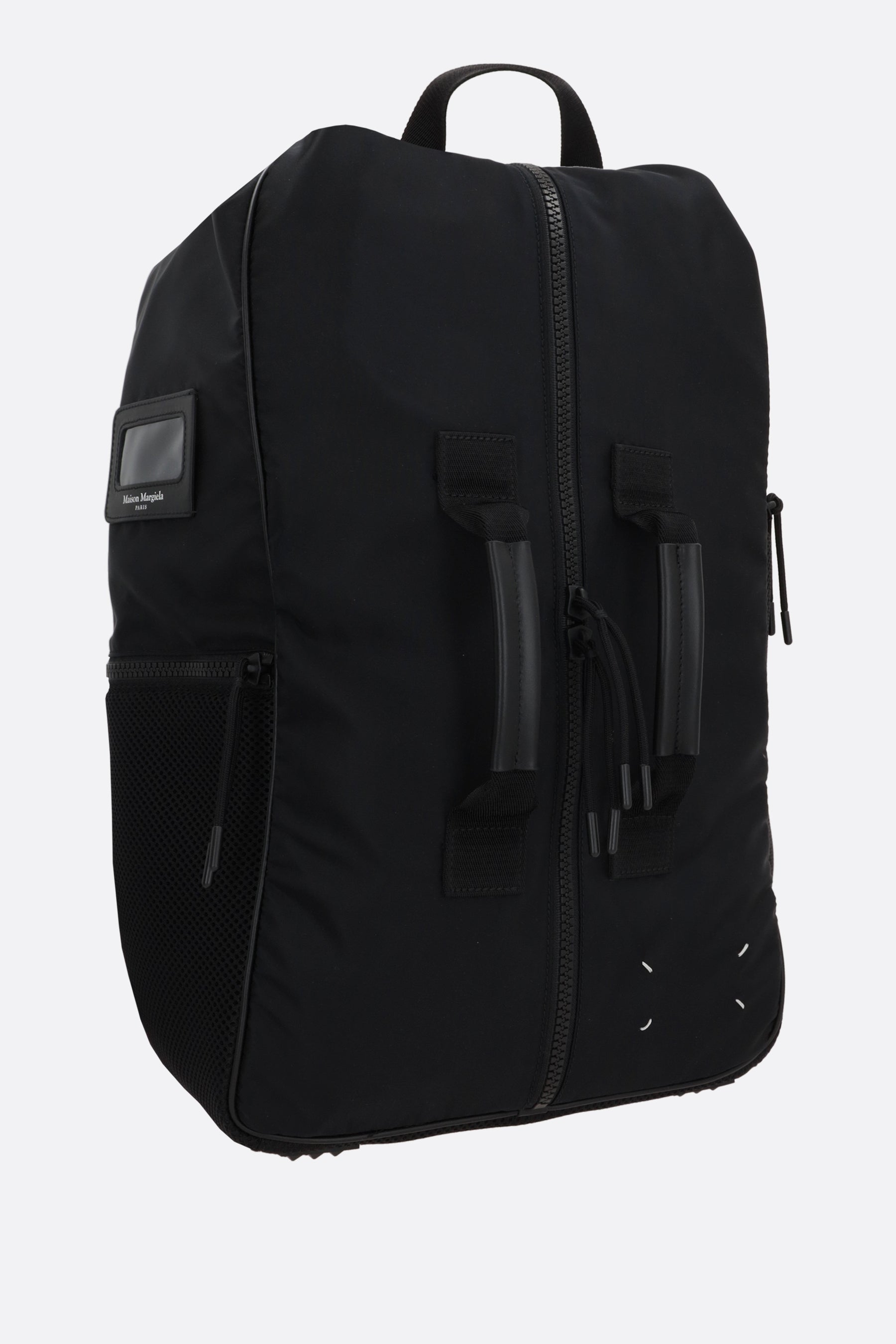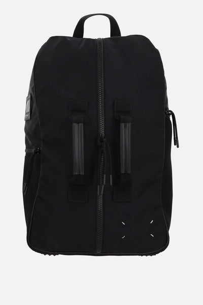 Maison Margiela backpack made of black nylon with tone-on-tone smooth leather details. Featuring black hardware, a front double-zip closure, top handle, front straps, adjustable shoulder straps, and rubber protective feet. The black nylon-lined interior includes a laptop compartment. The design is completed with external pockets and Maison's signature four front stitches.