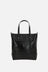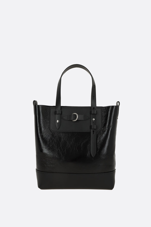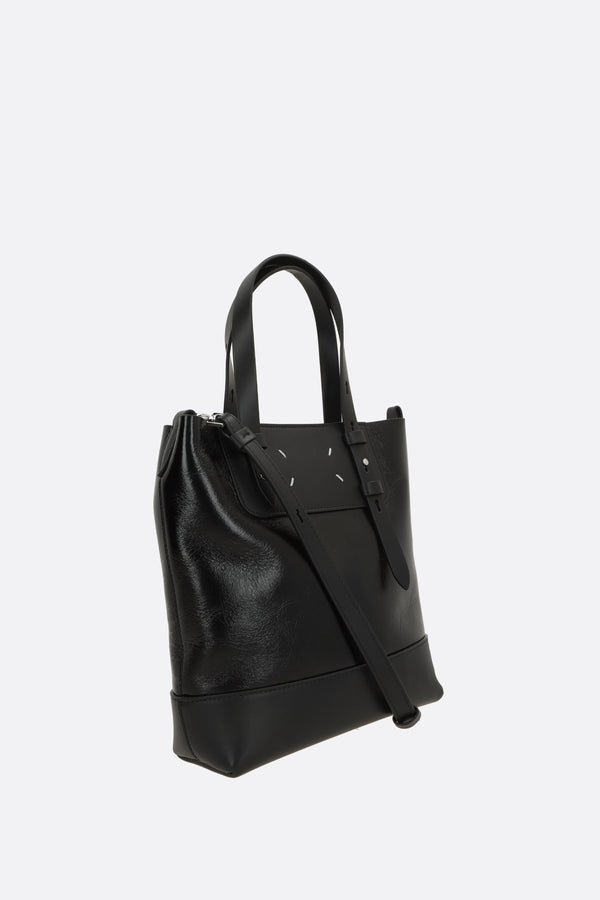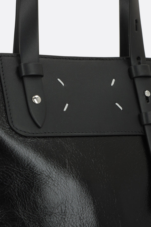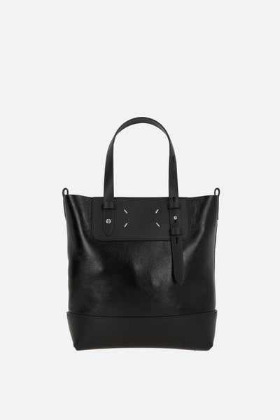 Maison Margiela shopping bag crafted from black glossy crackled leather with smooth leather details. It features silver-tone hardware, an internal magnetic button closure, adjustable handles, and an adjustable, removable strap. The interior is lined with tone-on-tone suede. The design is completed by the Maison's signature four stitches and a D-ring on the back.