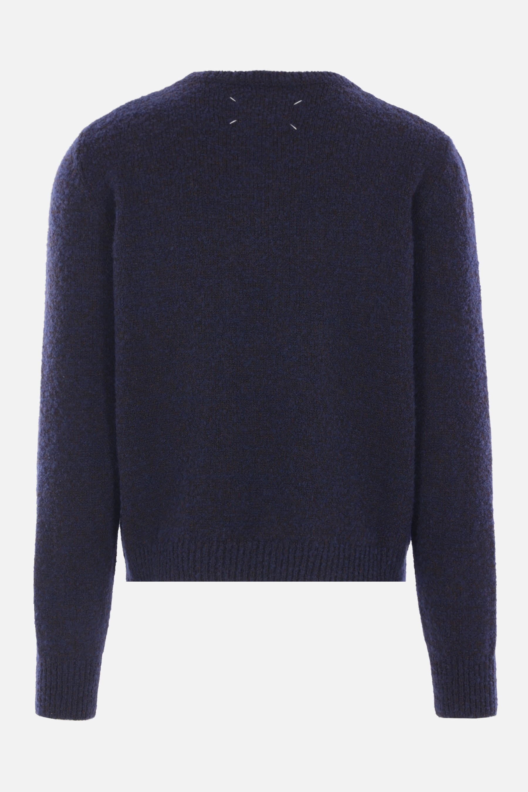 Maison Margiela sweater made of blue wool-blend knit with a brushed finish and gradient dye effect. Features a crew neckline, long sleeves, and ribbed trims. The design is completed by the Maison's signature four stitches on the back.