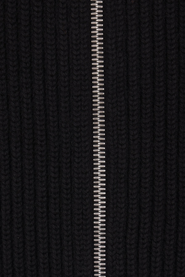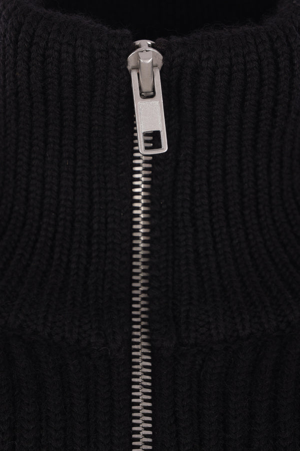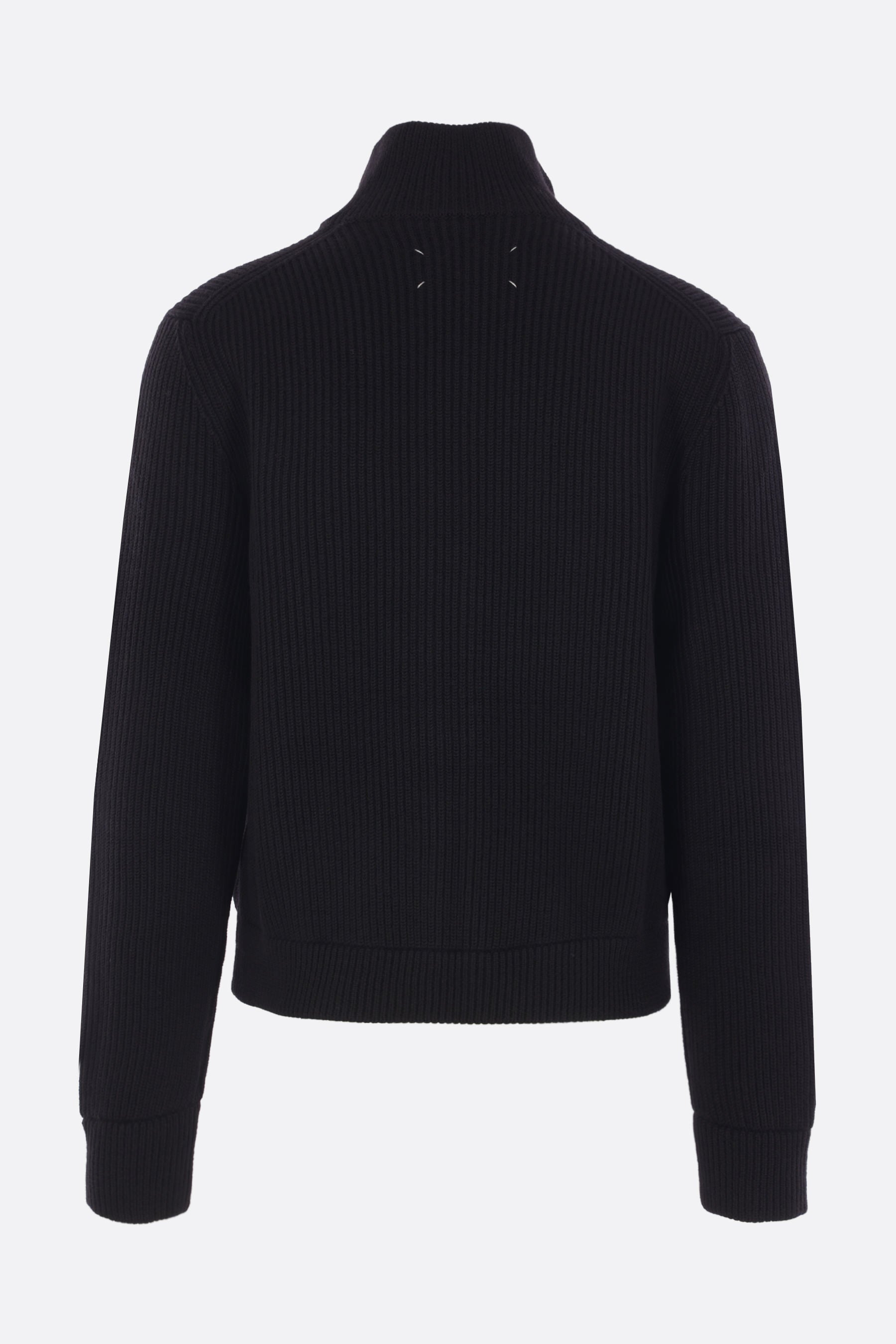 Maison Margiela cardigan crafted from black ribbed wool knit. Featuring a high collar, front closure with a two-way zipper, long sleeves, and a straight hem. The design is completed with the Maison's signature four stitches on the back.