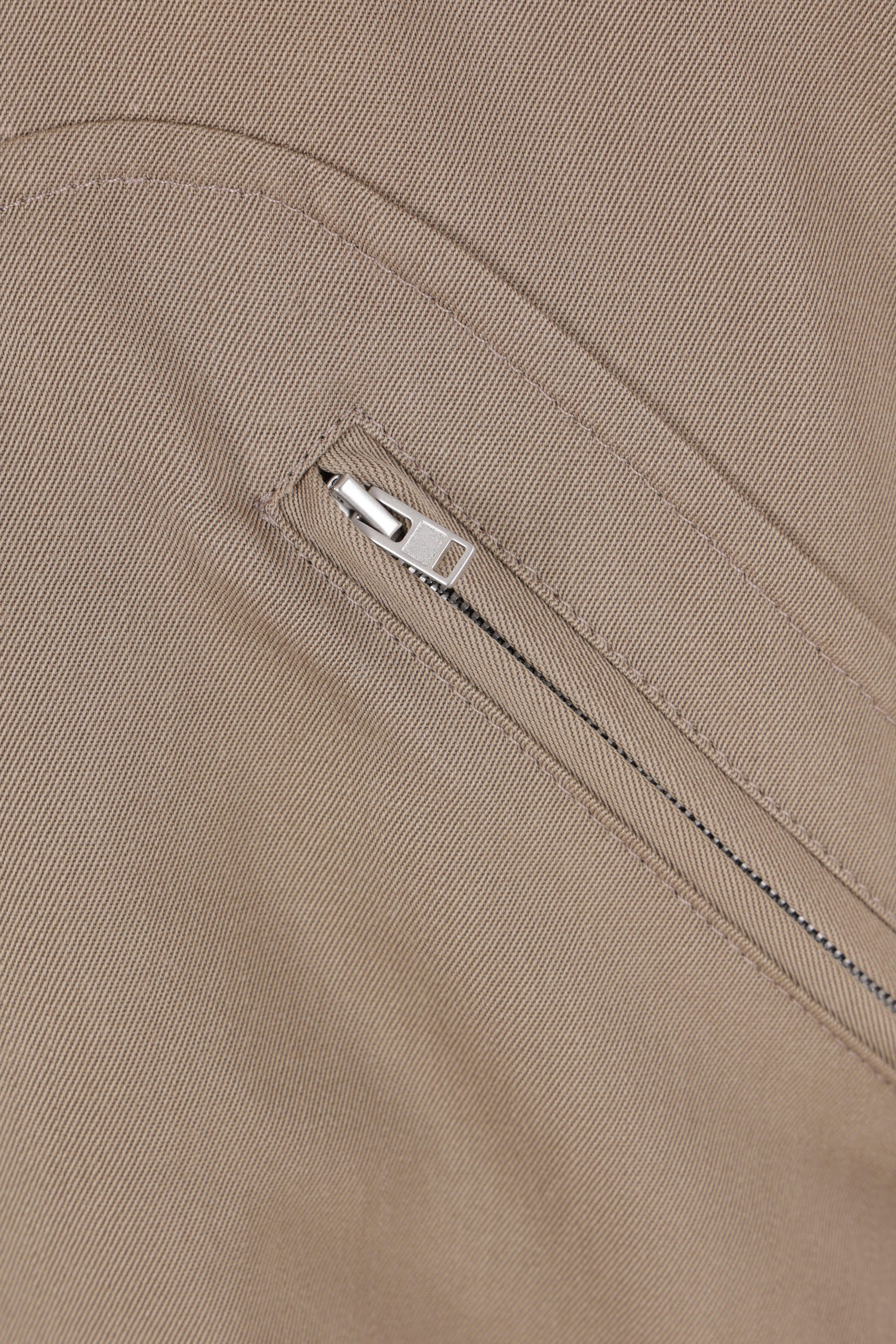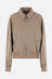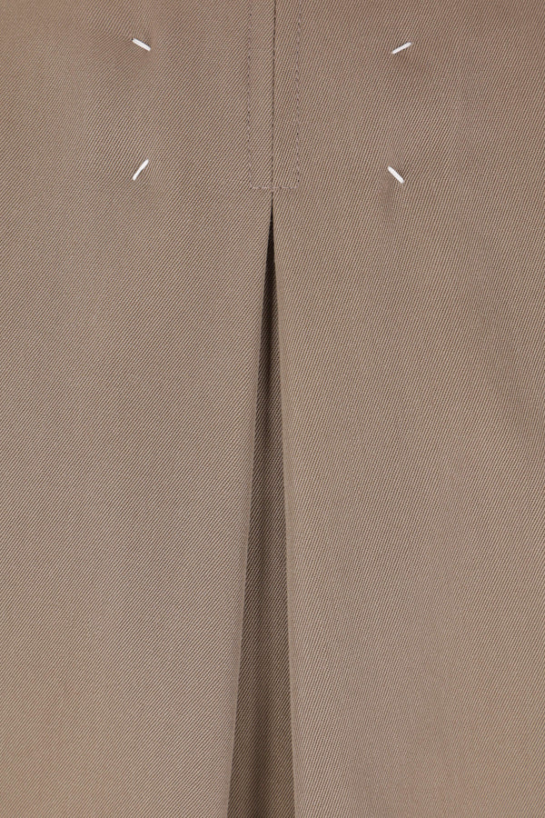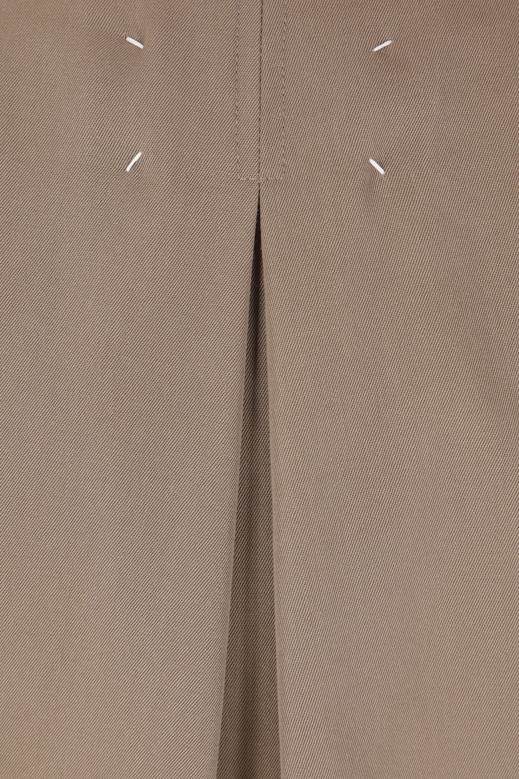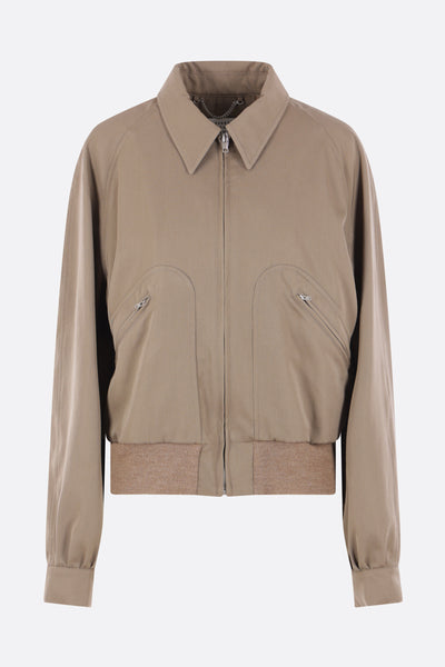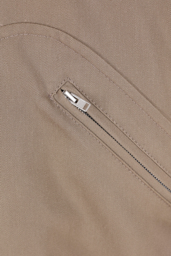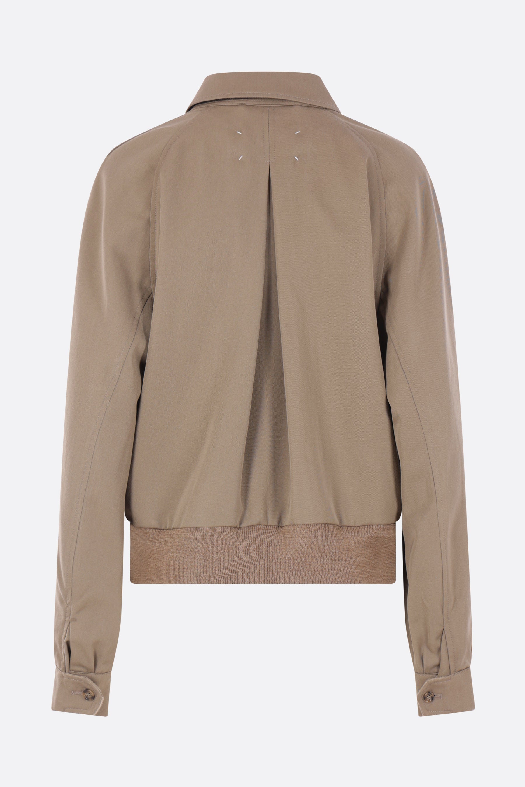 Maison Margiela jacket crafted from dark sand wool gabardine. Featuring a pointed collar, front zip closure, zip pockets, raglan long sleeves, a back inverted pleat, and ribbed knit edges. Partially lined interior. The design is completed with Maison Margiela's signature four back stitches.
