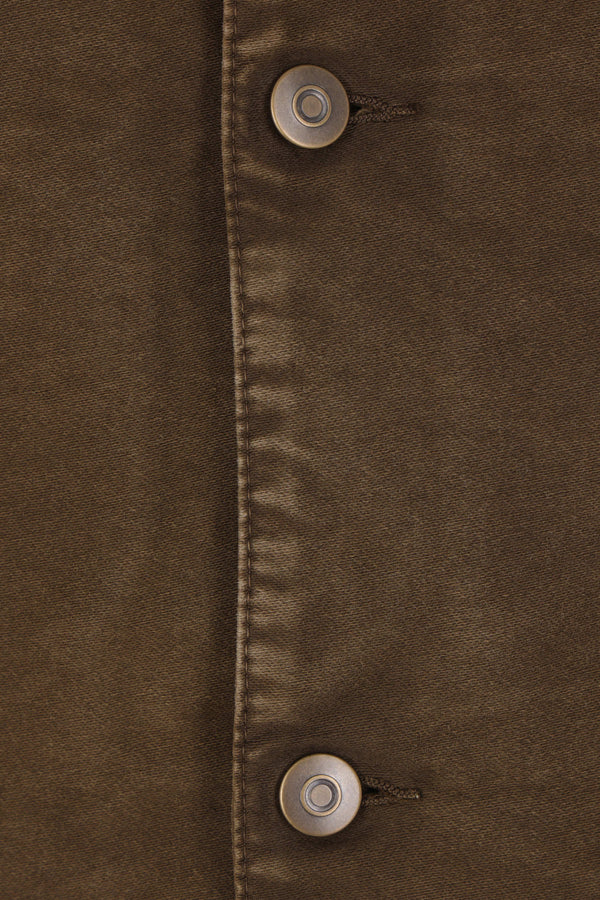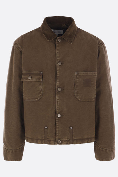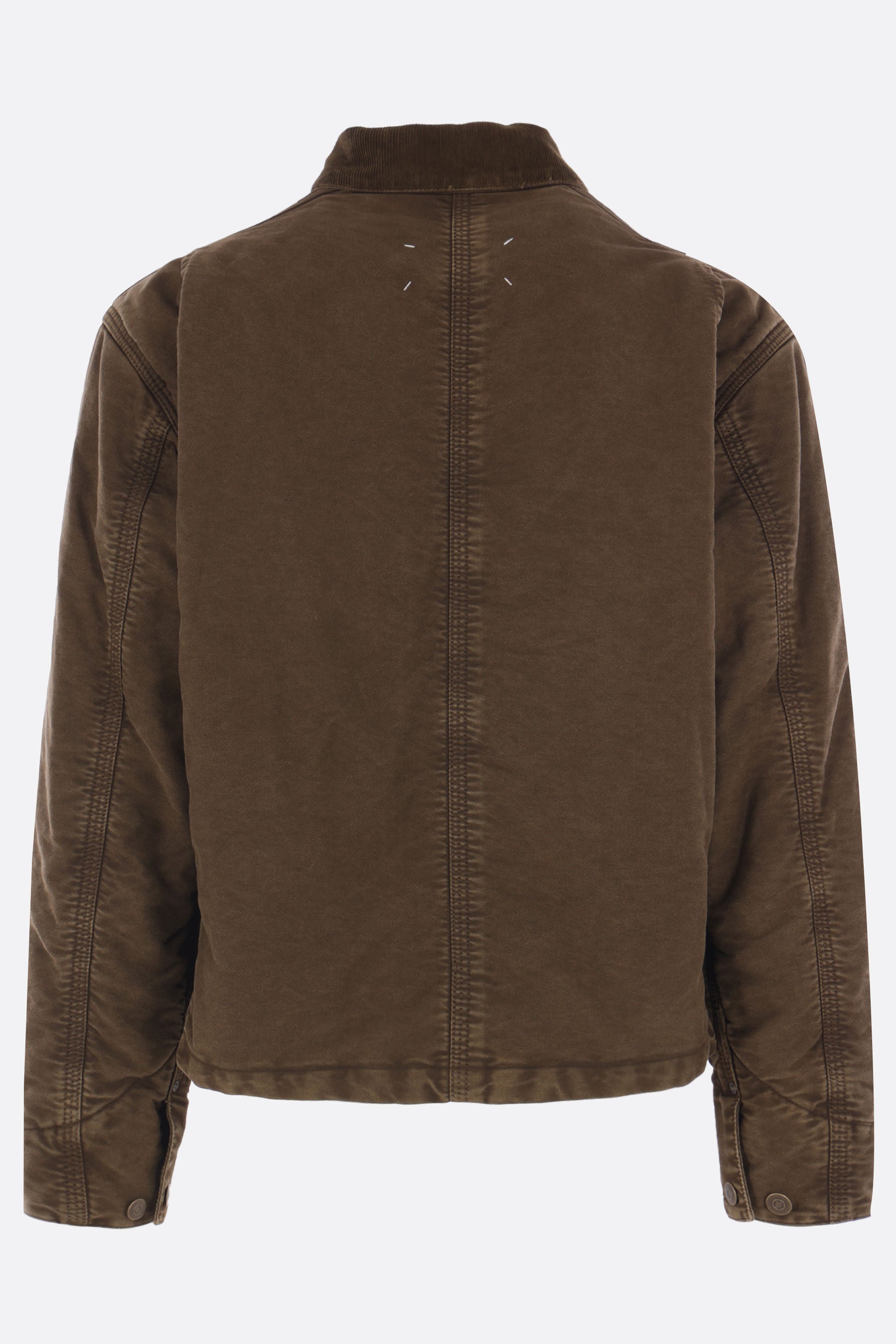 Maison Margiela padded jacket crafted from brown cotton corduroy with “memory of” details. Featuring a pointed corduroy collar, front closure with metal buttons, chest pockets, long sleeves with buttoned cuffs, and a straight hem. The design is completed with the Maison's signature four stitches on the back.