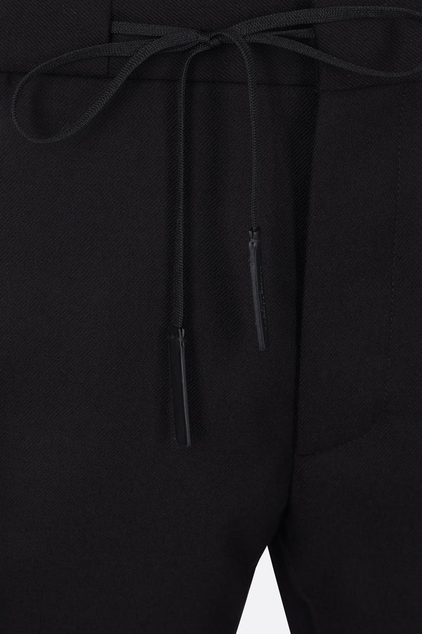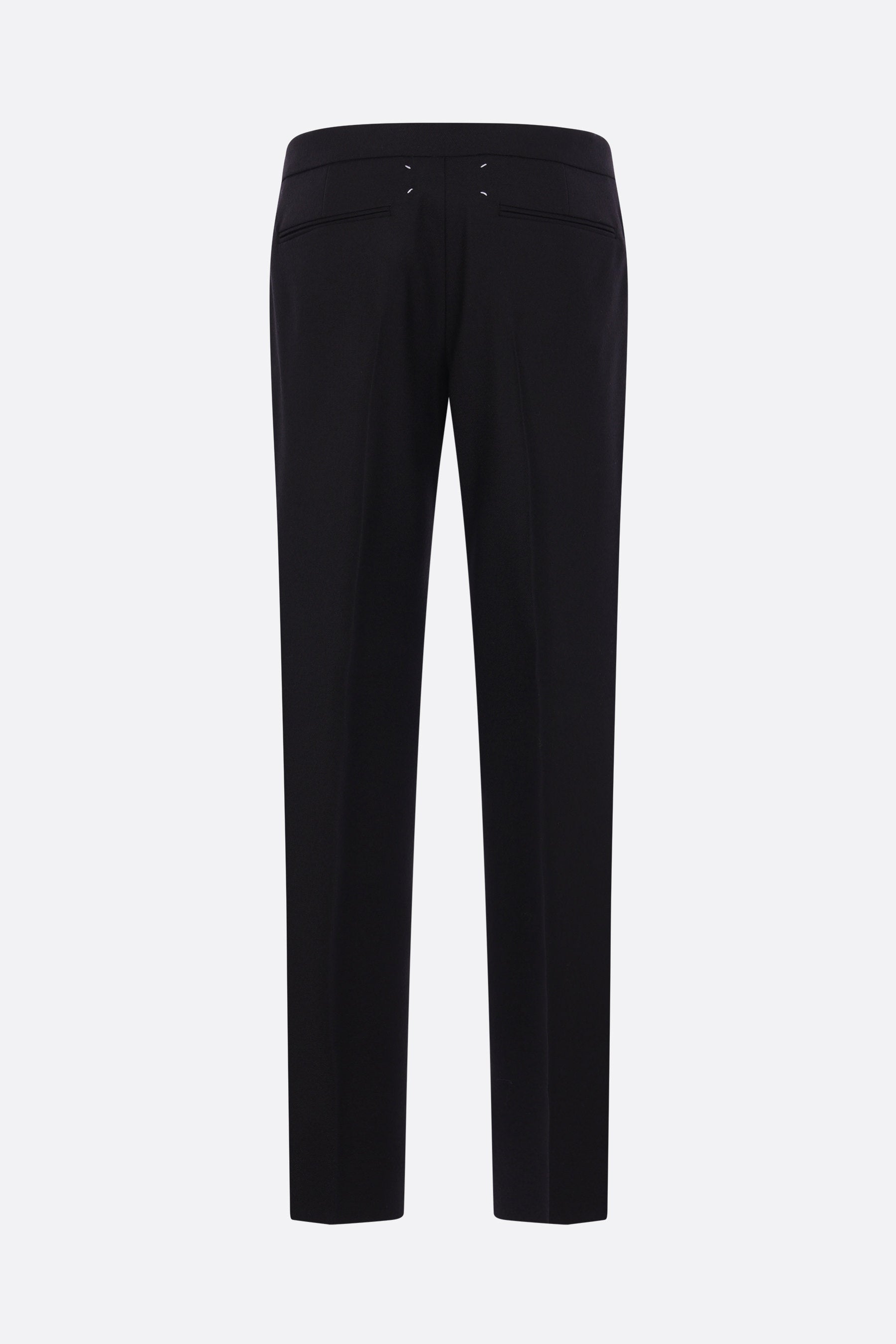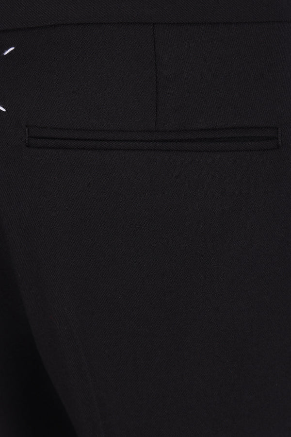 Maison Margiela straight-leg trousers crafted from black wool. They feature a front button and zip closure, a drawstring waistband, multiple pockets, a center crease, and an unlined interior. The design is completed by the Maison's signature four stitches on the back.