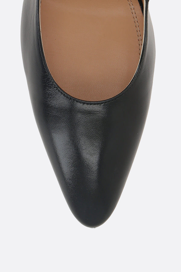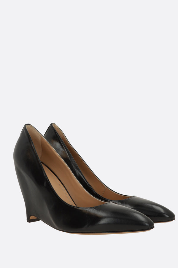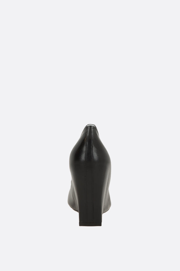 Maison Margiela wedge pumps crafted from smooth black leather. Features a pointed toe, leather lining, and a leather sole. Completed with a straight white stitch on the back.