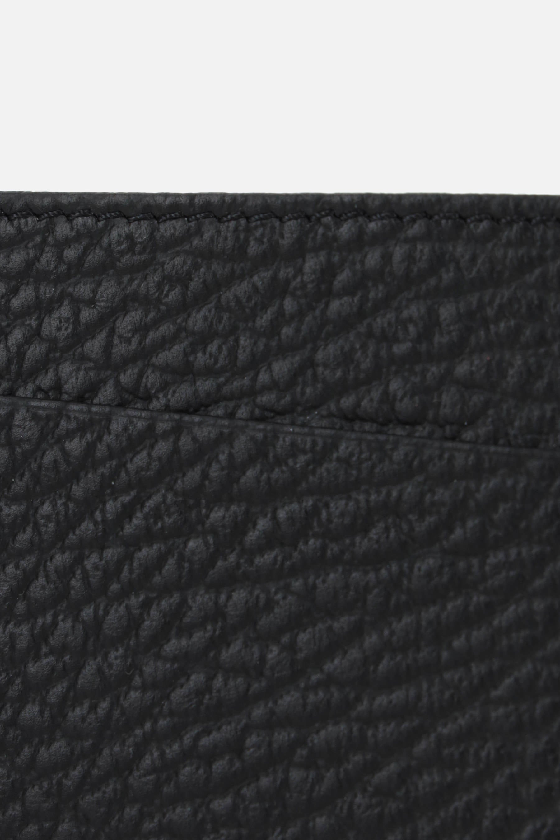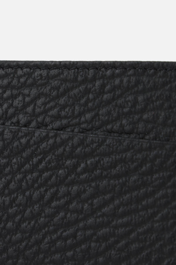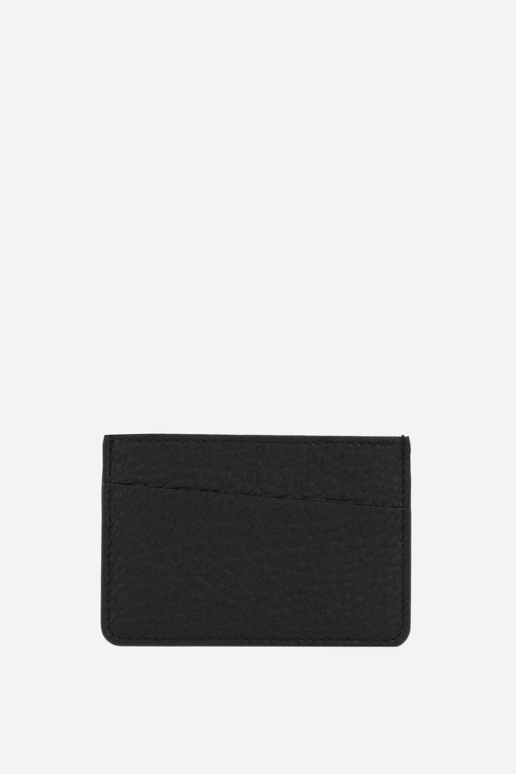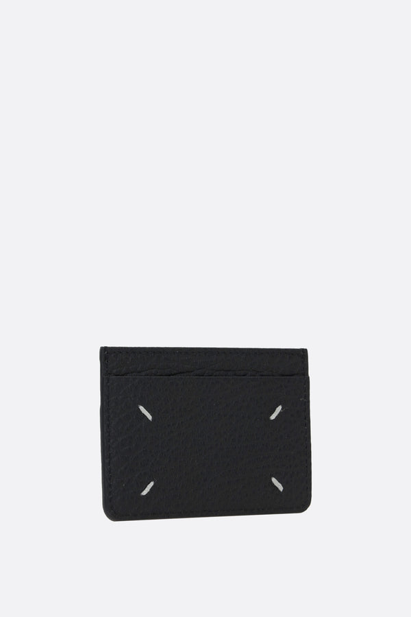 Maison Margiela credit card holder made of black grained leather. The fabric-lined interior features a central compartment and two card slots. The design is completed with Maison's signature stitching on the front.