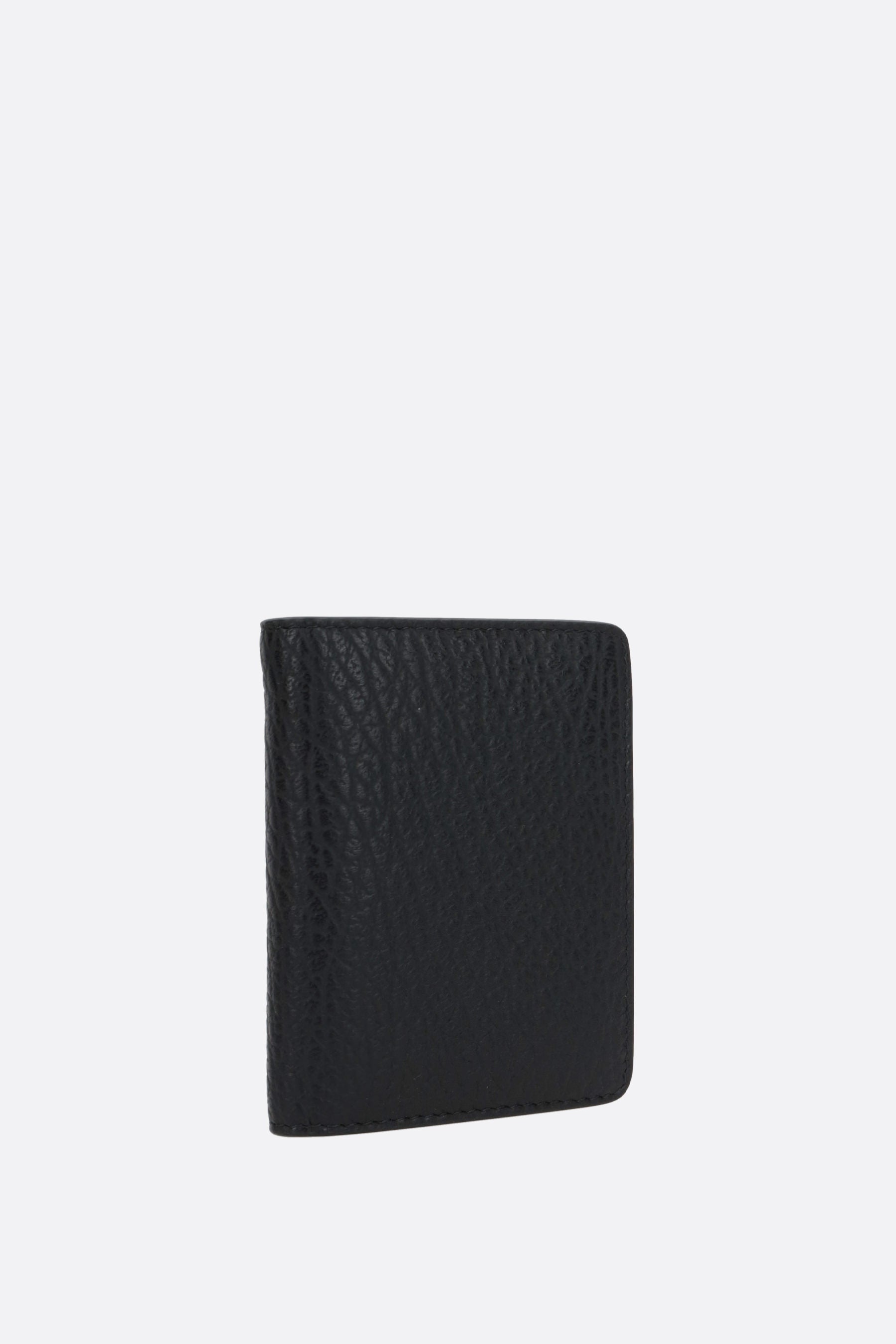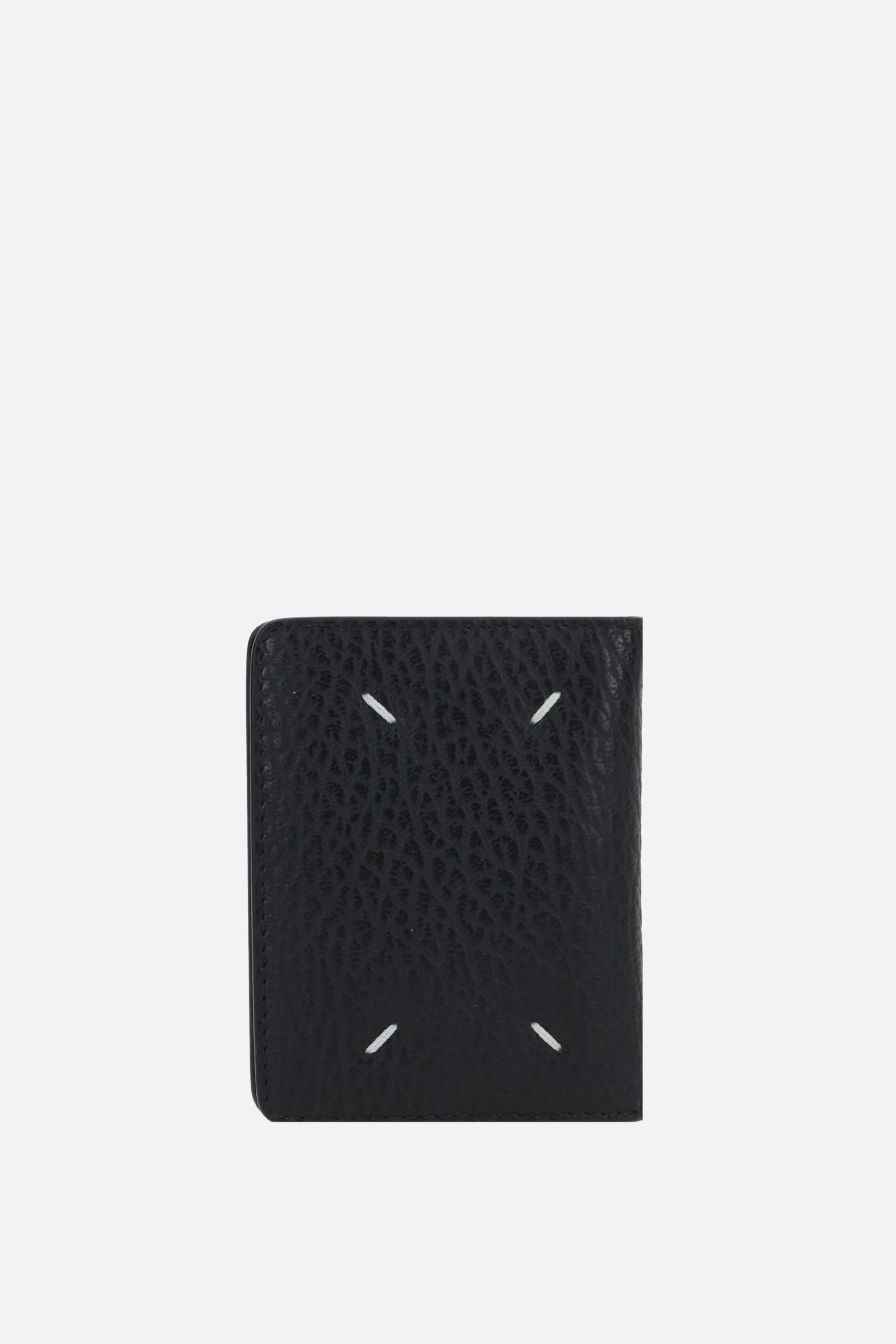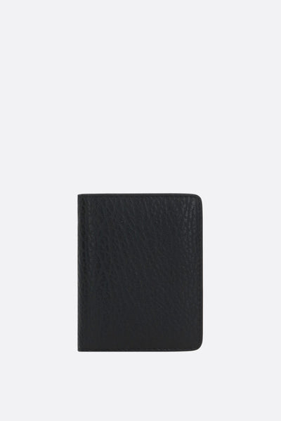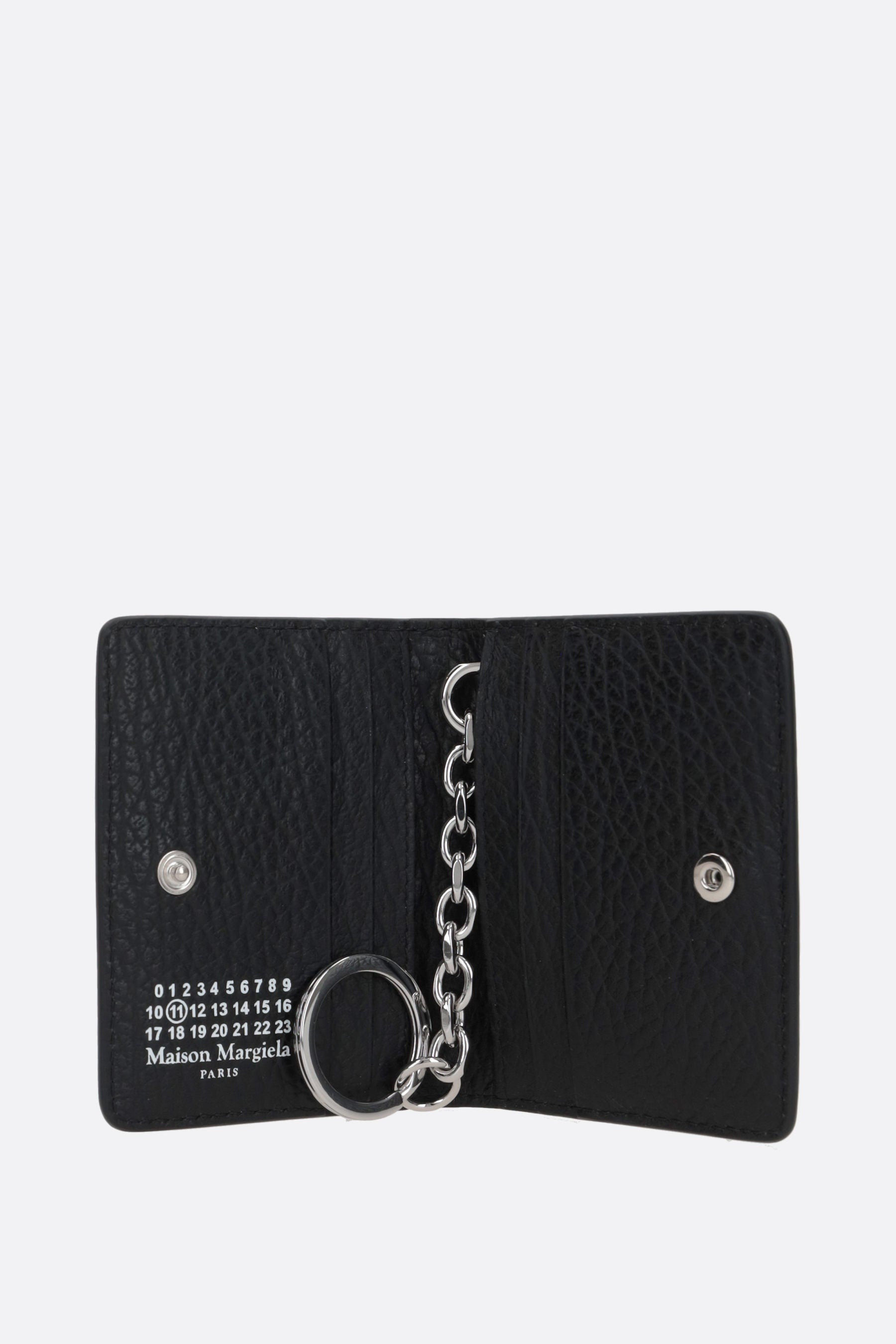 Maison Margiela credit card holder made of black grained leather. Featuring silver-tone hardware and an internal snap-button closure. The interior, lined in leather and fabric, includes six card slots and a keyring with chain. The design is completed with Maison's signature stitching on the back.