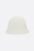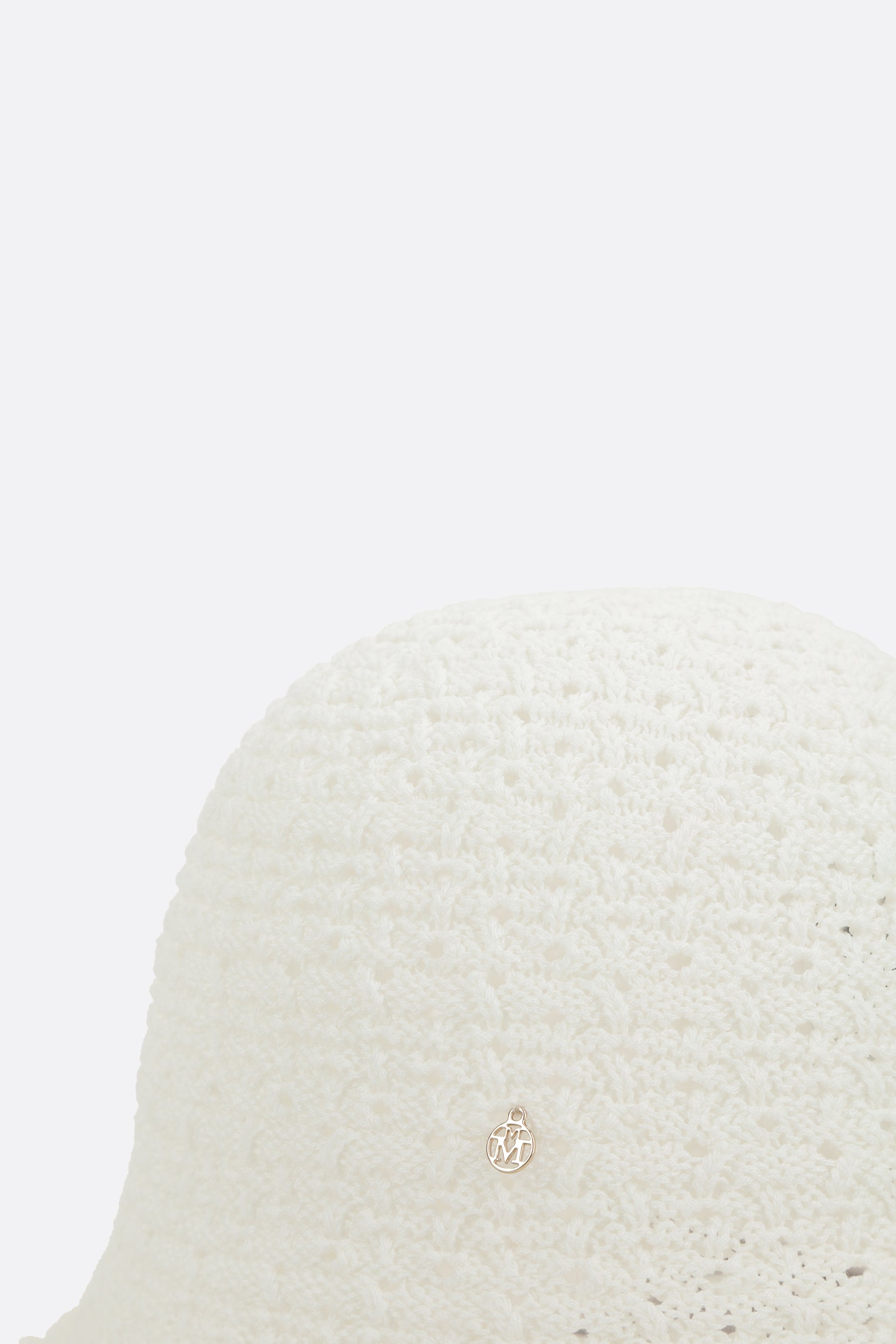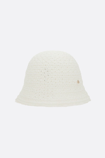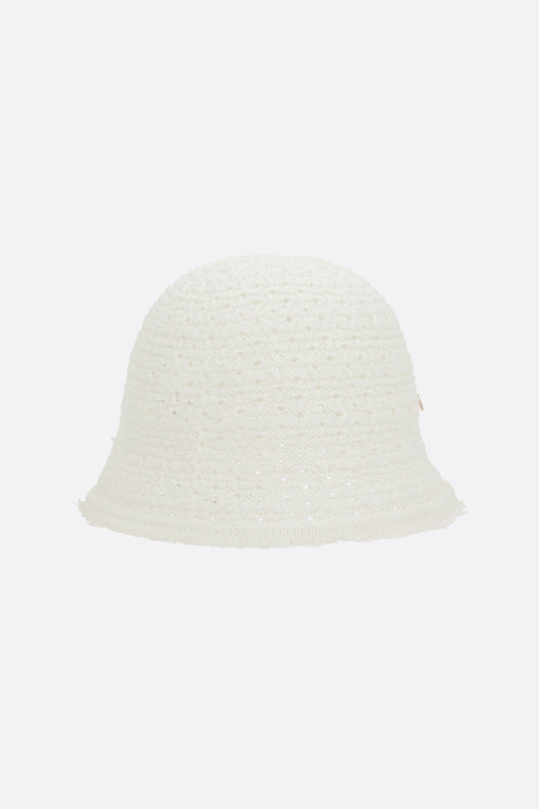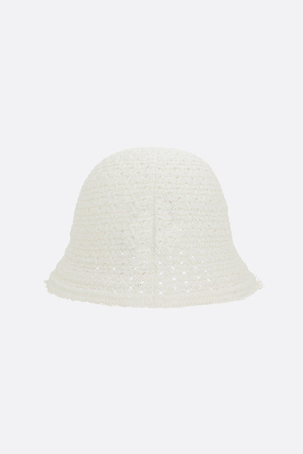 Maison Michel bucket hat crafted in white cotton-blend openwork knit, featuring frayed edges and a metal logo.