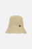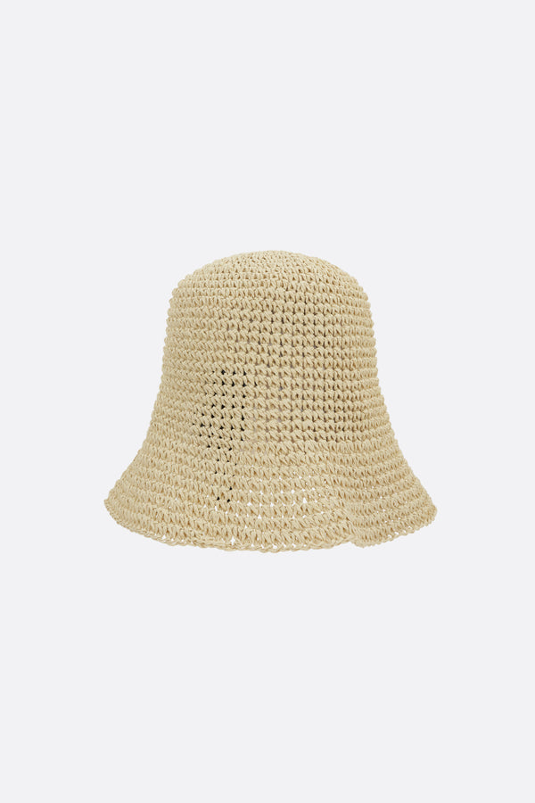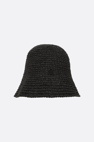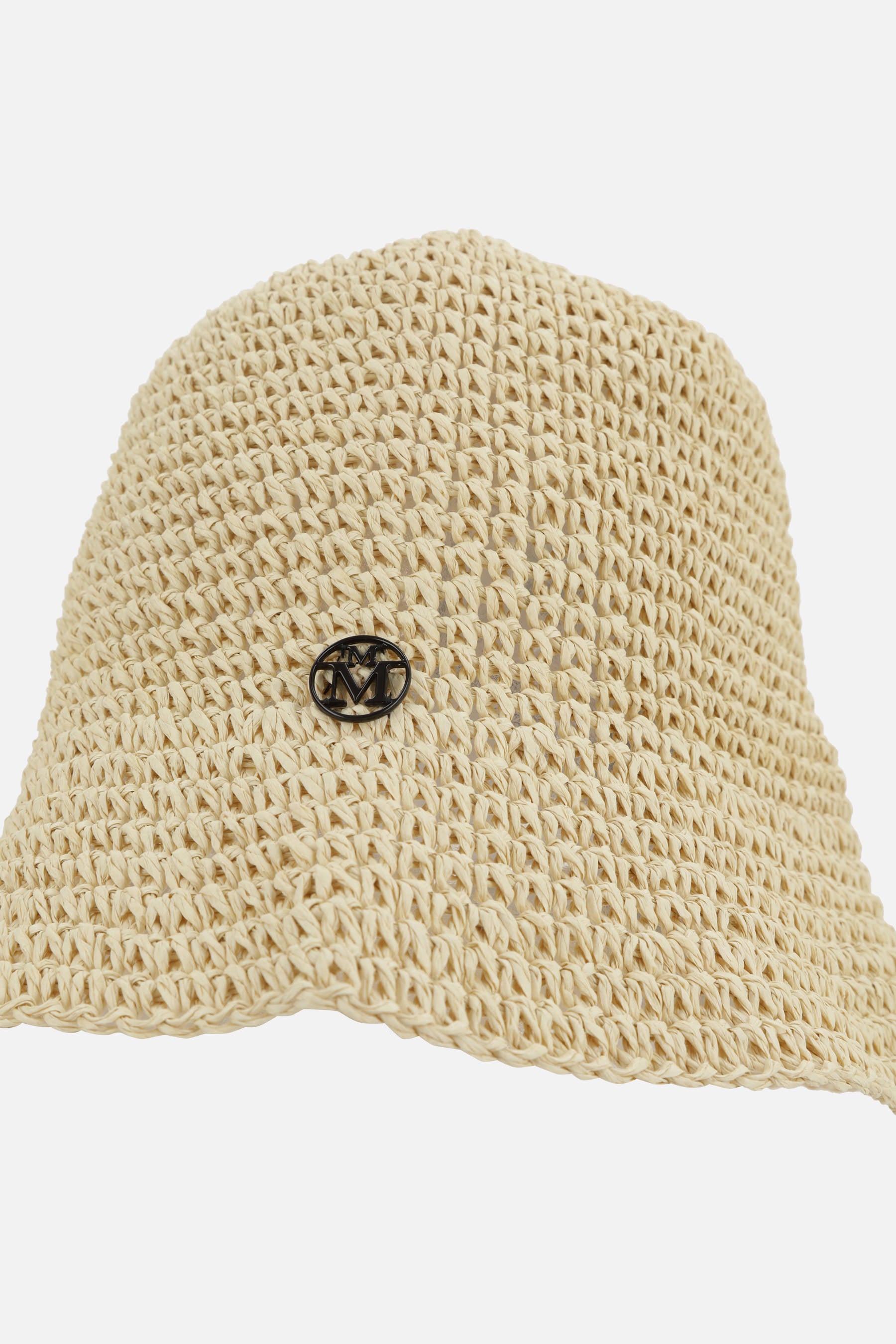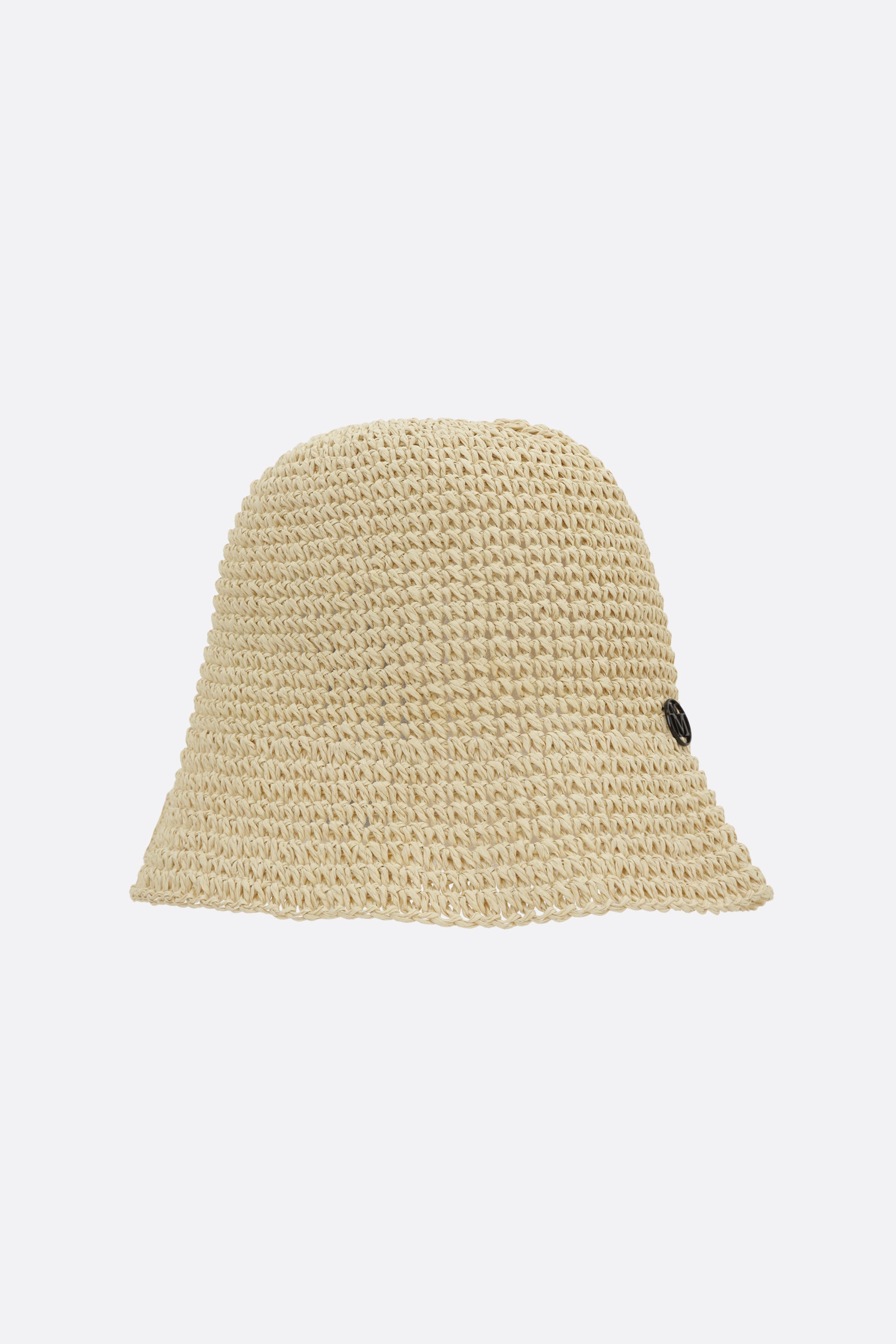 Maison Michel bucket hat crafted from natural-colored straw crochet, featuring an enamel metal logo.