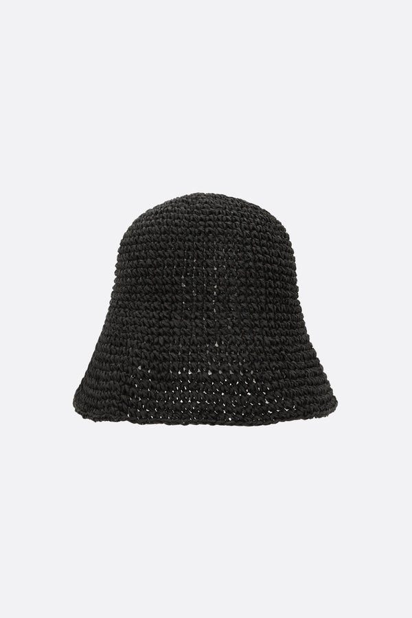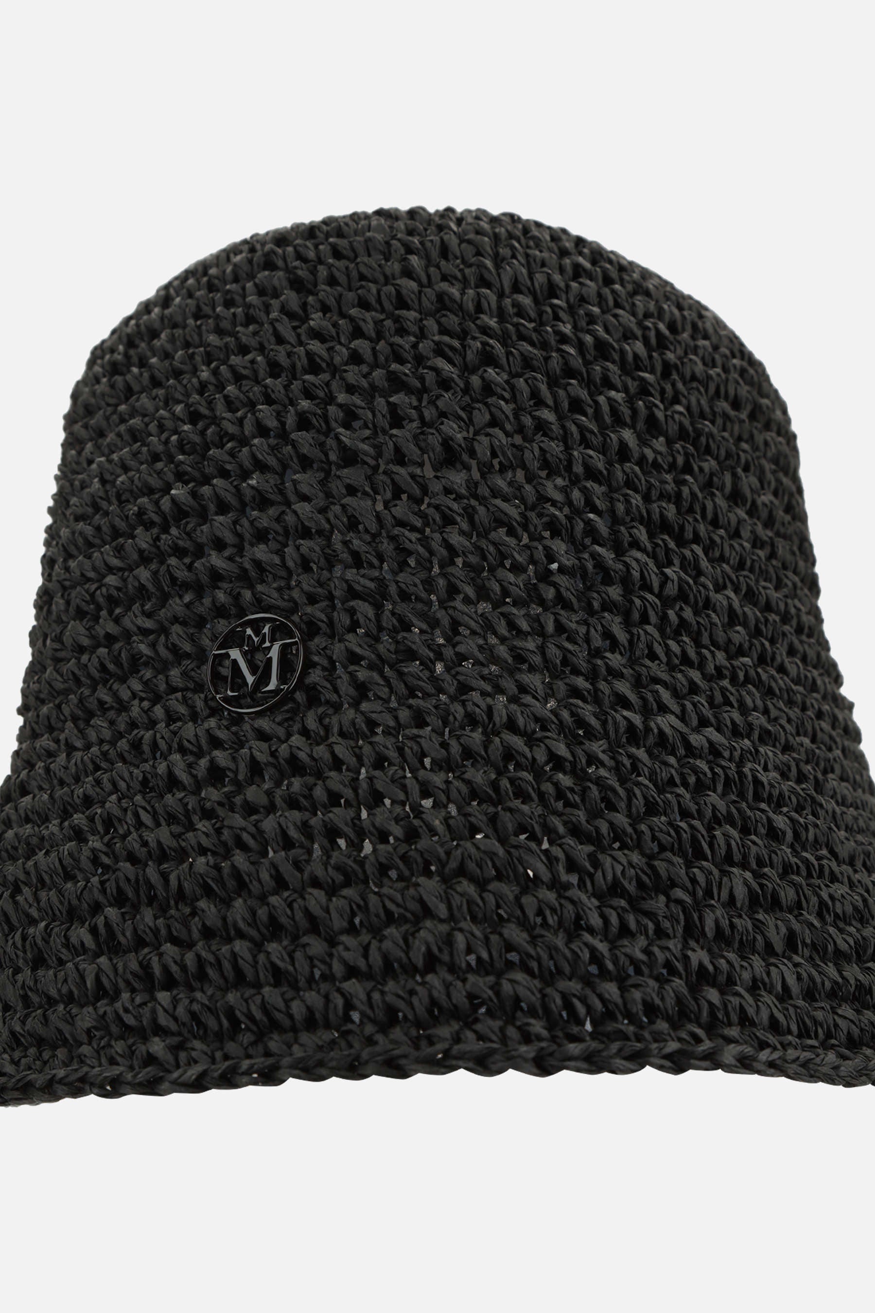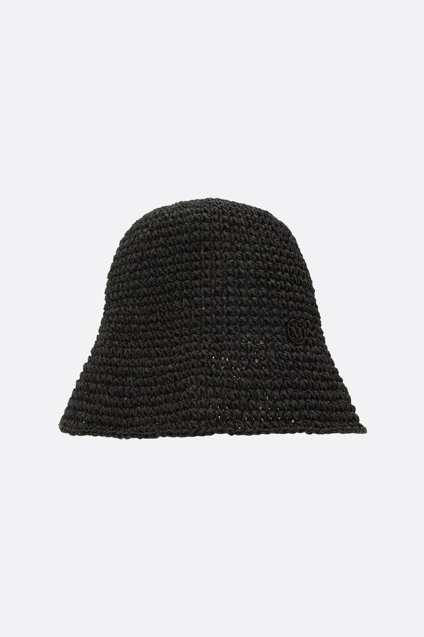 Maison Michel bucket hat crafted from black straw crochet, featuring an enamel metal logo.