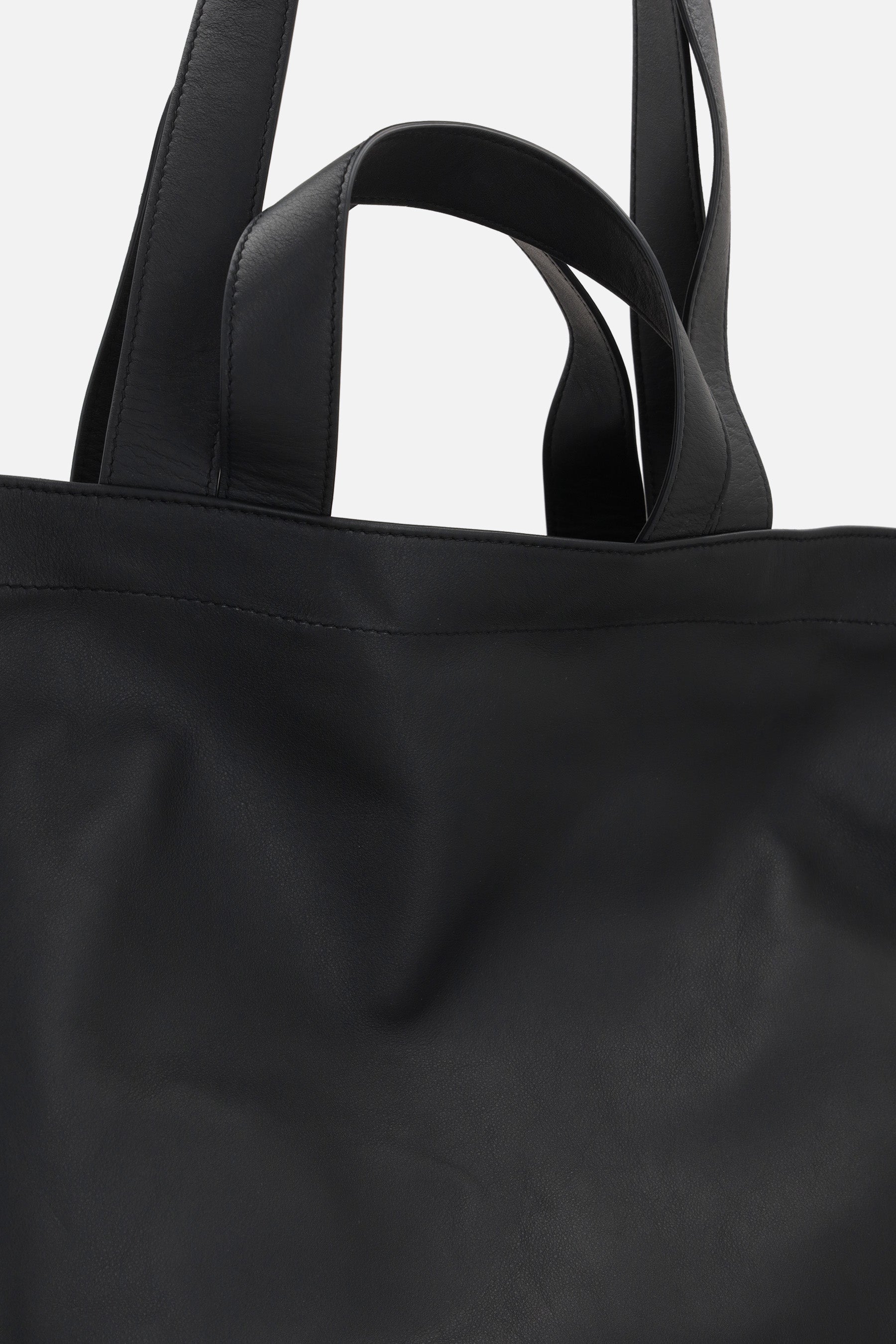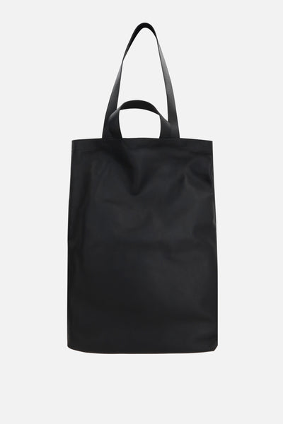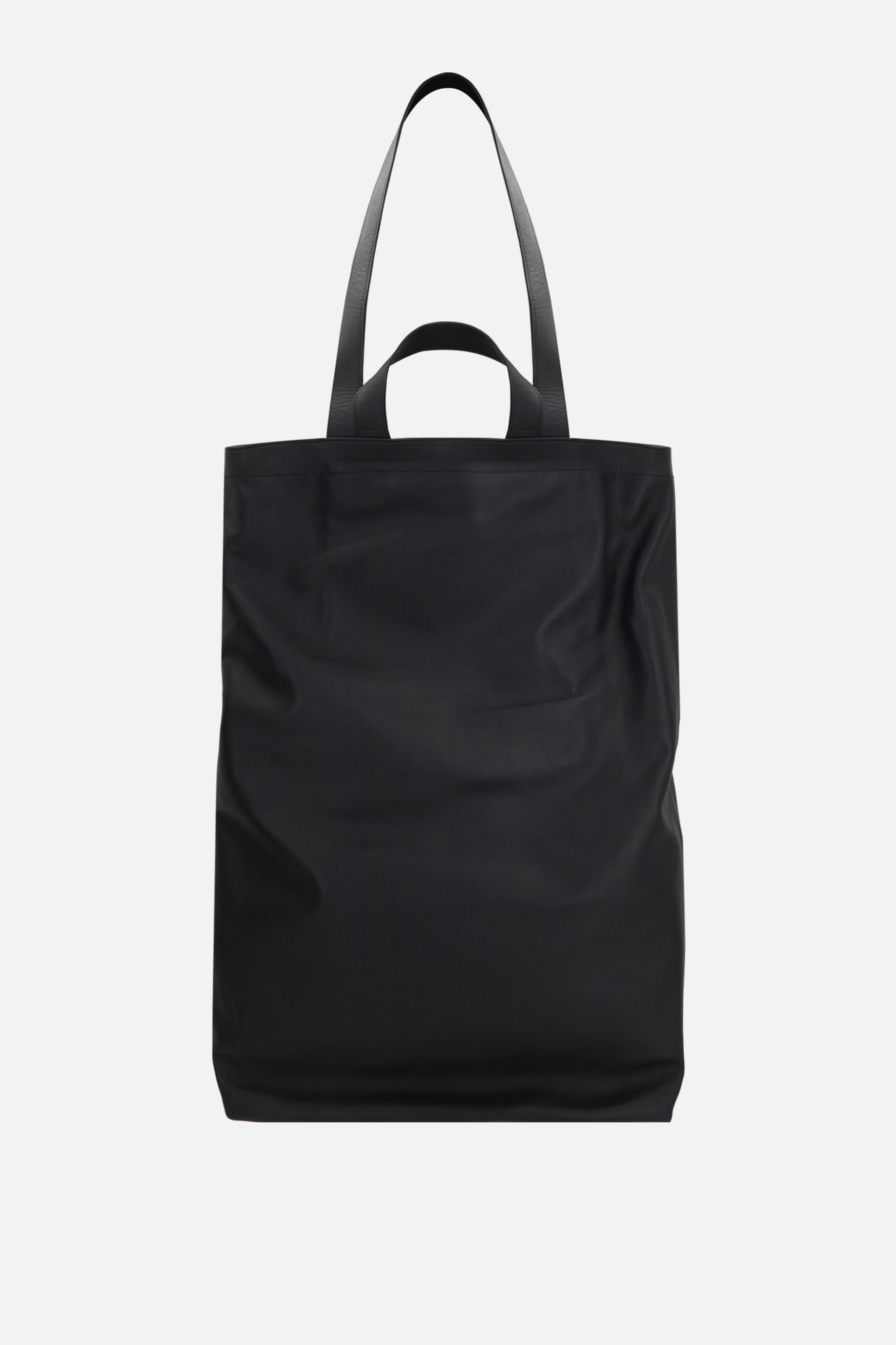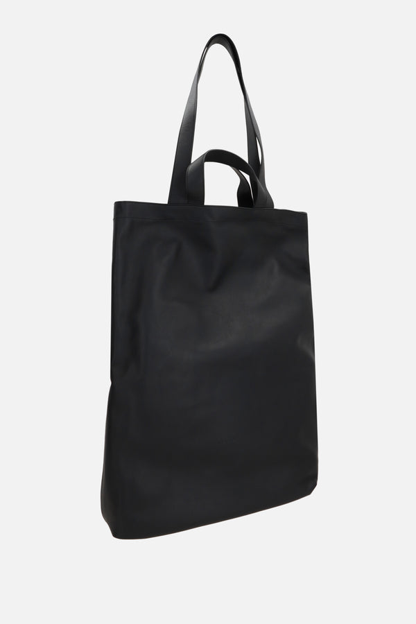 Marsèll shopping bag crafted from smooth black leather with embossed logo lettering. Featuring ruthenium-tone hardware, short handles, and long handles. The unlined interior includes a zip pocket.