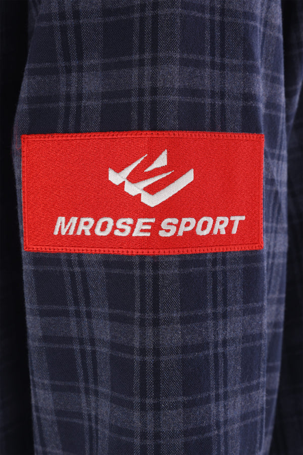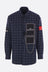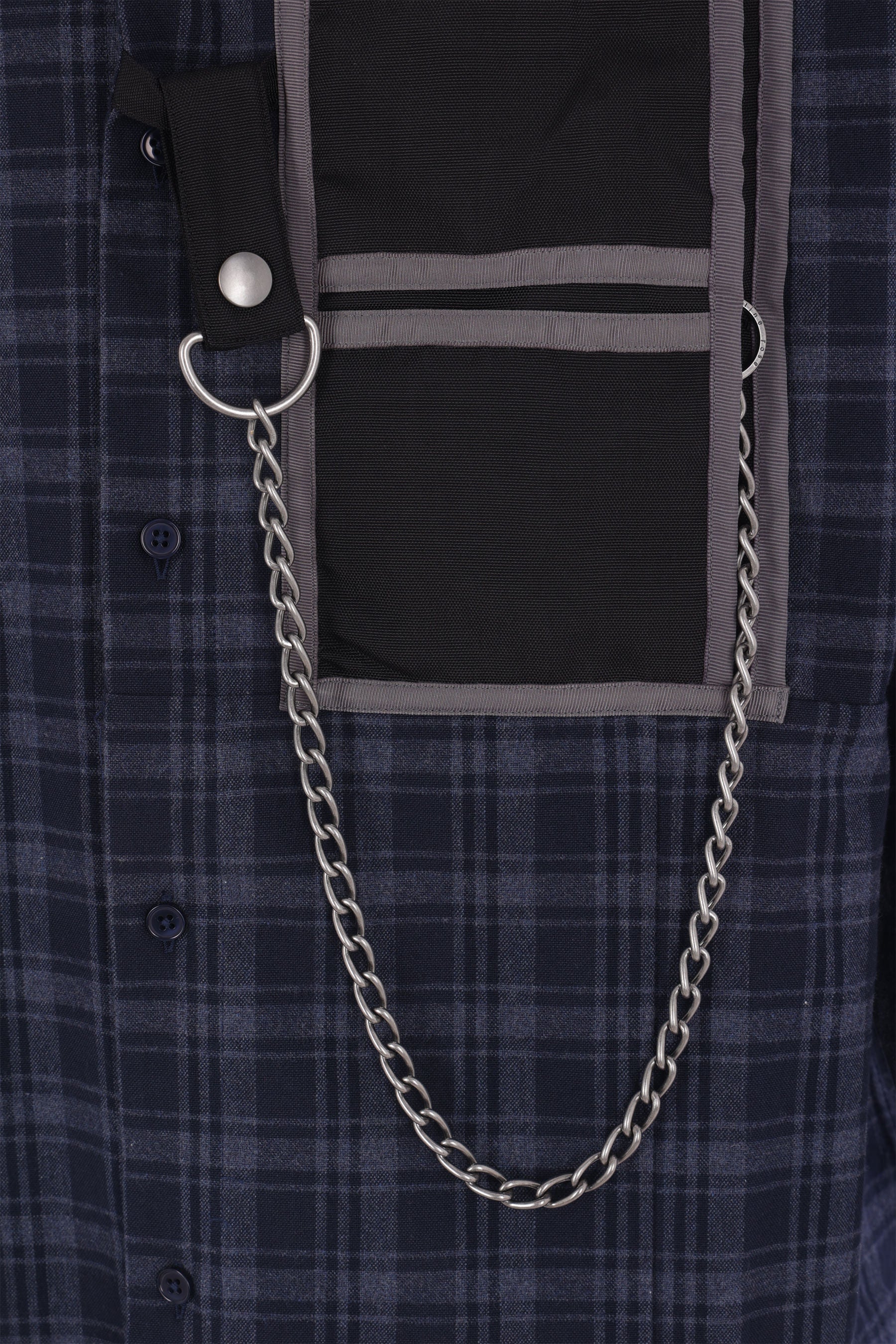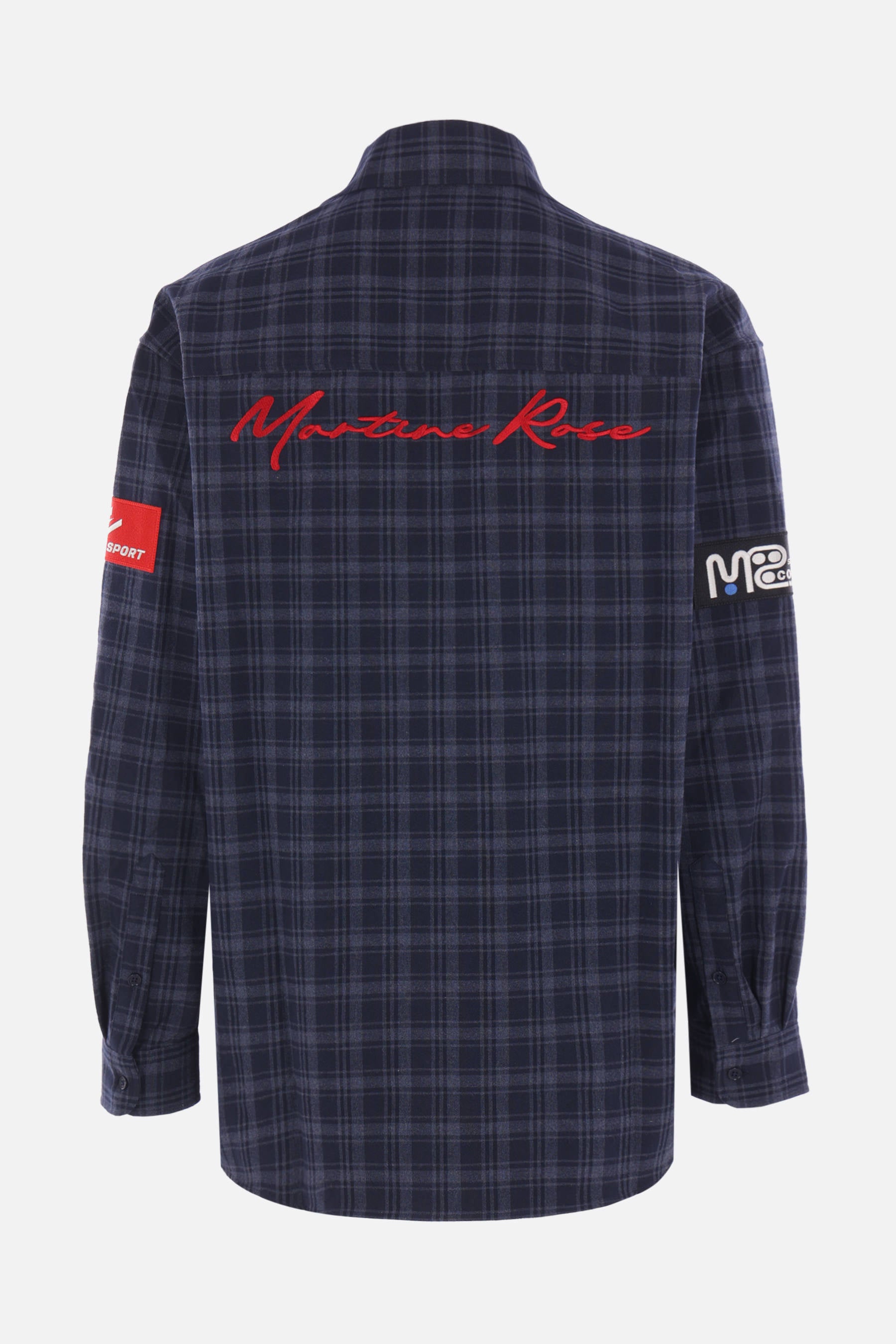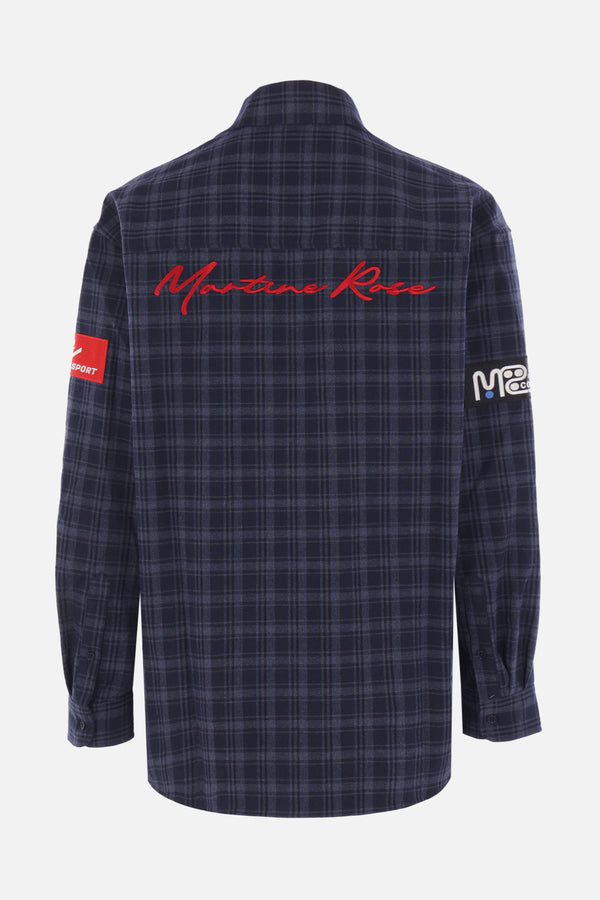 Martine Rose oversized shirt crafted from blue and grey check cotton flannel, featuring logo embroidery on the back and graphic patches on the sleeves. Featuring a classic collar, front button closure, long sleeves with buttoned cuffs, and a rounded hem. The design is completed with a front-attached nylon wallet with chain.