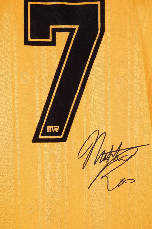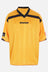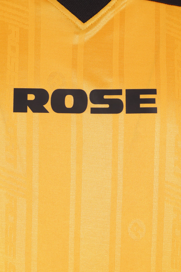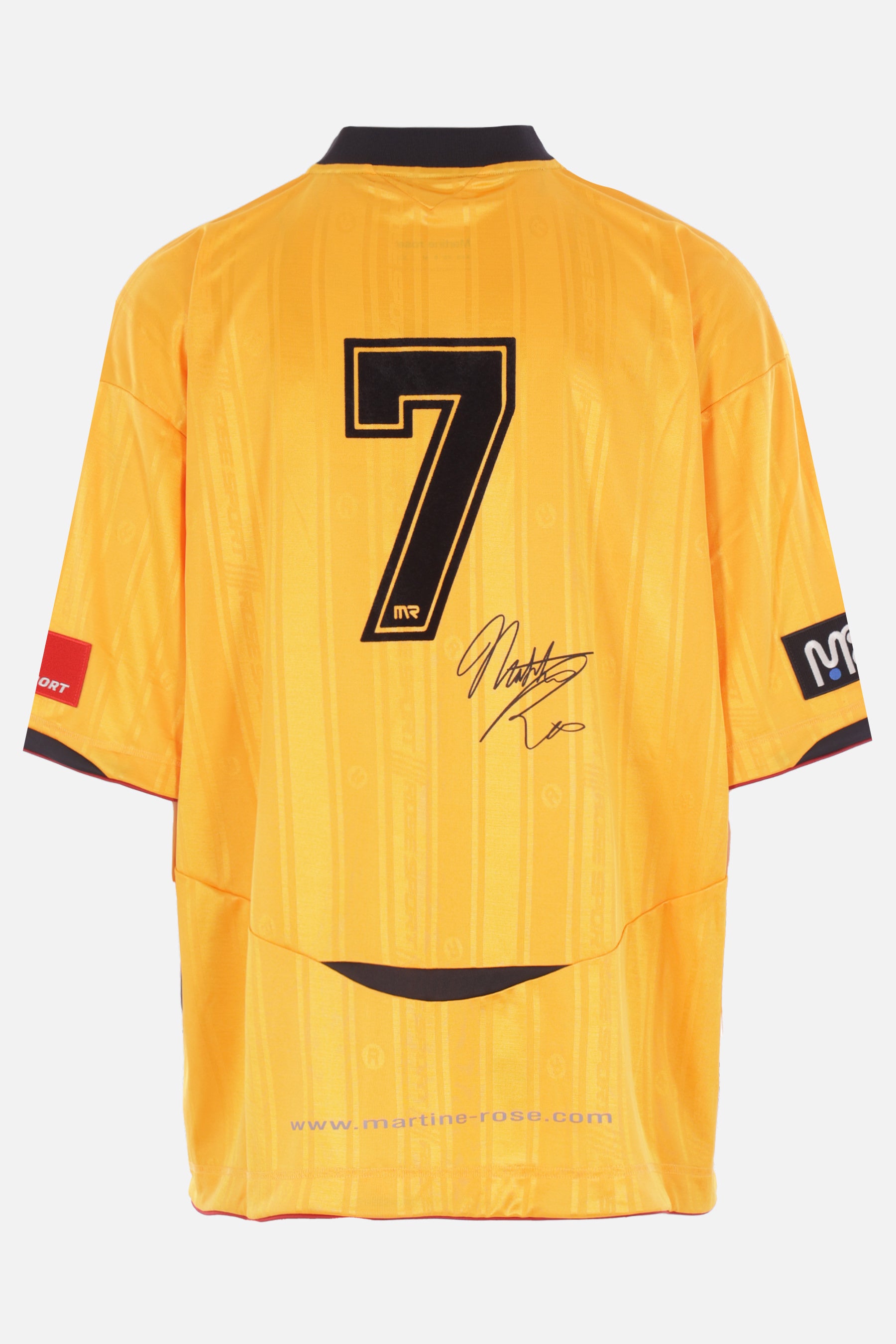 Martine Rose t-shirt made of dark yellow technical jersey with jacquard logo stripe pattern and all-over football-style prints. Featuring a V-neckline, short sleeves, and a straight hem.