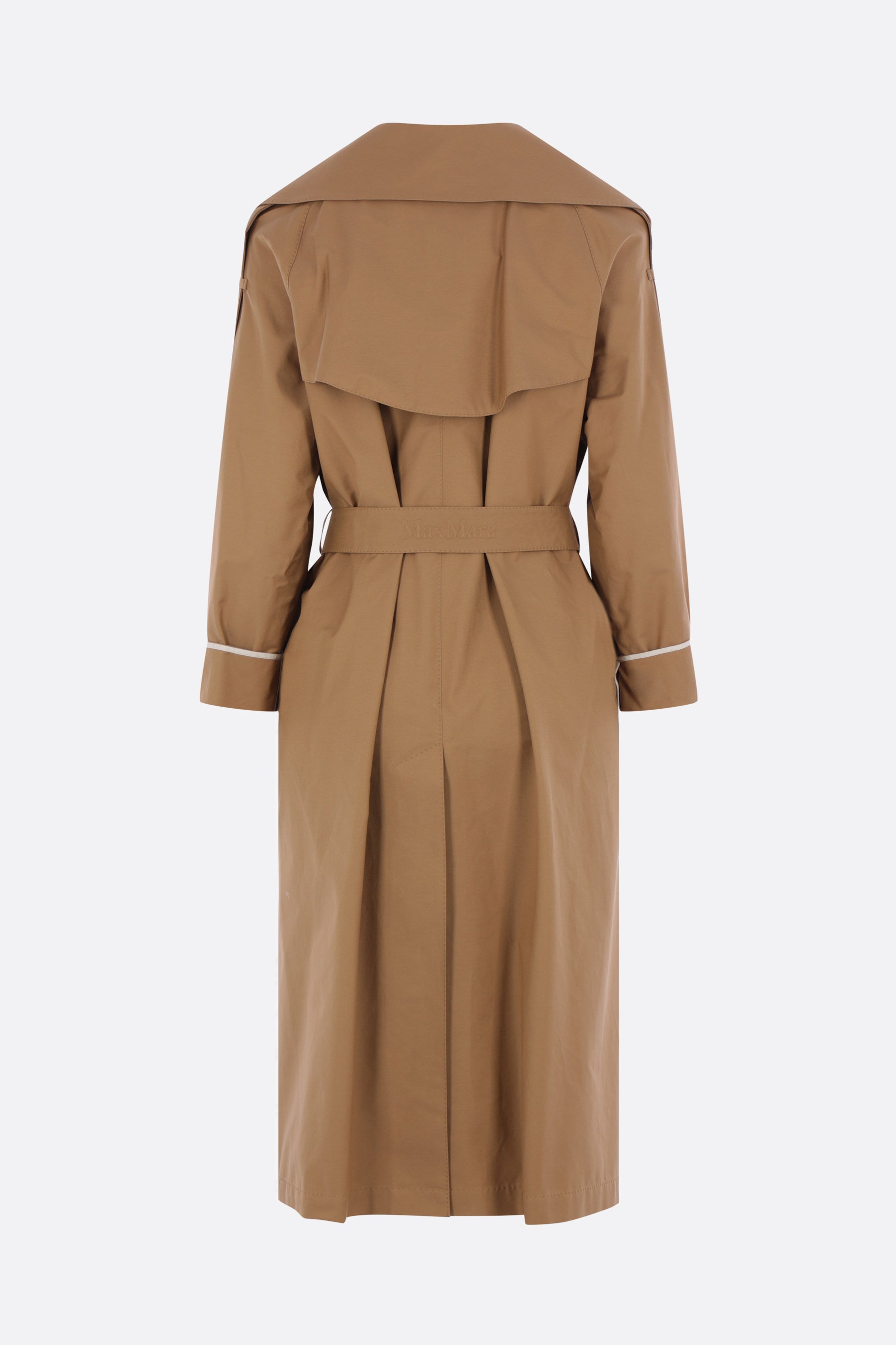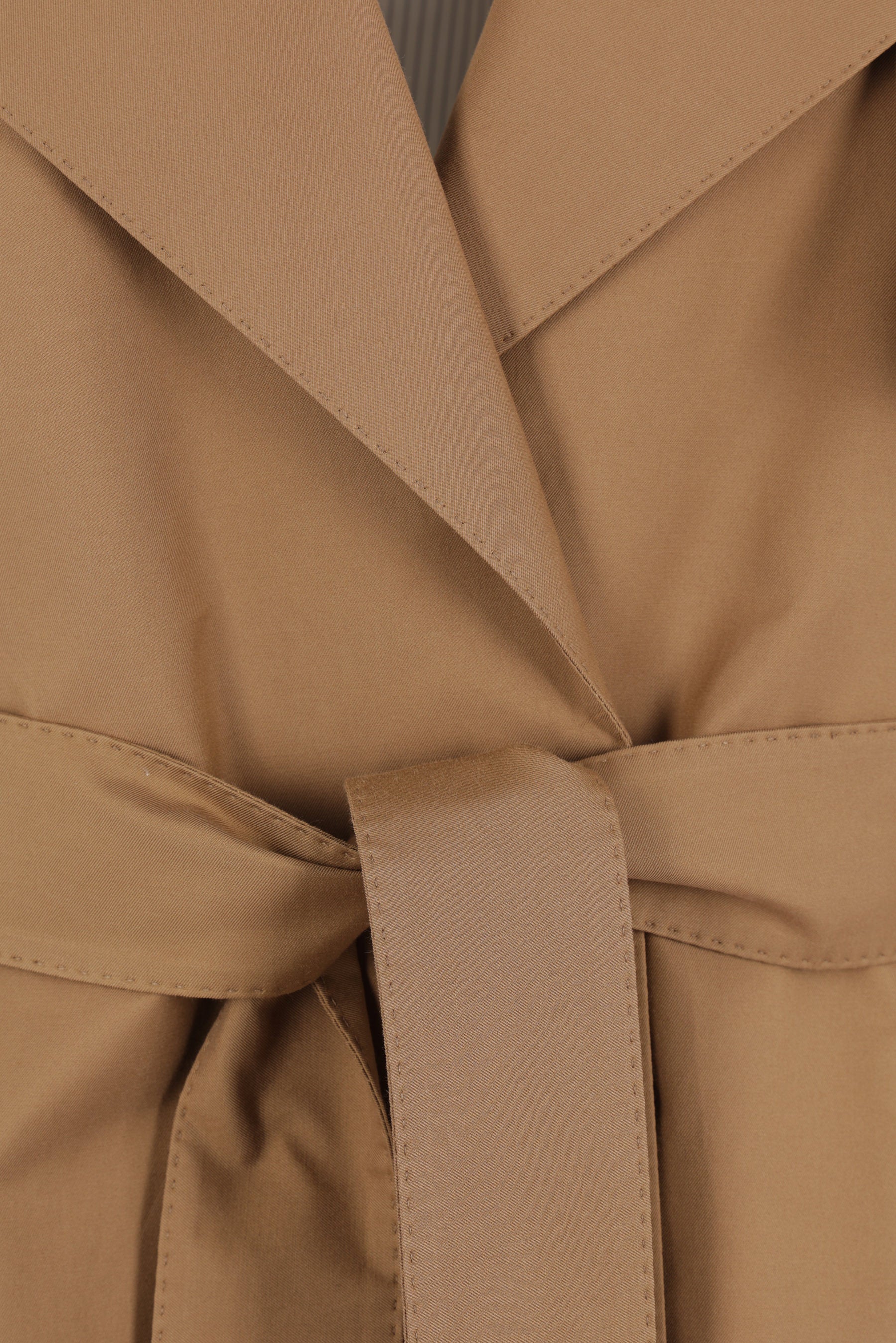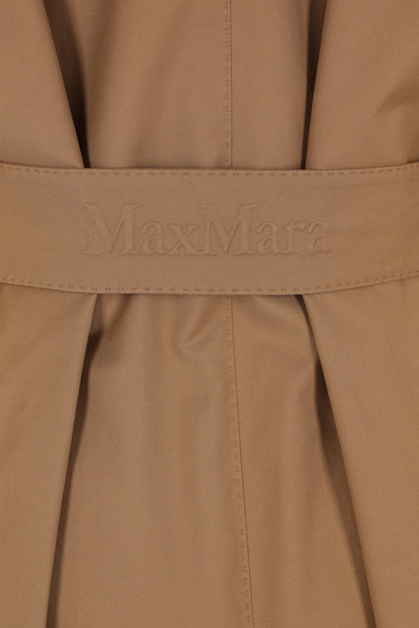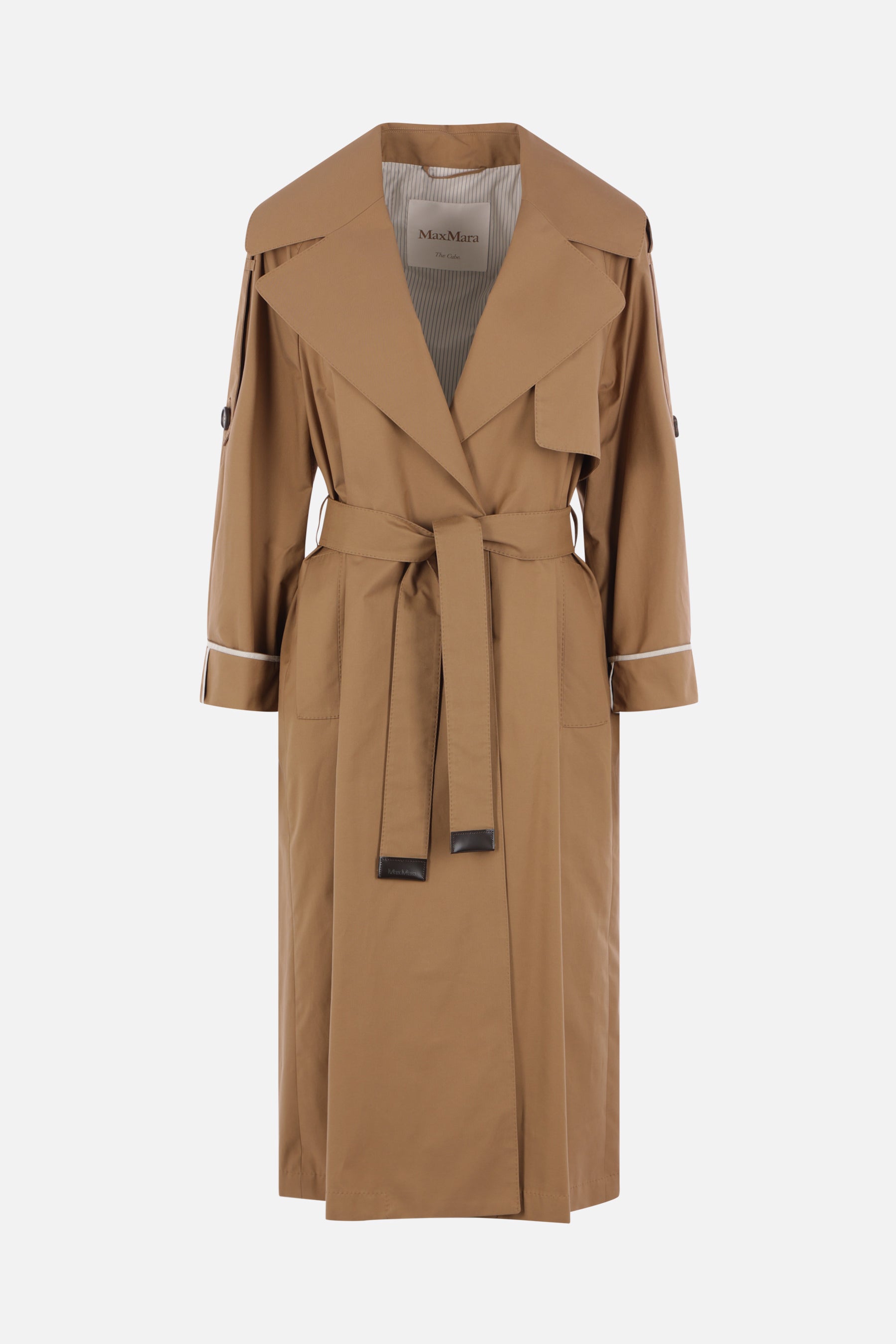 Max Mara The Cube wrap trench coat crafted in brown cotton-blend twill. Featuring wide lapels, a matching belt, welt pockets, raglan sleeves with stitched cuffs and shoulder epaulettes, a storm flap, a central back vent, and a partially lined interior.